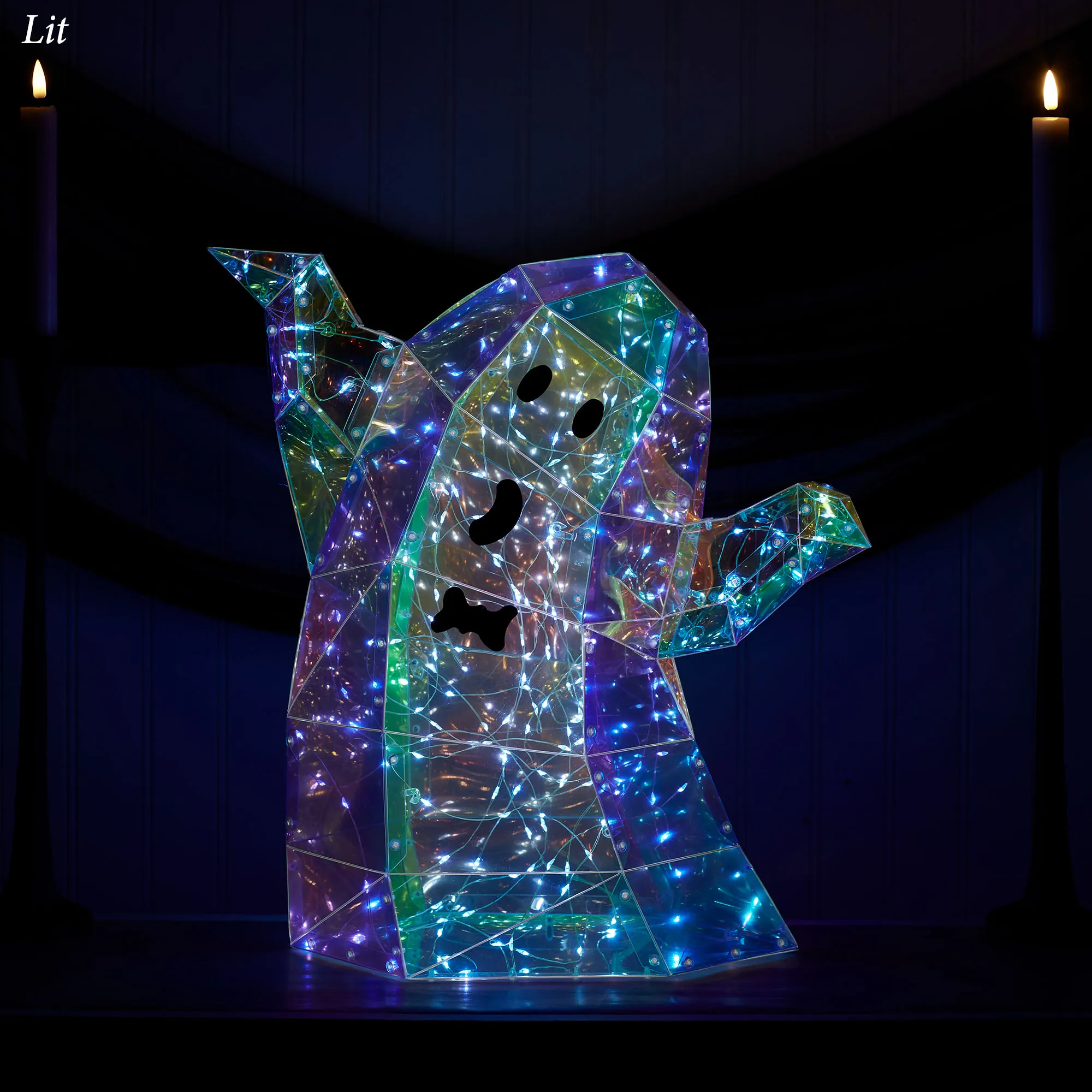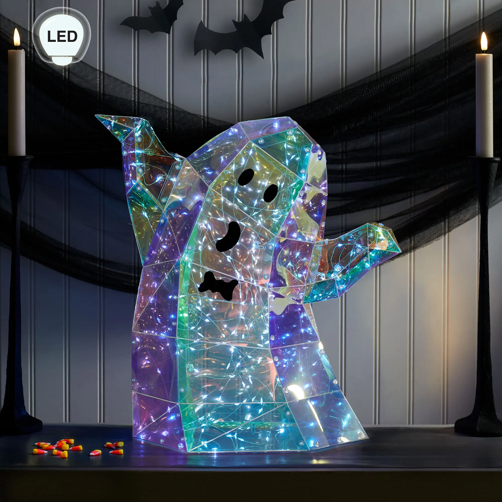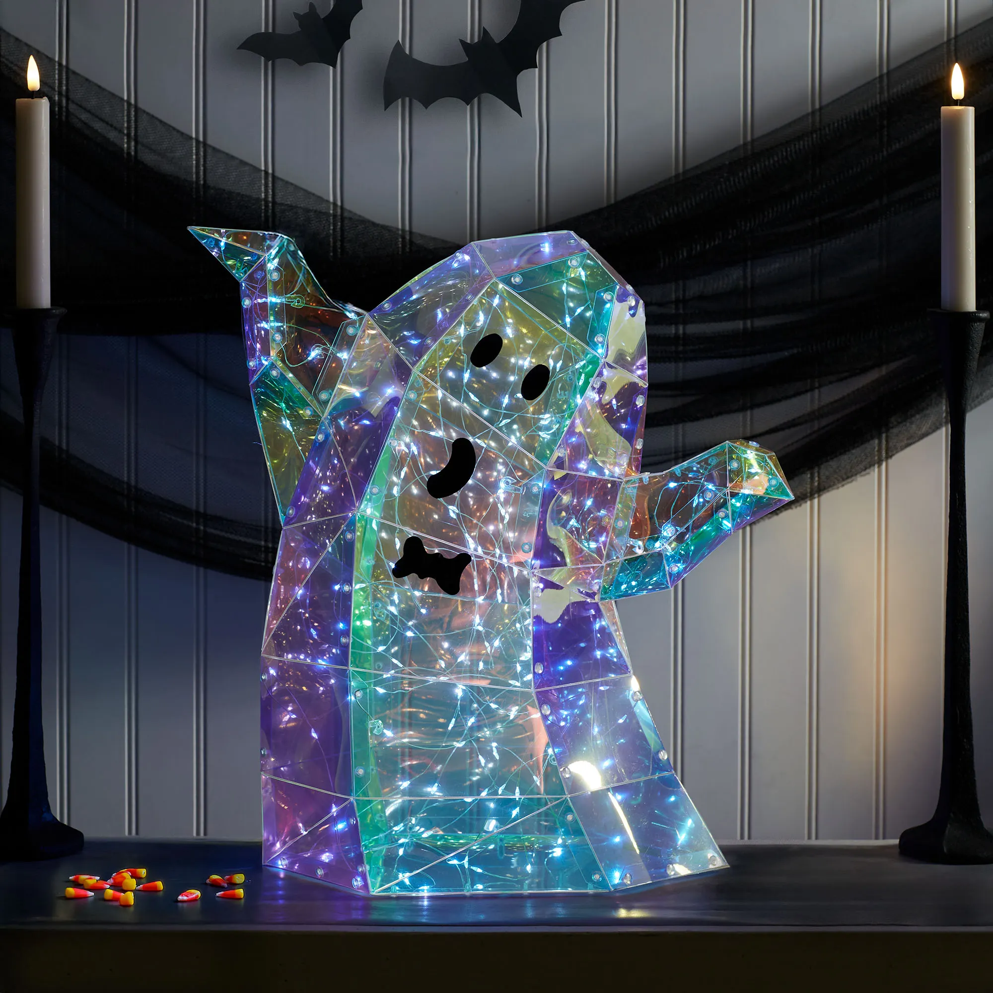 The Ghost Hologram Halloween Tabletop Accent is ready to join in on some spooky festivity. With a faceted shape, the molded polymer ghost features a clear iridescent hue, raised arms, and a black face and bow tie. Charming LED lights shimmer inside, creating mesmerizing reflections and iridescent effects. A steady light option is also available. Requires the included USB cord and adapter and operates via the included 10-function remote; the remote includes one battery. The on/off button is on the USB cord. Indoor use only. Measures 15"Wx7"Dx16"H.