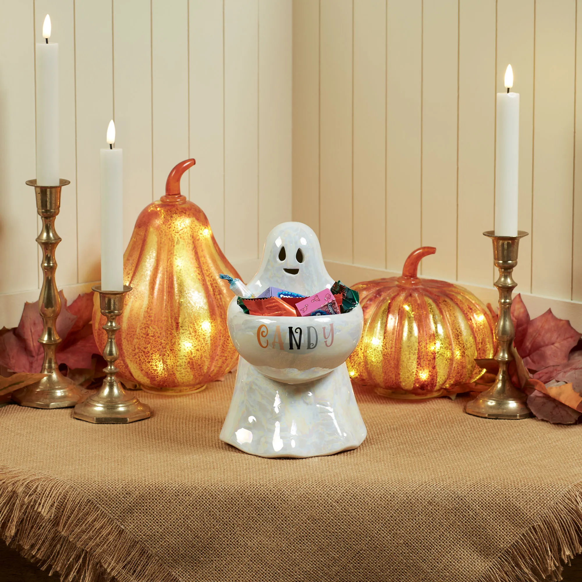 No one will be afraid to grab a piece of candy from this adorable, lighted Ghost. This ceramic Halloween candy dish has a white iridescent finish, and its ghostly arms create a 4"Wx3"Dx3"H bowl for the candy. The word "CANDY" is written in Halloween colors. The LED light inside the ghost requires three AA batteries, not included; the on/off switch is located on the bottom. Overall, measures 5.5"Wx7"Dx8"H. Food safe. Hand wash.