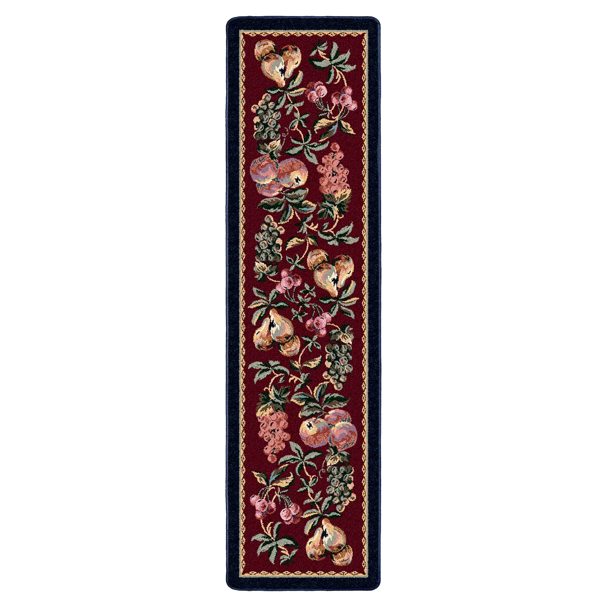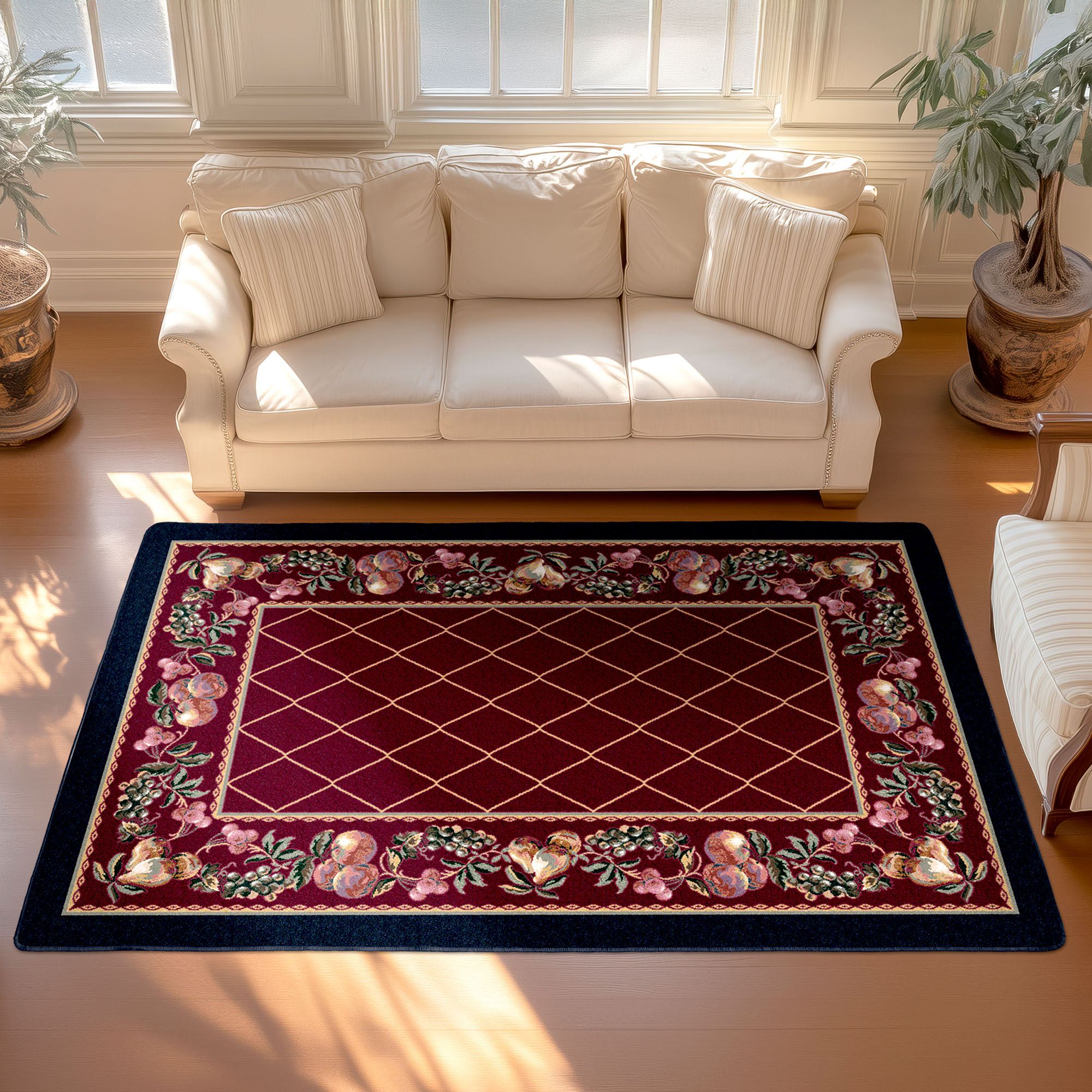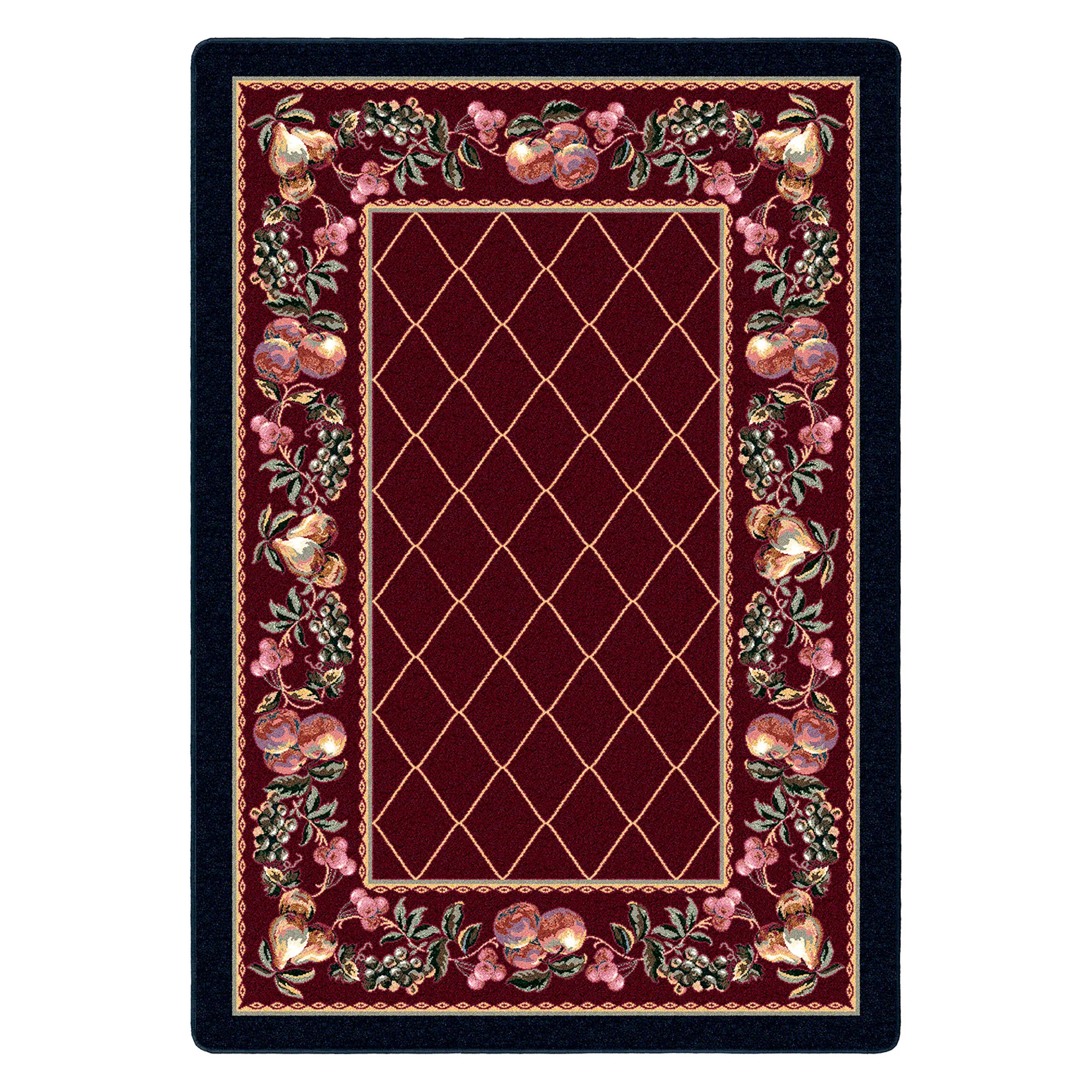 Fruits with leafy vines are ready for harvest on the Giana Rug. This power-loomed nylon area rug, .375" thick, features a central lattice pattern and summer fruit and vine designs on merlot, along with a solid midnight outer border. Colors include shades of merlot, midnight, dark green, burgundy, tan, beige, ivory, mulberry, brown, and sage. The warp-resistant rug is kid- and pet-friendly and has StainSmart(R) technology that offers protection from water-based spills. The Endura-Loc(TM) backing is polypropylene/polyester/silicone. Please note: The rug runner does not have the lattice pattern. We recommend professional cleaning by a rug cleaner.