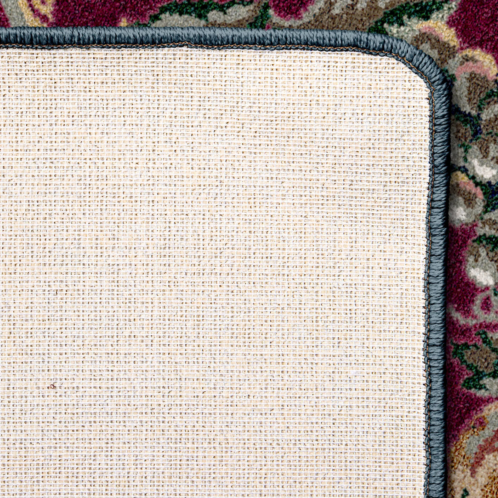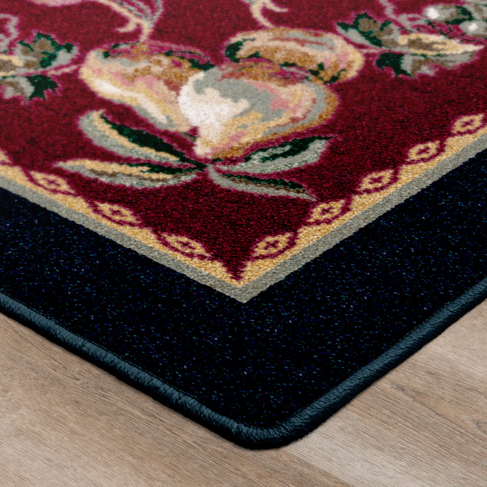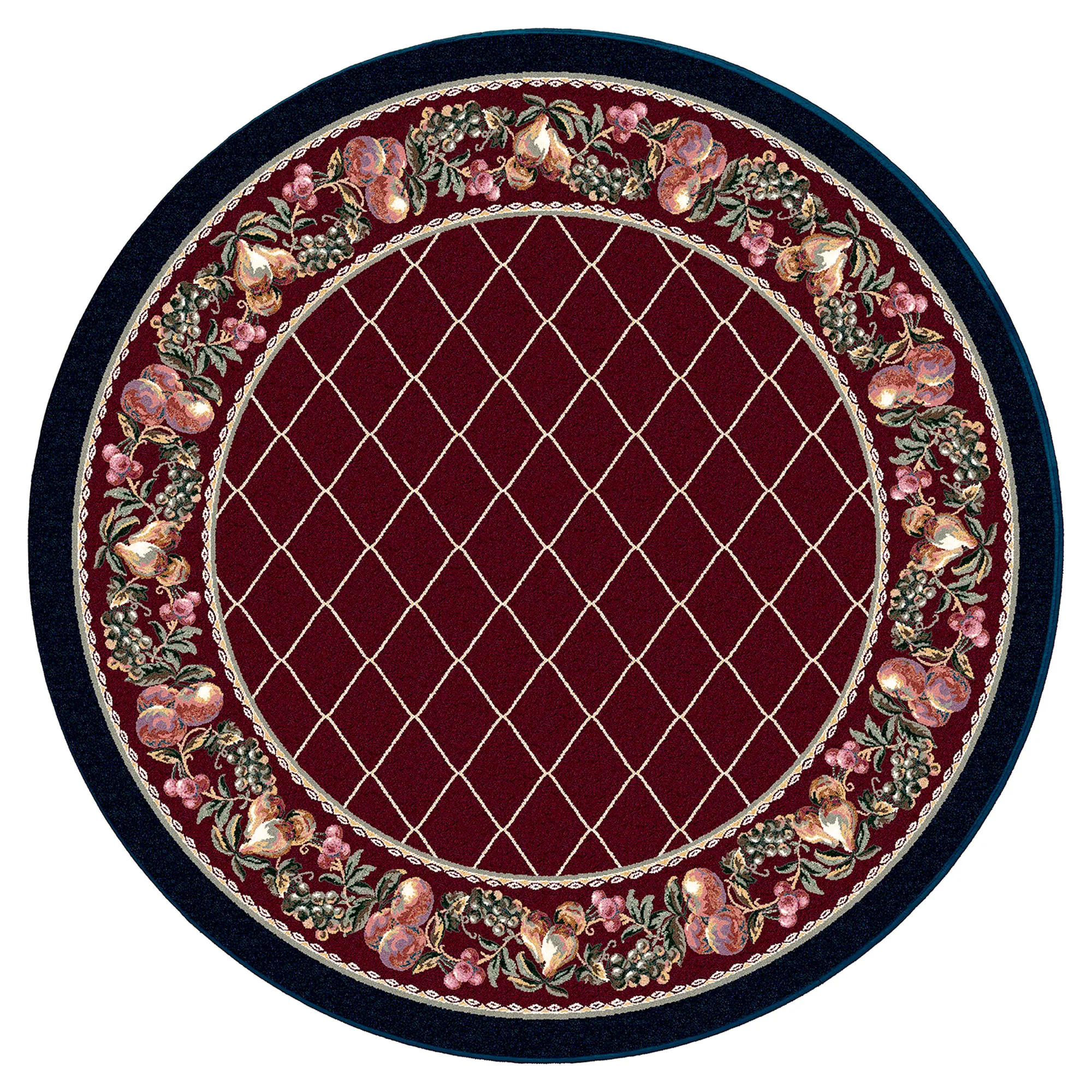 Fruits with leafy vines are ready for harvest on the Giana Rug. This power-loomed nylon area rug, .375" thick, features a central lattice pattern and summer fruit and vine designs on merlot, along with a solid midnight outer border. Colors include shades of merlot, midnight, dark green, burgundy, tan, beige, ivory, mulberry, brown, and sage. The warp-resistant rug is kid- and pet-friendly and has StainSmart(R) technology that offers protection from water-based spills. The Endura-Loc(TM) backing is polypropylene/polyester/silicone. Please note: The rug runner does not have the lattice pattern. We recommend professional cleaning by a rug cleaner.