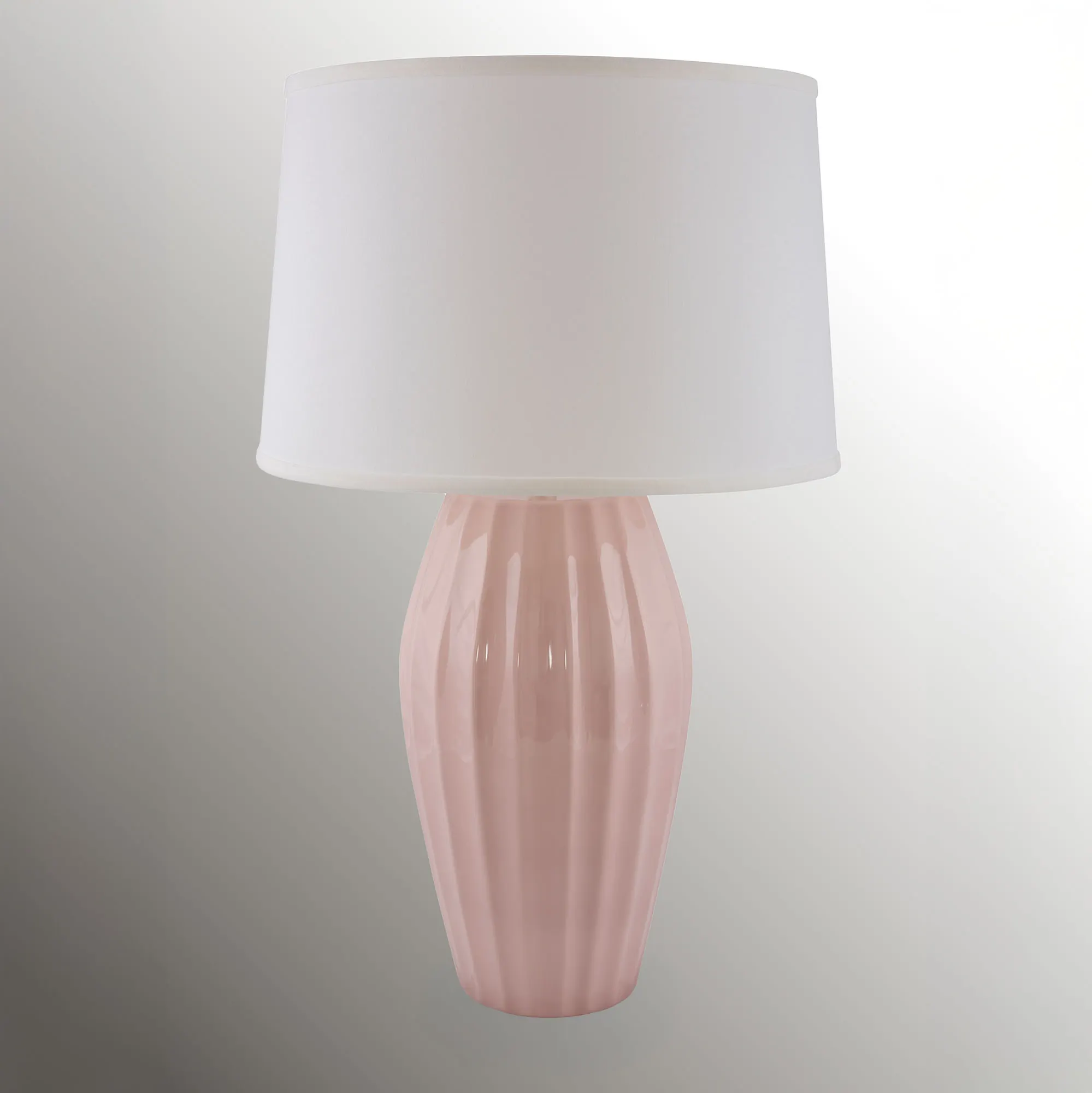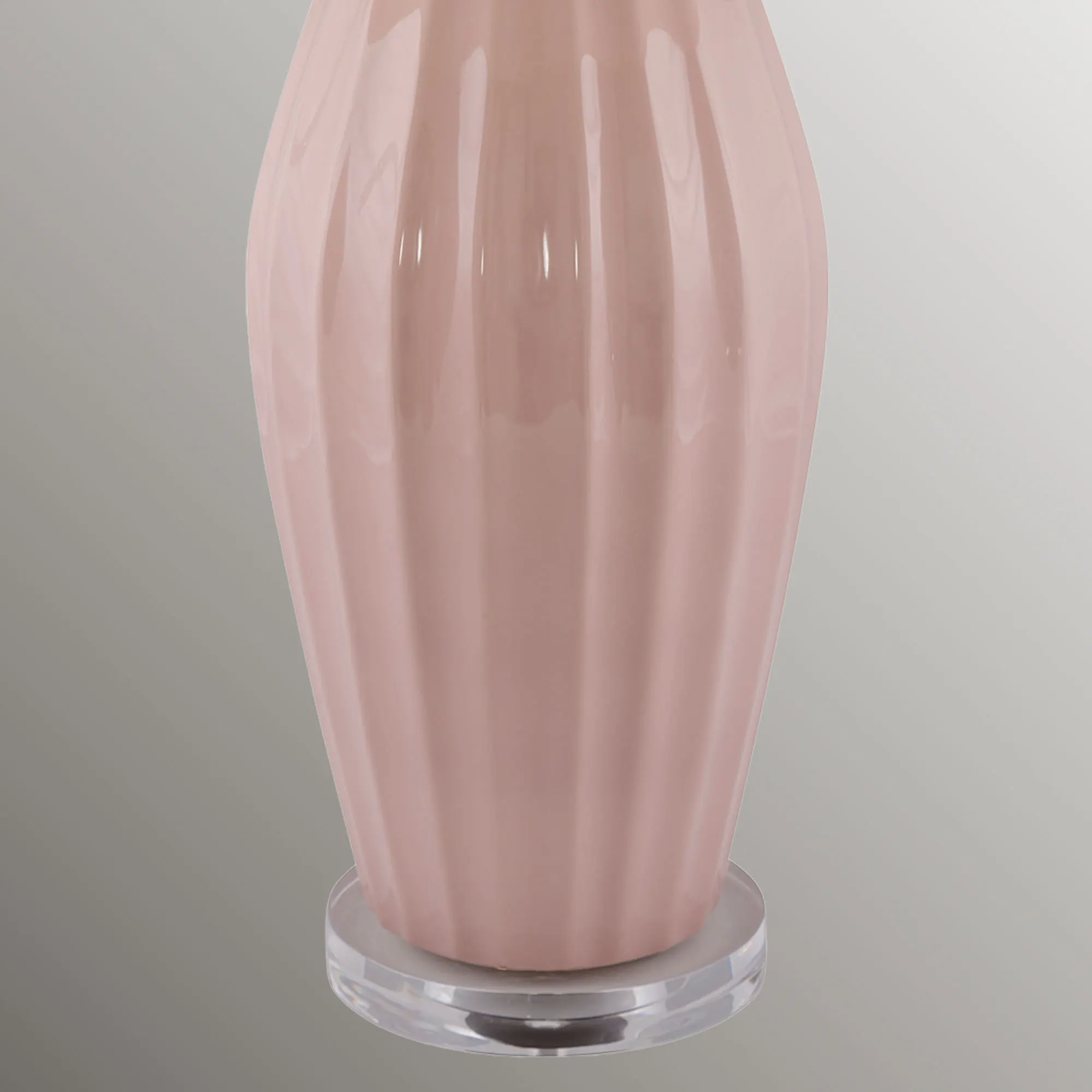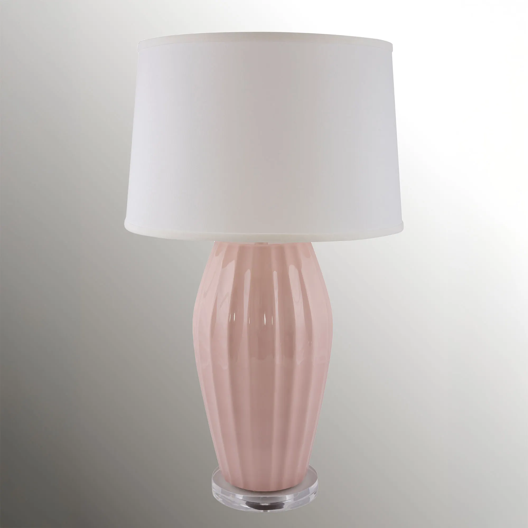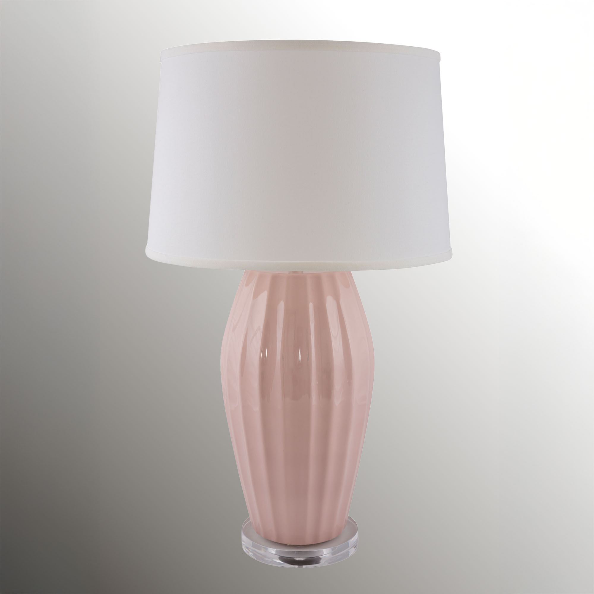 Enjoy the elegant and classy look of the Giavanna Ribbed Table Lamp. Handcrafted from local ceramic clay, this hand-finished table lamp is a soft, pastel color and has a fluted design. The fabric shade is white. UL listed. Requires one 100W max. bulb, not included. An optional clear acrylic mounting base adds sophistication. Overall, the table lamp measures 17"dia.x29"H, with base.