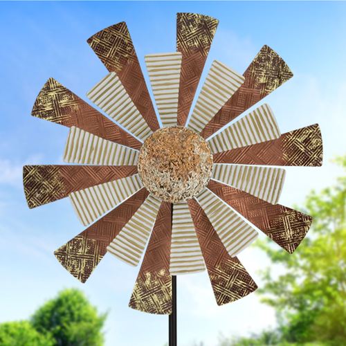 Resembling a rustic windmill, the durable Gibson Wind Spinner spins in opposite directions when gentle breezes blow. Made of metal, this double wind spinner is weather- and fade-resistant and has two sets of blades with copper-gold, gold, and whitewash finishes. The center has a highly textured silver and gold finish. Place into the ground using the sturdy five-prong ground stake. Outdoor year-round use. Measures 26"Wx9"Dx78"H.