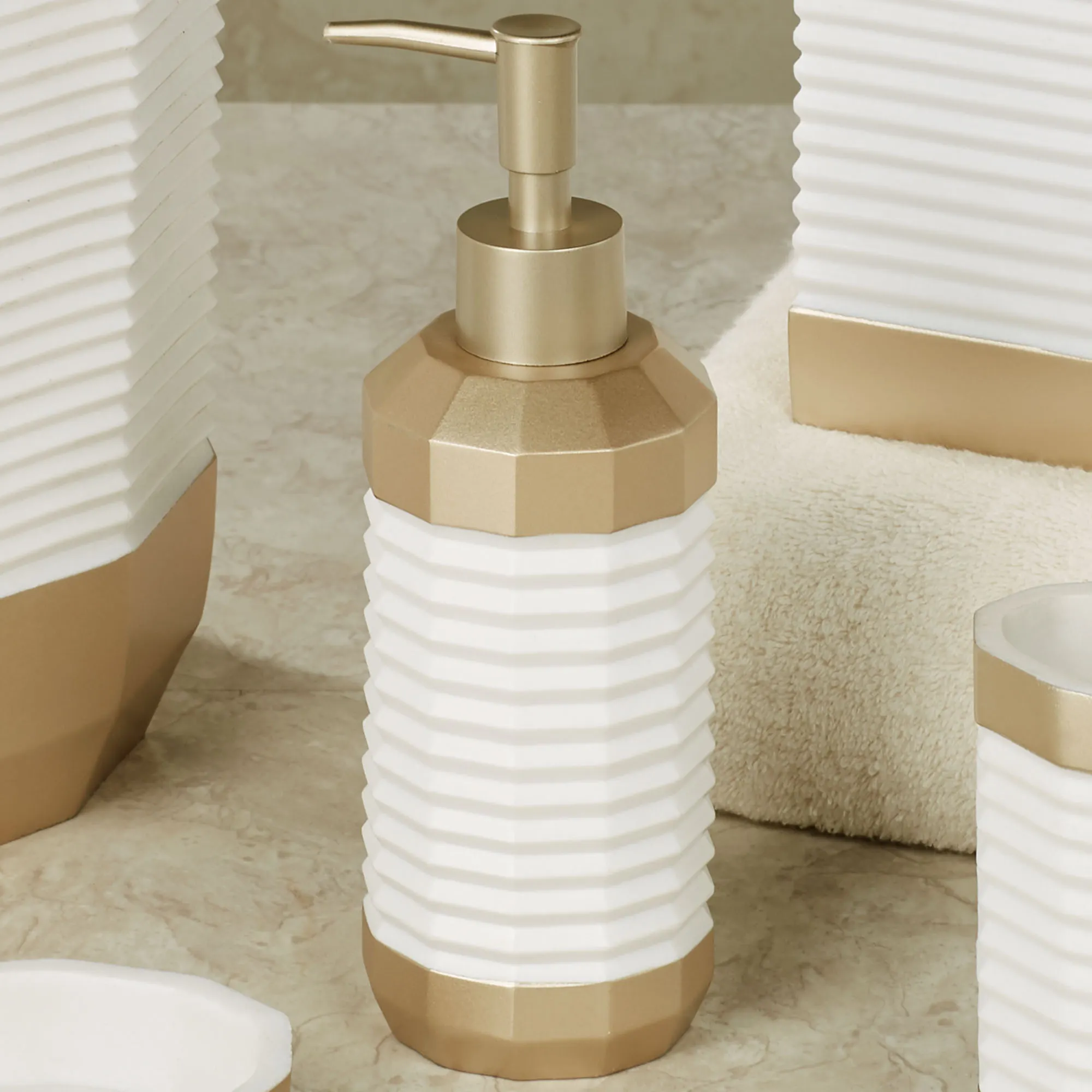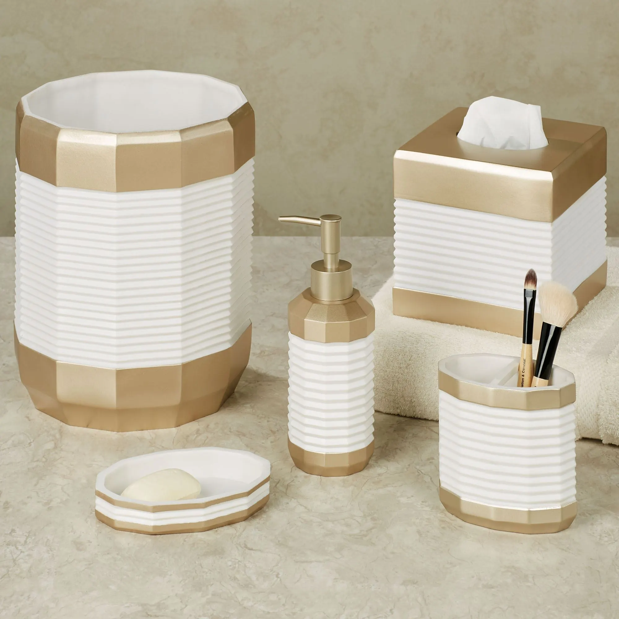 Crisp, clean lines define the Gigi Bath Accessories. Handpainted with lovely antique gold, each resin bath accessory features a faceted design with an ivory ribbed center. The Brush Holder can be used to hold your toothbrushes or makeup brushes. Specify Brush Holder or Soap Dish. Sorry, the rest of the accessories are no longer available.