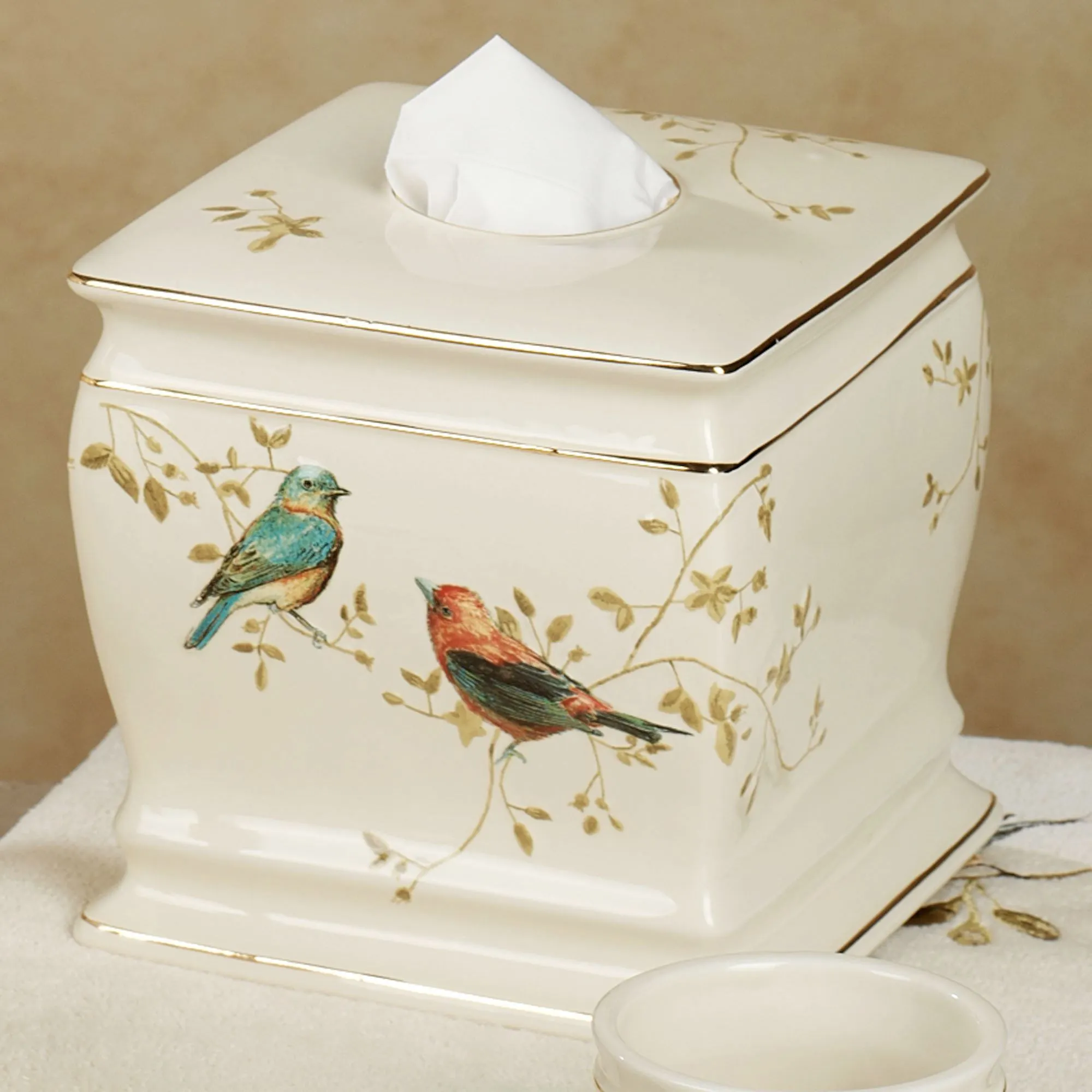 The Gilded Bird Ceramic Bath Accessories are a pleasant addition to any bathroom or dressing area. Each ivory bath accessory has a beautiful bird perched on a leafy branch. Ceramic bath accessories have a raised decal motif and elegant gold trim accents. Specify Lotion/Soap Dispenser, Wastebasket, Toothbrush Holder, Soap Dish, Tissue Cover, or Tumbler. Hand wash.