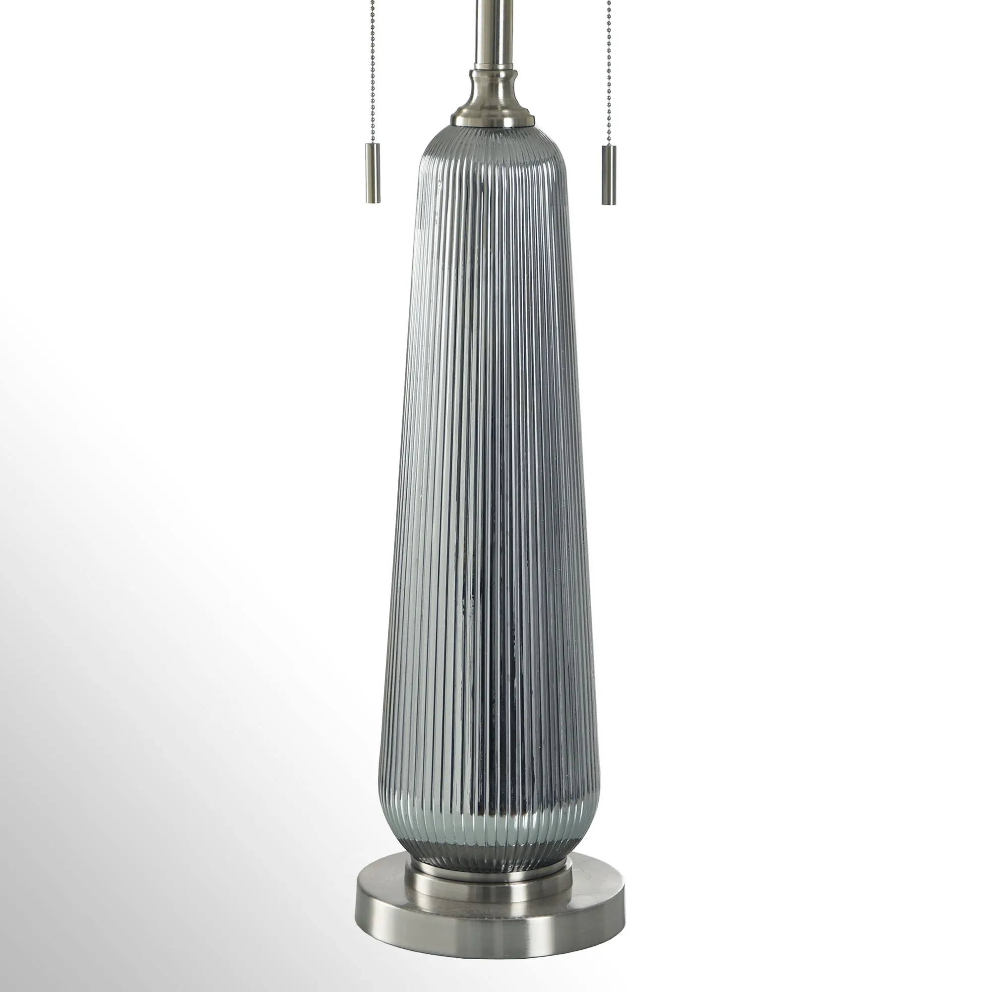 A ribbed texture adds intrigue to the sleek, modern appeal of the Gillian Table Lamp. With a neutral, monochromatic feel, the lamp features a brushed nickel round metal base, silver ribbed glass font, off-white linen hardback shade, and 1.75"H matching silver finial. UL listed. Requires two 60W max. bulbs that operate via the double pull-chain illumination. Overall, the table lamp measures 16.5"dia.x36.5"H.