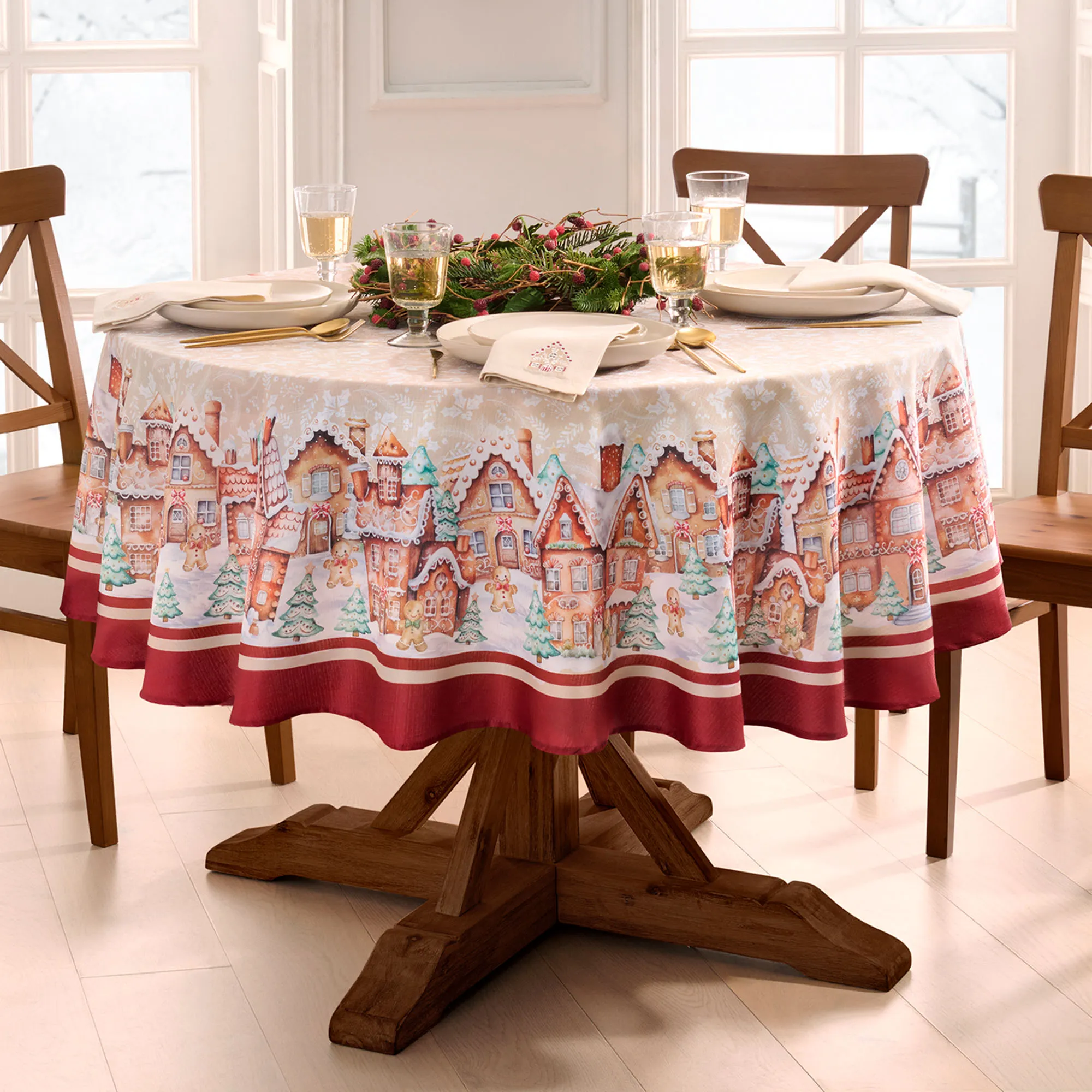 Gingerbread Lane Christmas Holiday Round Tablecloth and Table Linens