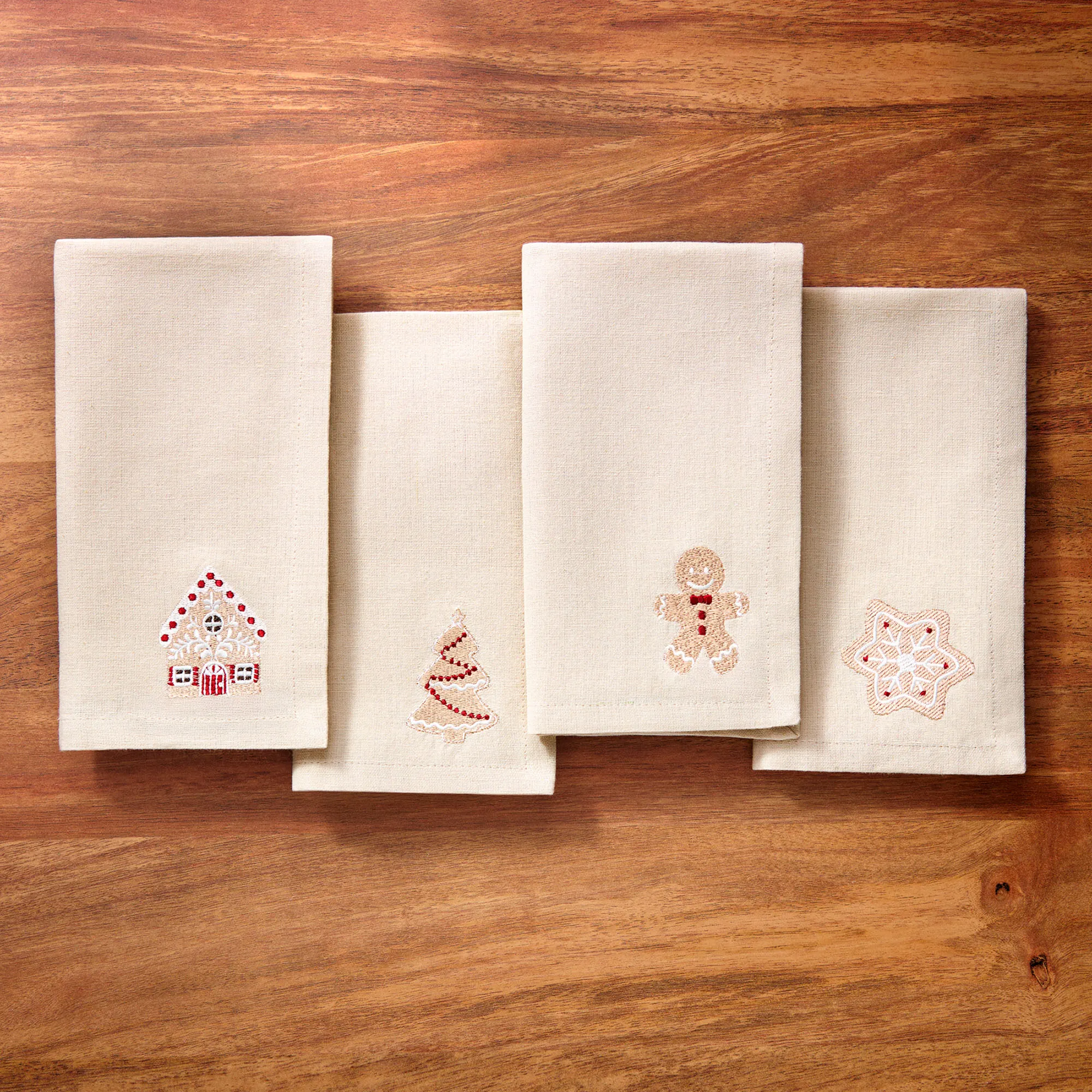 • Napkins have embroidered gingerbread designs on beige
