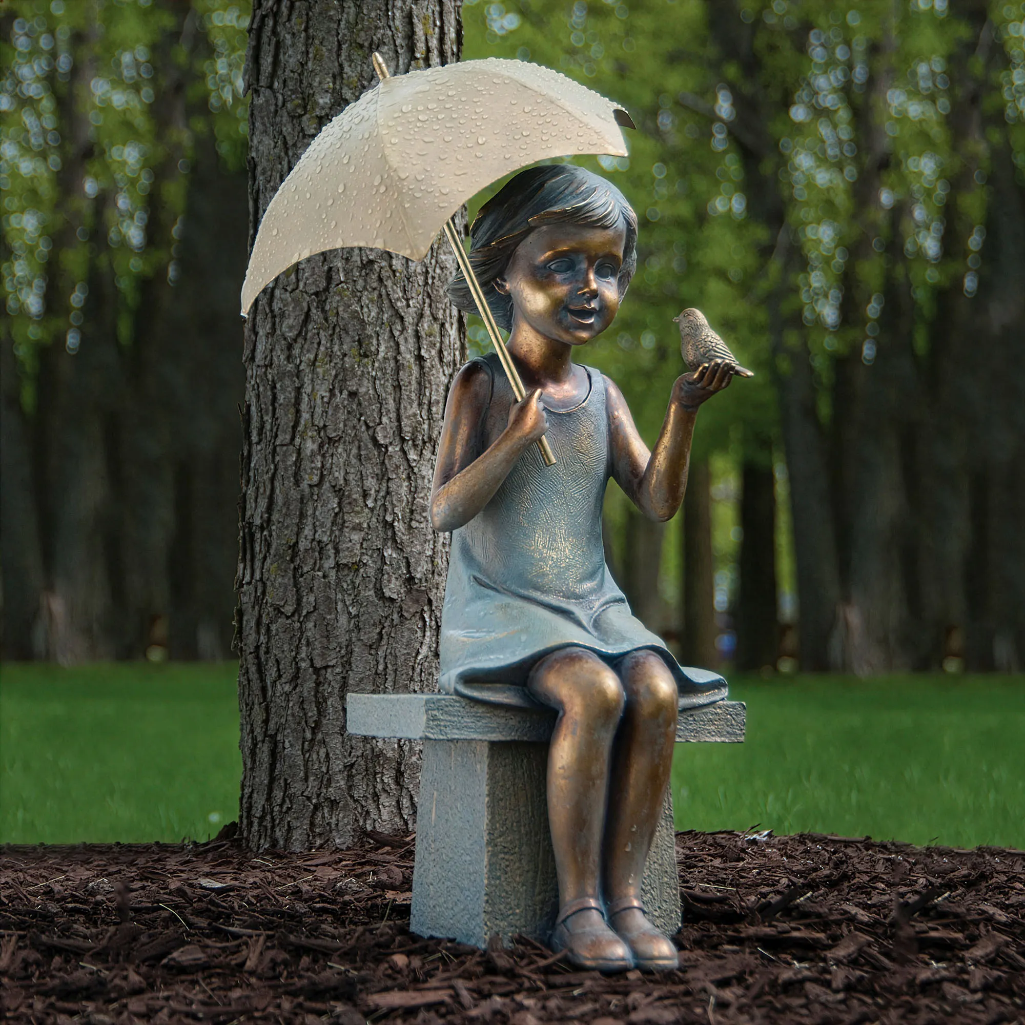 Girl on Bench with Bird and Umbrella Outdoor Garden Sculpture by Roman