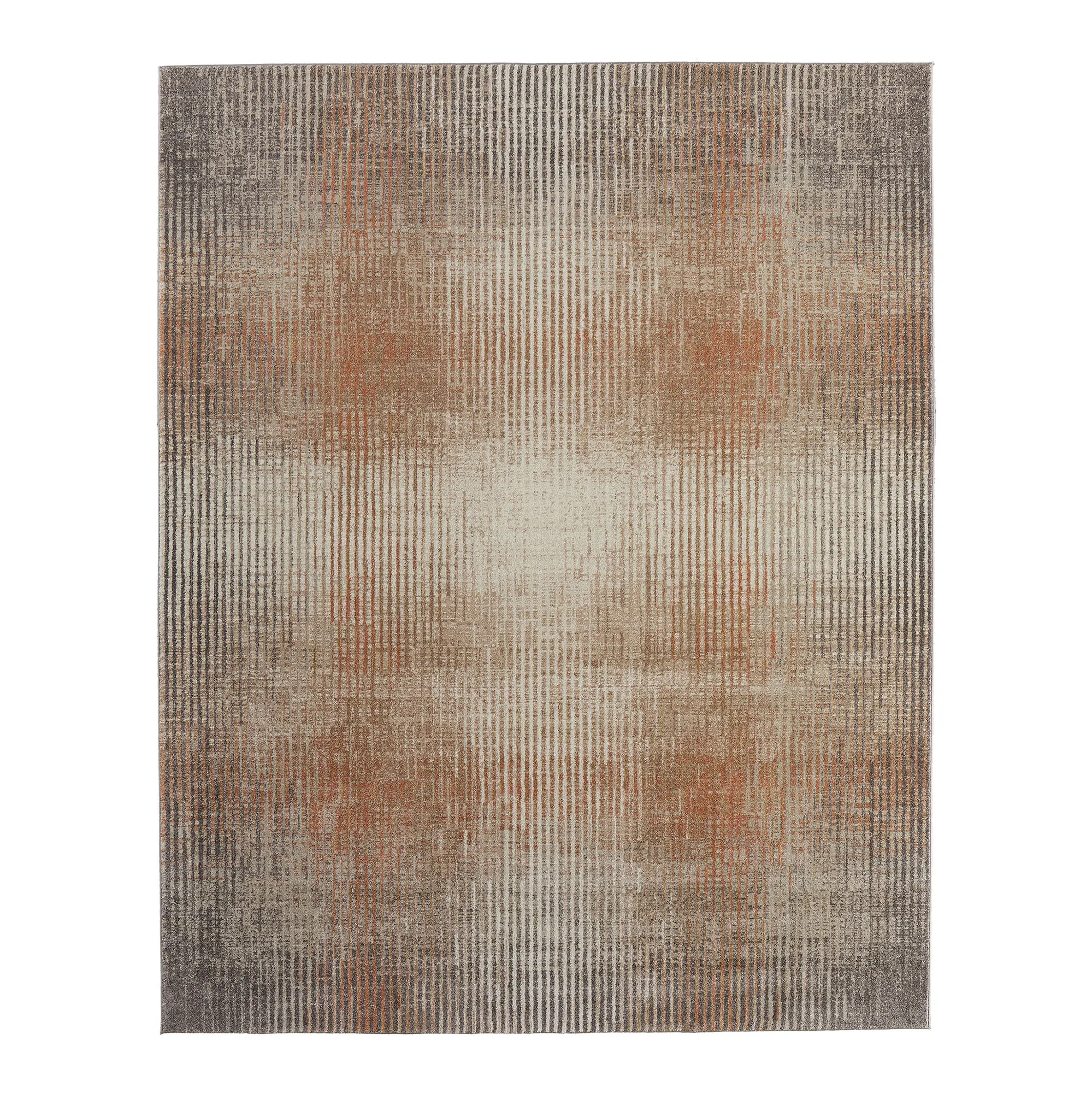 The illusion of stripes is abstractly displayed on the Giselle Rug. This power-loomed polypropylene area rug, .47" thick, has serged edges and includes shades of ivory, beige, charcoal, taupe, rust, gray, and brown. We recommend professional cleaning by a rug cleaner. Imported.