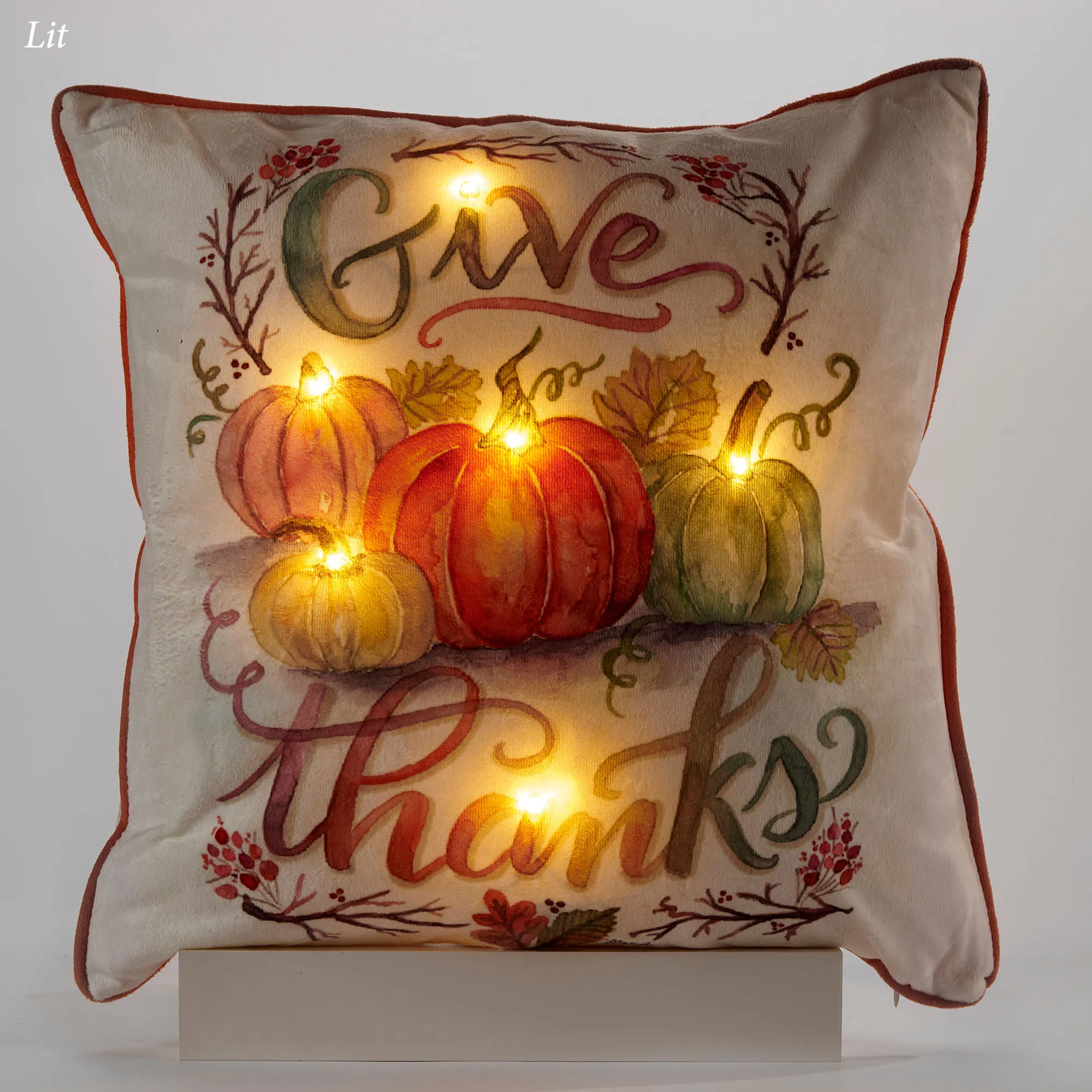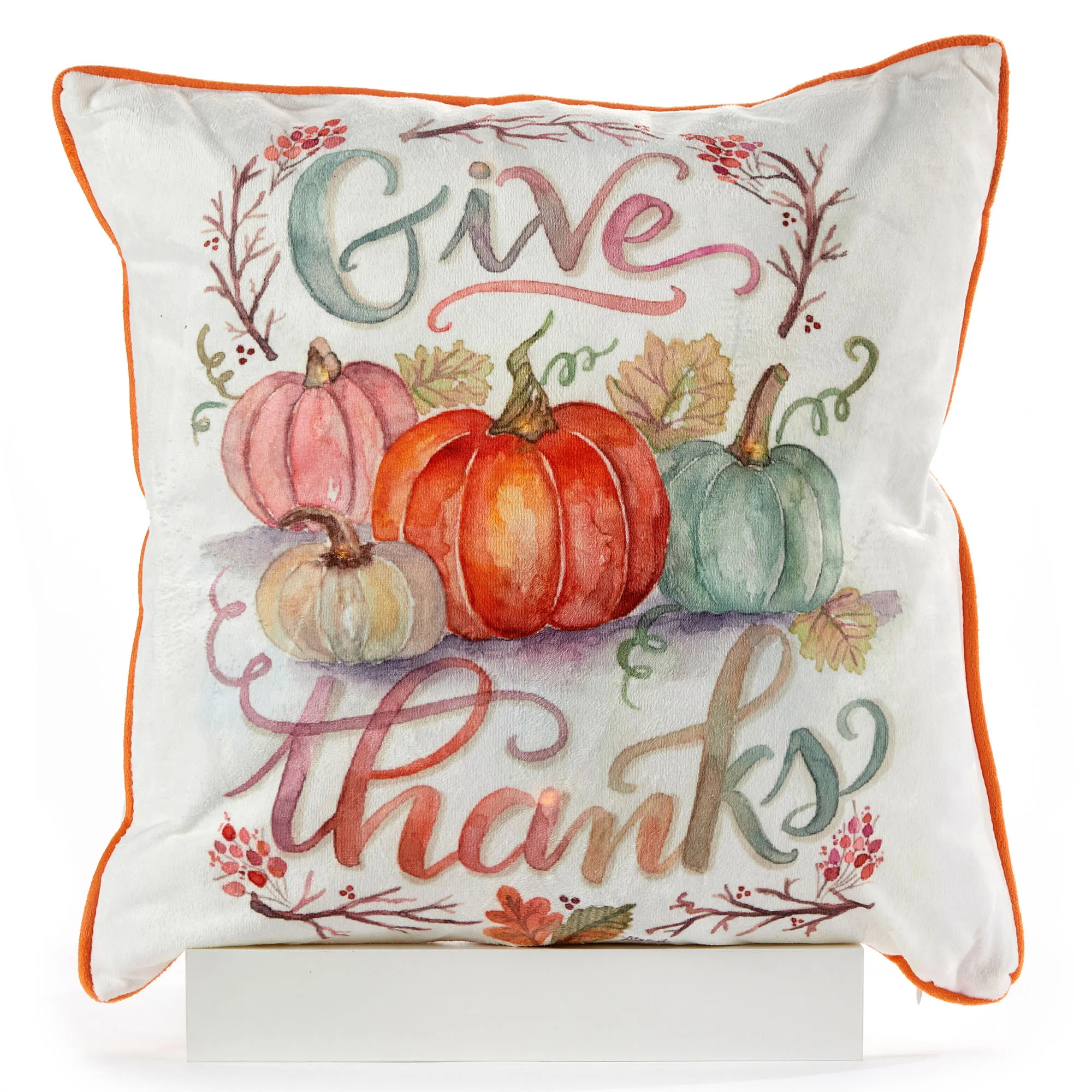 Let's Give Thanks for all of our seasonal blessings. This polyester decorative pillow has artwork by Lily & Val featuring printed pumpkins, berries, branches, and leaves on a white background. Fall pillow has orange piping, a hidden zipper closure, and the words "Give Thanks." Colors include shades of orange, ivory, brown, beige, coral, purple, and teal. LED lights require two AA batteries, not included. The battery pack is inside the pillow. Fill is polyester. Measures 18" sq. Spot clean. Imported.