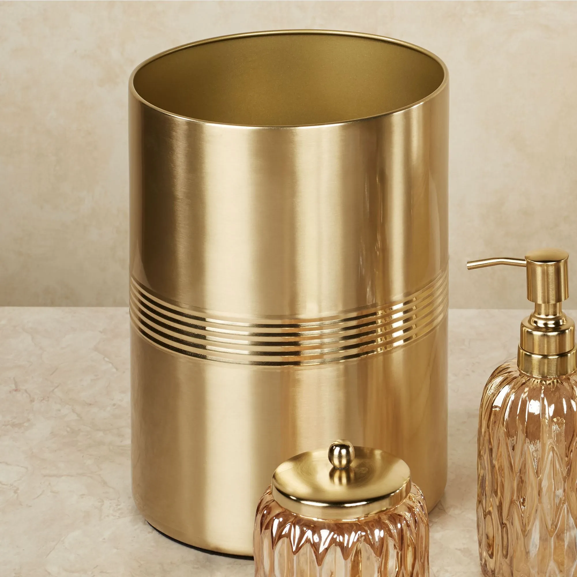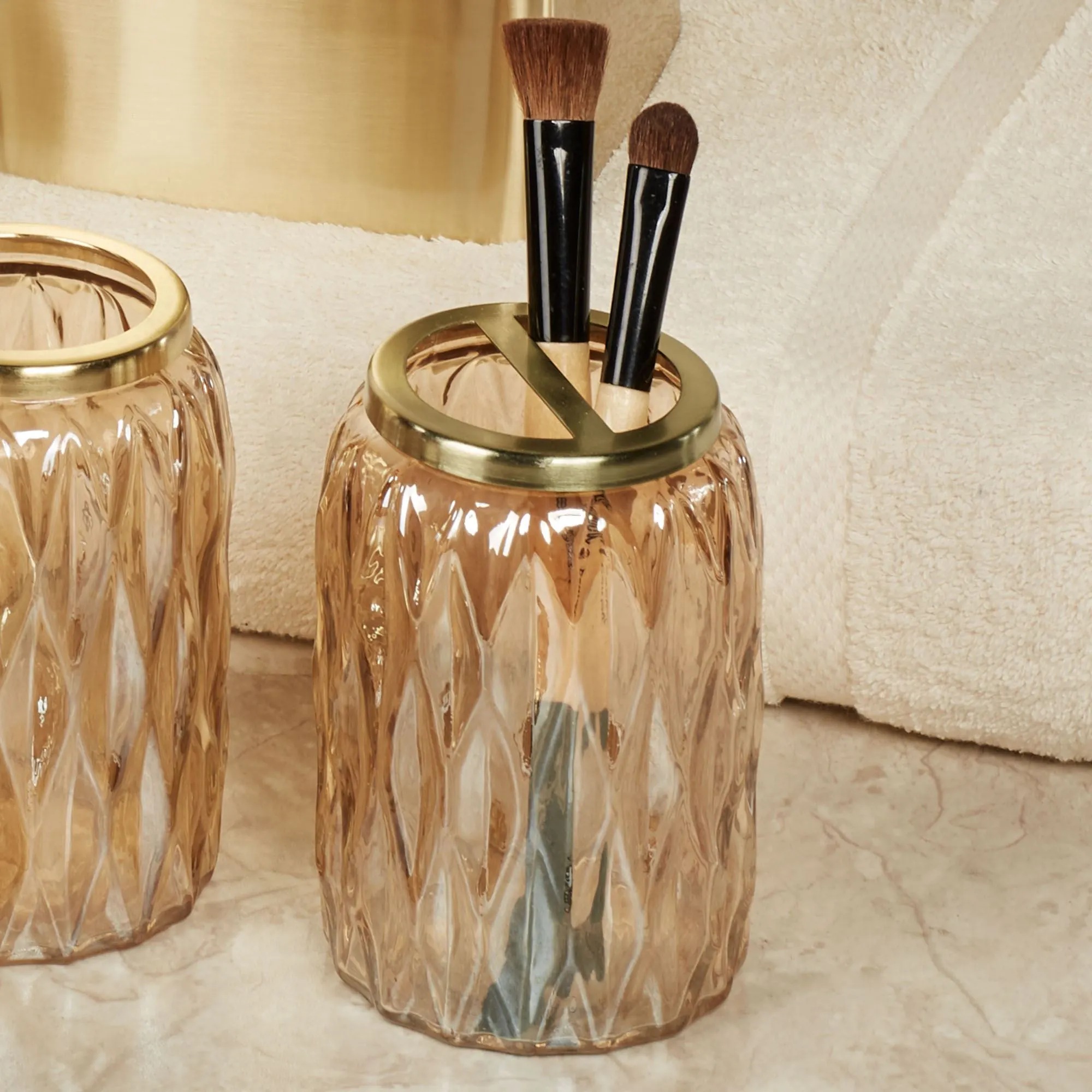 Glistening with glamour, the Glacier Bath Accessories add undeniable style to your space. Accented with golden metal, all, except the Wastebasket and Tissue Cover, feature handcrafted diamond-faceted glass designs in iridescent gold. Wastebasket and Tissue Cover are sleek brushed gold metal with center accent ridges. The Brush Holder can be used to hold your toothbrushes or makeup brushes. Due to the handcrafted nature of the glass items, minor variations may occur. Specify Brush Holder, Covered Jar, Soap Dish, Tissue Cover, Tumbler, or Wastebasket.