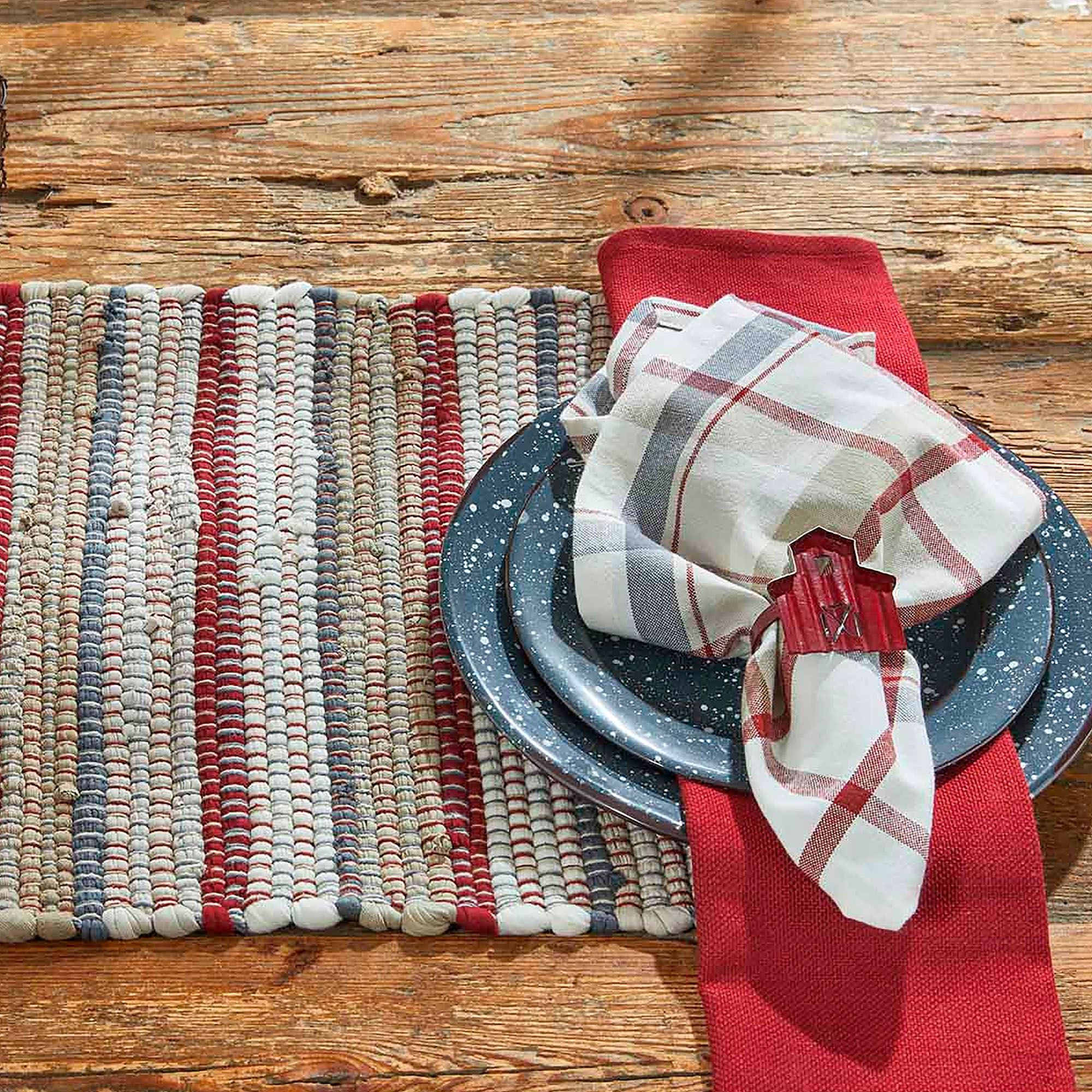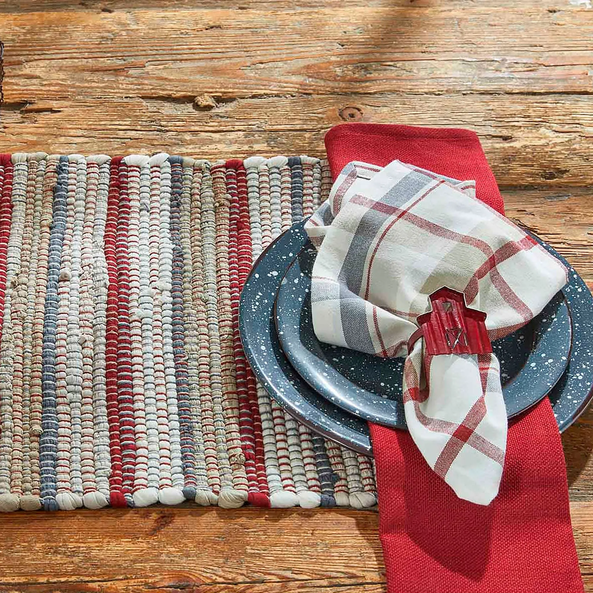 Pair the Glenwood Chindi Table Linens with solid colors or patterned table accents for a timeless trend. These versatile cotton table linens have a dimensional textured weave in hand-dyed hues of tan, ivory, wine, and slate blue. Placemats are 19"x13" each and are sold in a set of four. Table Runner is 13"x54". Due to the handcrafted nature, variations in color and design may appear. Hand wash or spot clean. Imported.