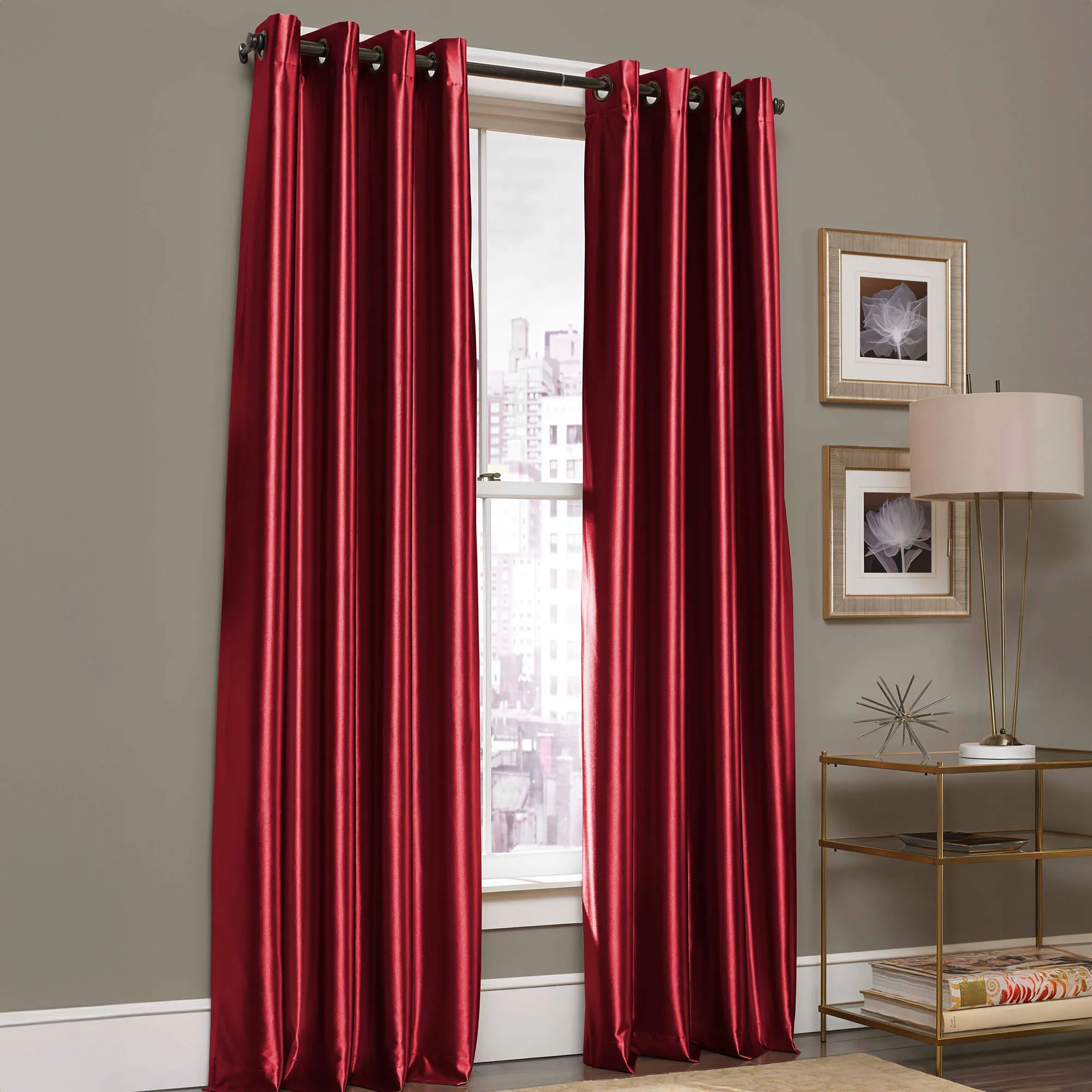 Make a statement and let your window Glisten with this grommet curtain panel by J. Queen New York. This beautiful polyester satin panel is a solid color and has 1.5" dia. metal grommets. White, Navy, and Sterling Blue have brushed nickel grommets. Gold, Light Taupe, and Red have oil-rubbed bronze-finished grommets. Lined curtain panels are sold individually; each is 50"W. Dry clean. Imported.