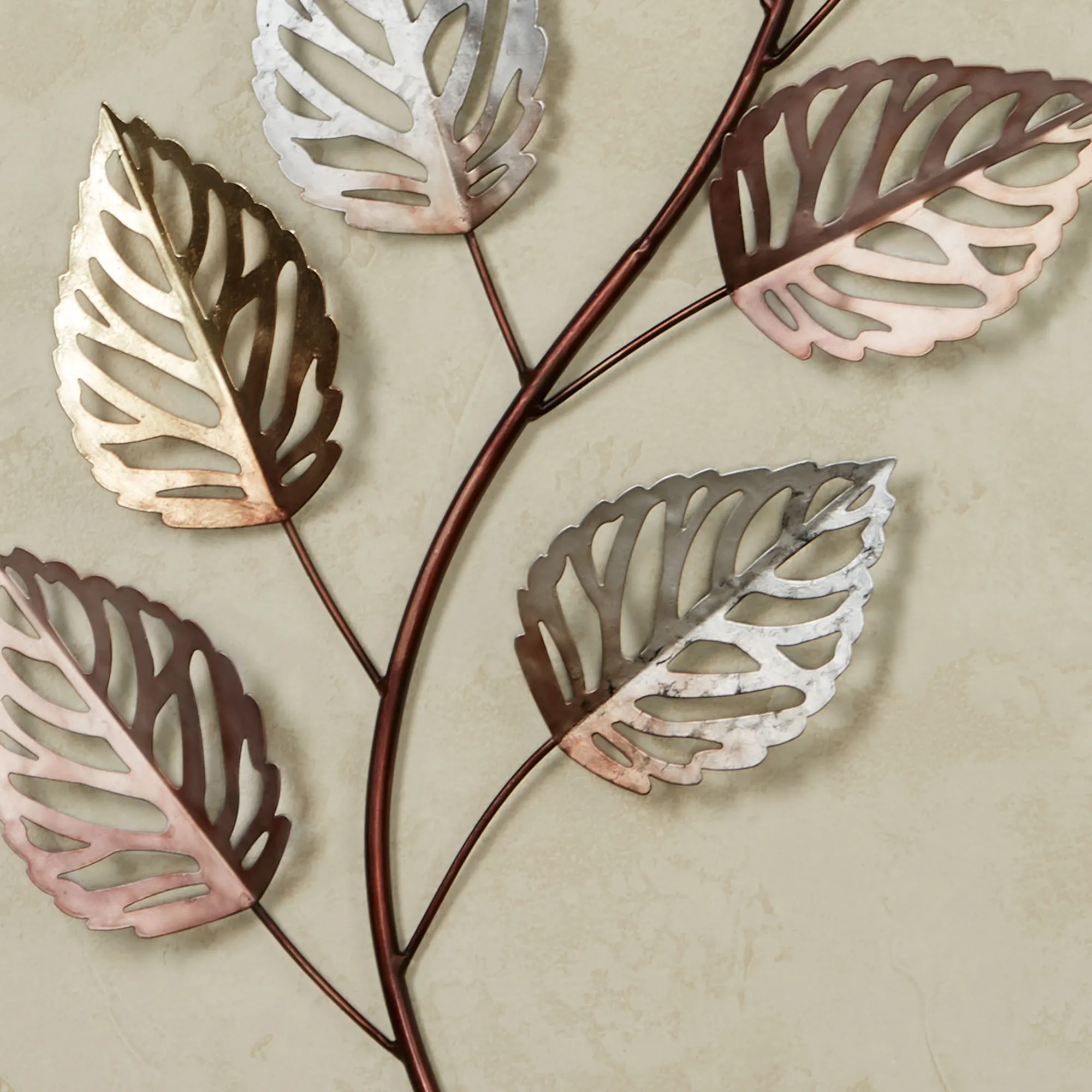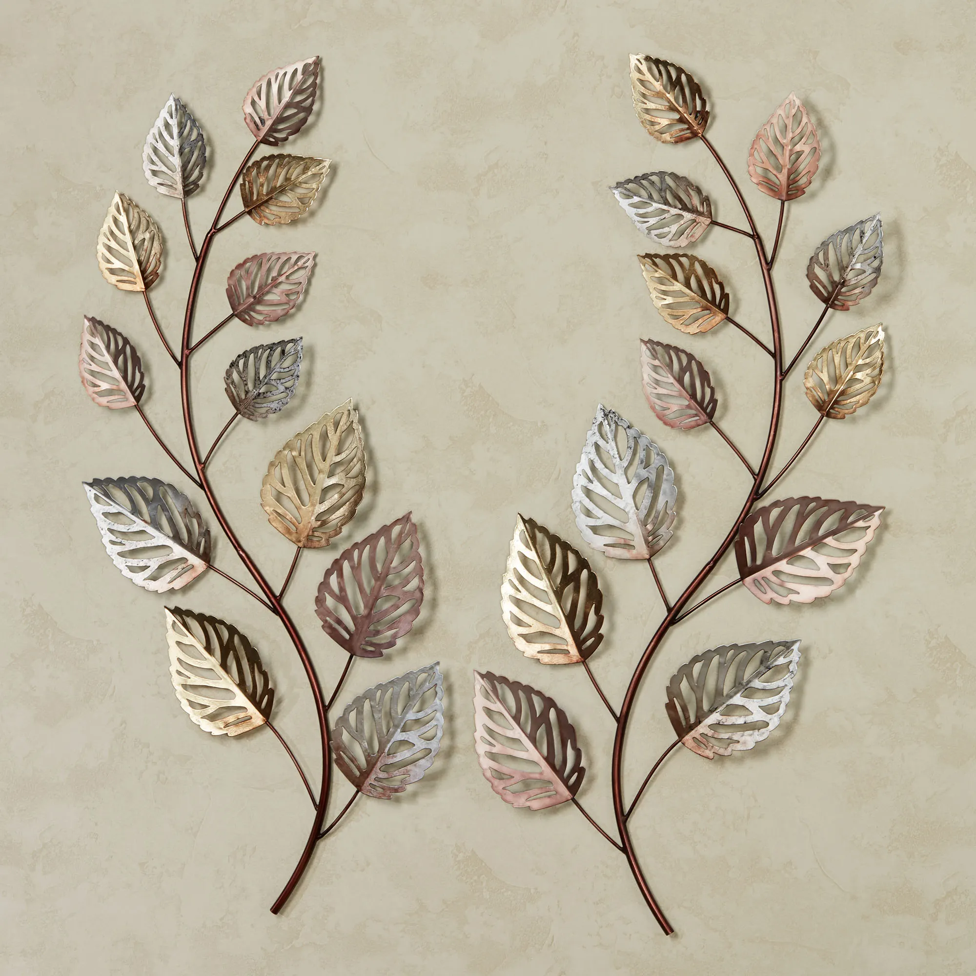 Glistening Leaves in prismatic hues herald the beautiful change of the autumn season. Crafted from metal, this wall art set features curving bronze branches that have hand-finished gold, silver, and copper openwork leaves with metallic foil accenting. Each measures 17"Wx1.5"Dx38"H.