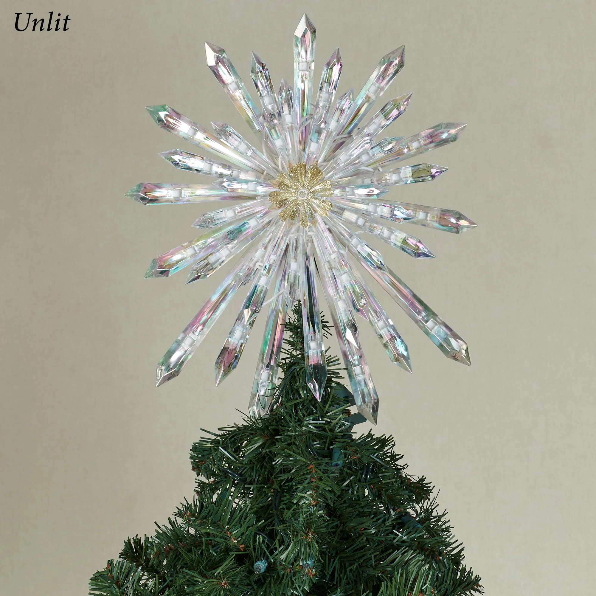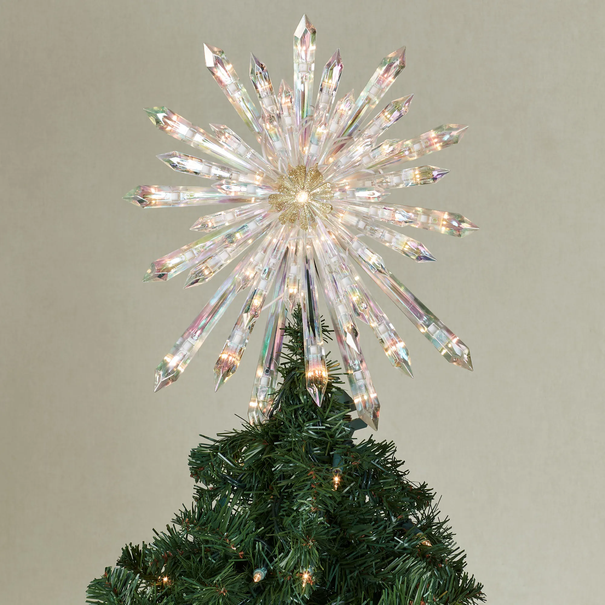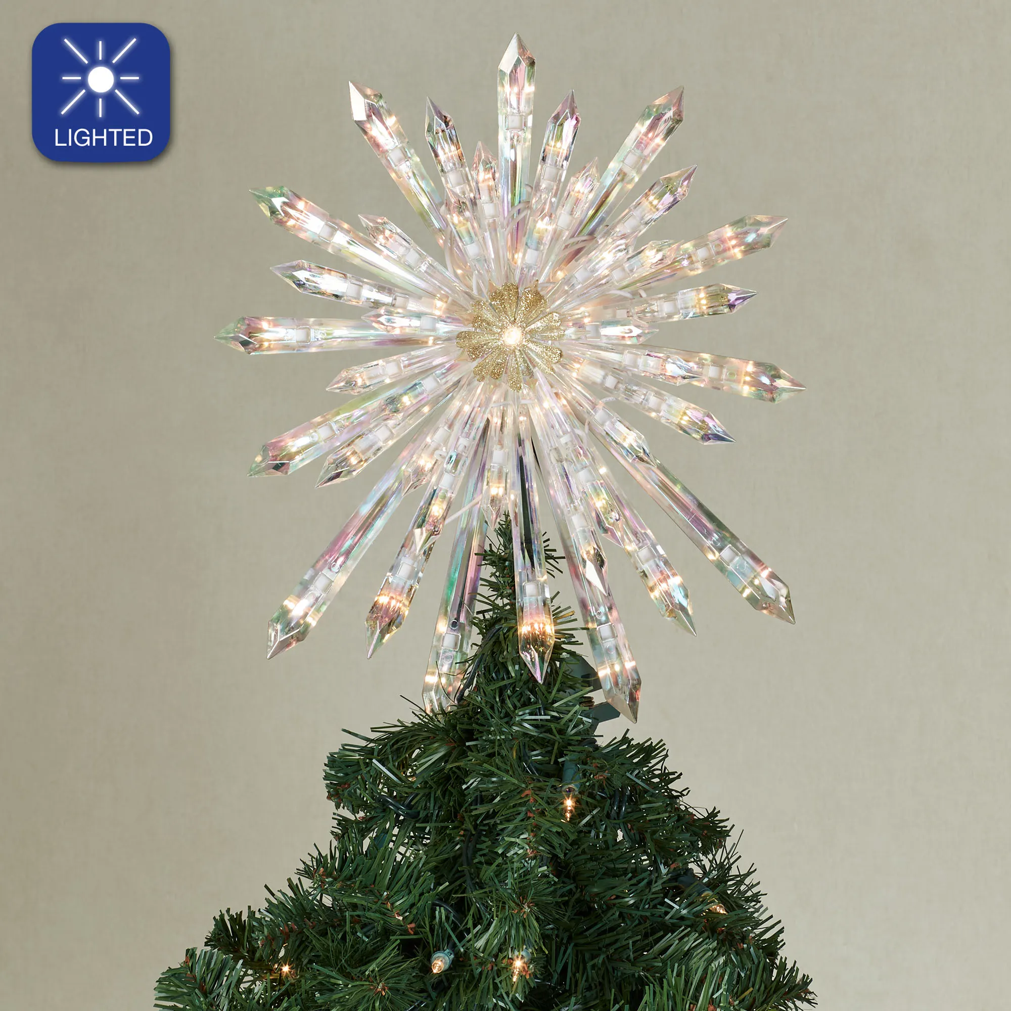 The Glittered Starburst Lighted Tree Topper completes your Christmas tree with a bold, dynamic allure. Crafted from clear acrylic, the tree topper resembles bursting iridescent crystals with unique facets and varying lengths attached to a golden glitter center. The design glows with 50 incandescent bulbs. UL listed. Indoor use only. With a green clip to attach to your tree, the lighted star tree topper measures 11"Wx3"Dx13.5"H.