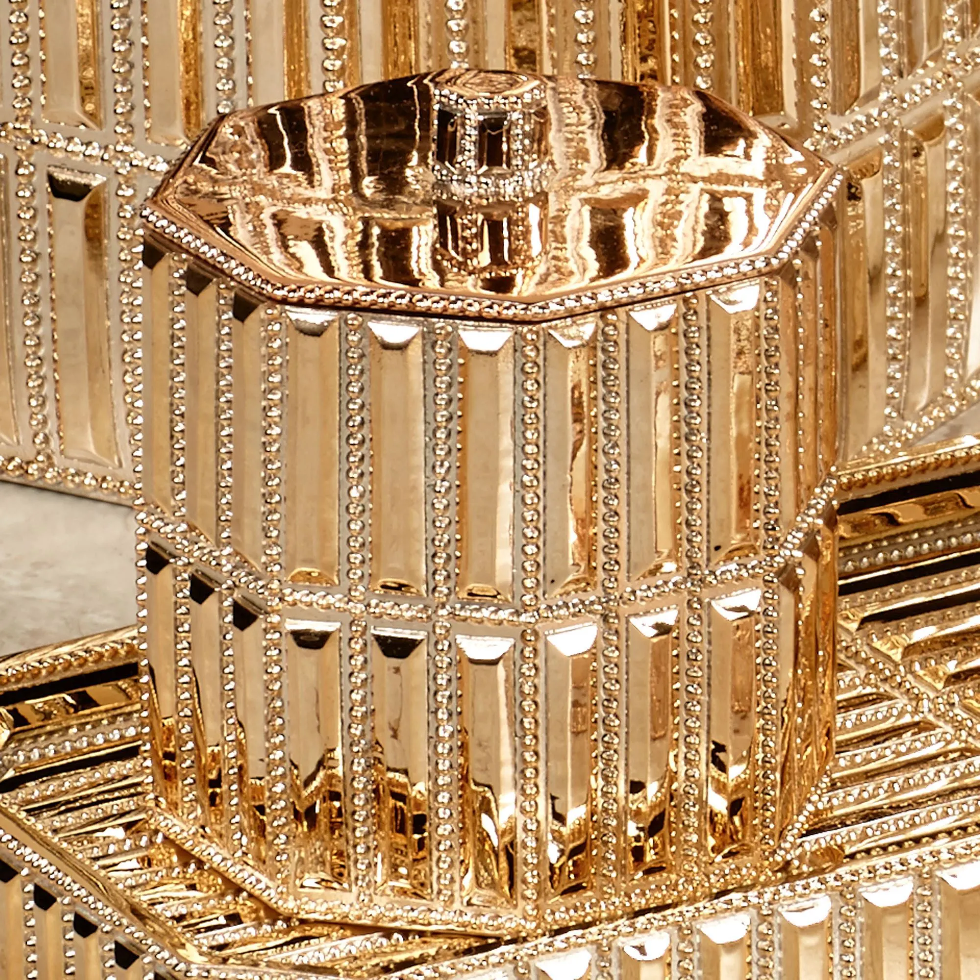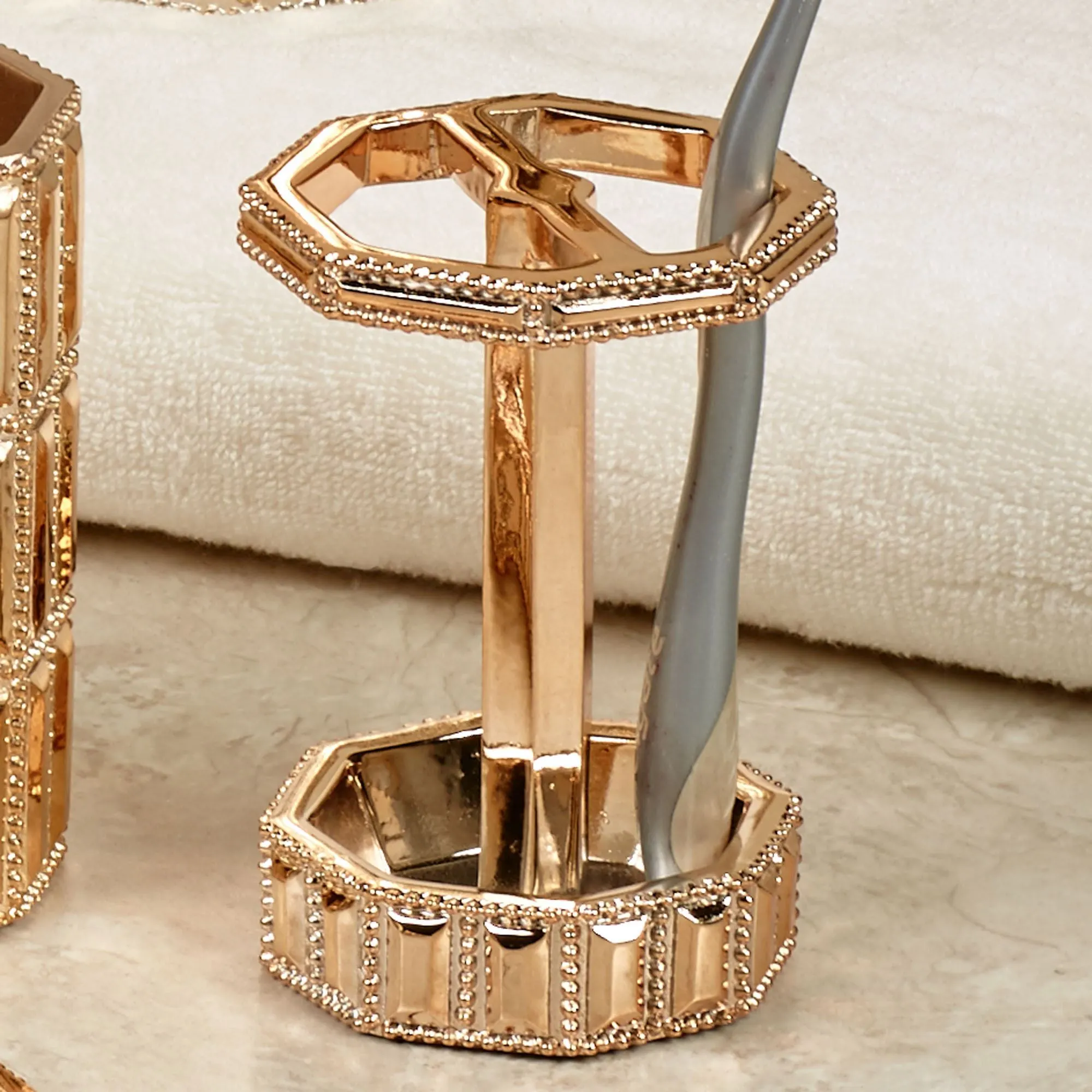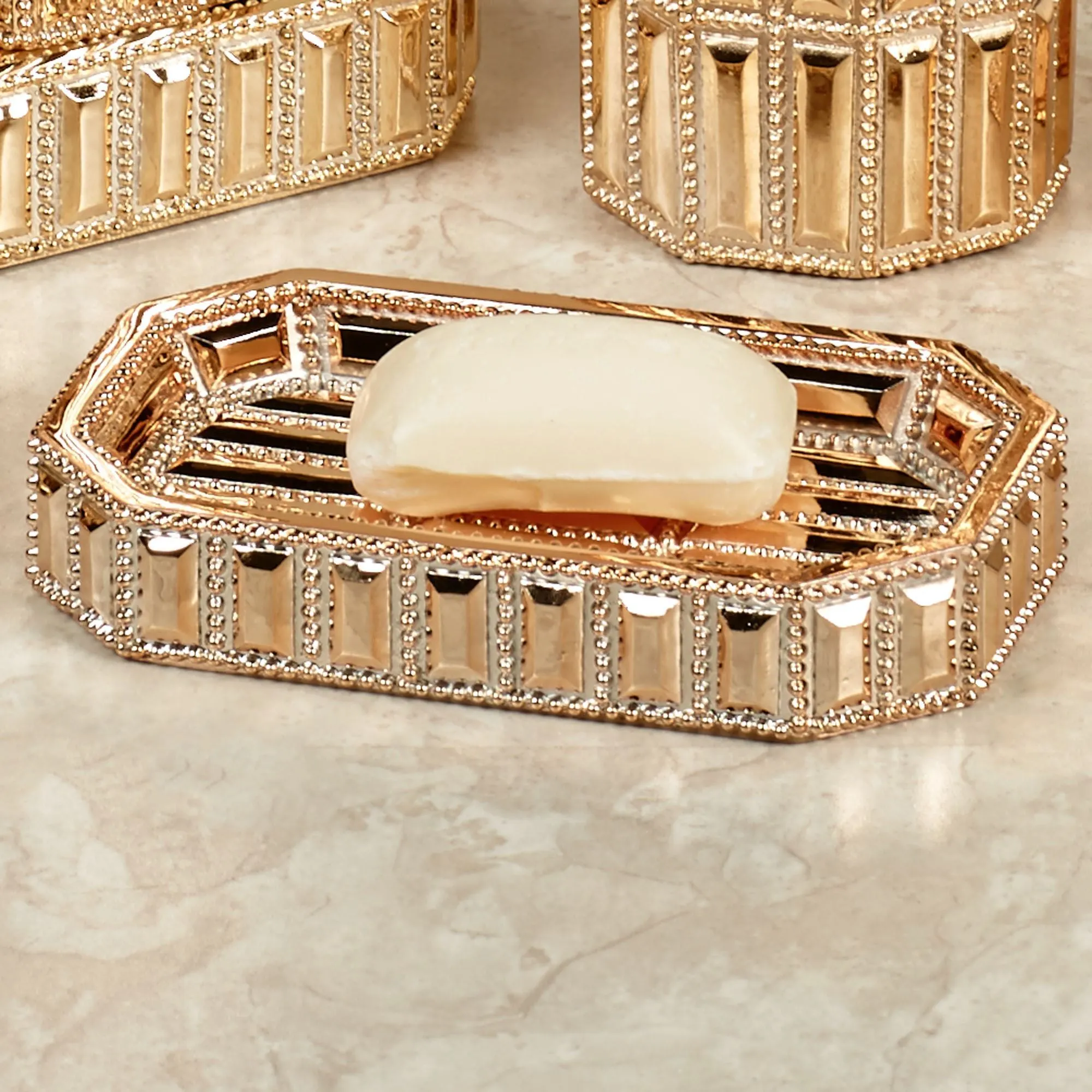 Glamour radiates from the dazzling design of the Glitz Gold Bath Accessories. Each resin accent features faceted and beaded details embellished with a luxurious gold finish. Specify Wastebasket, Tray, Cotton Jar, Lotion/Soap Dispenser, Soap Dish, Tumbler, Tissue Cover, or Toothbrush Holder.