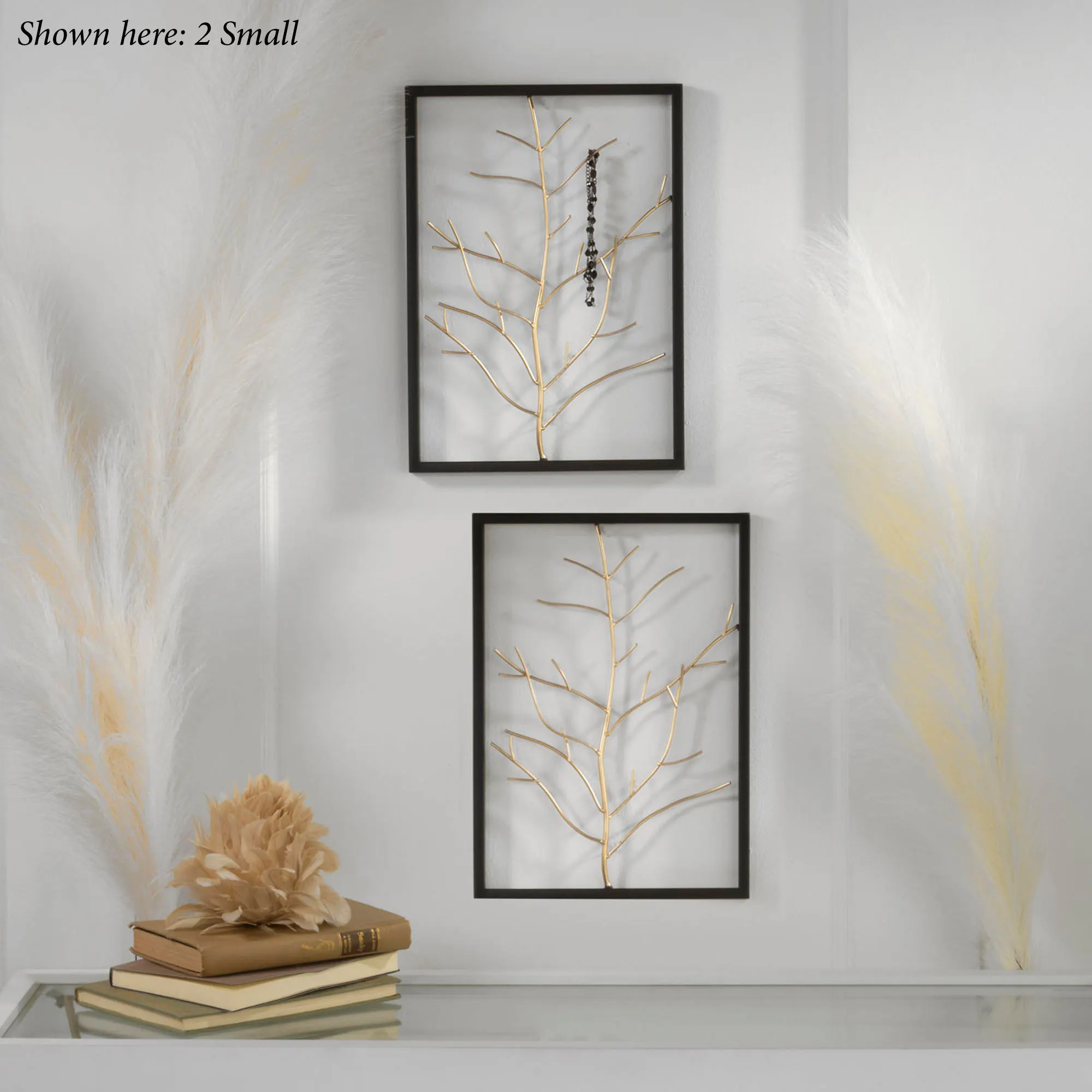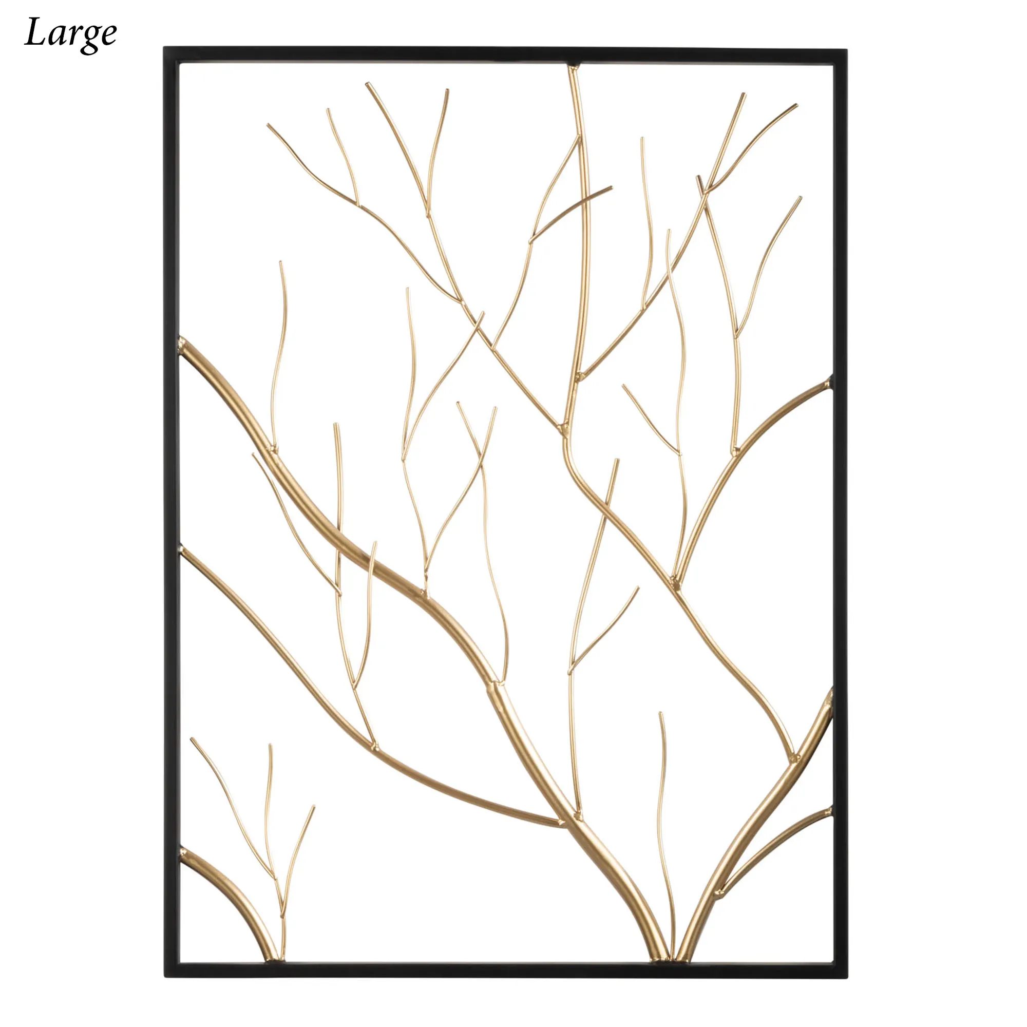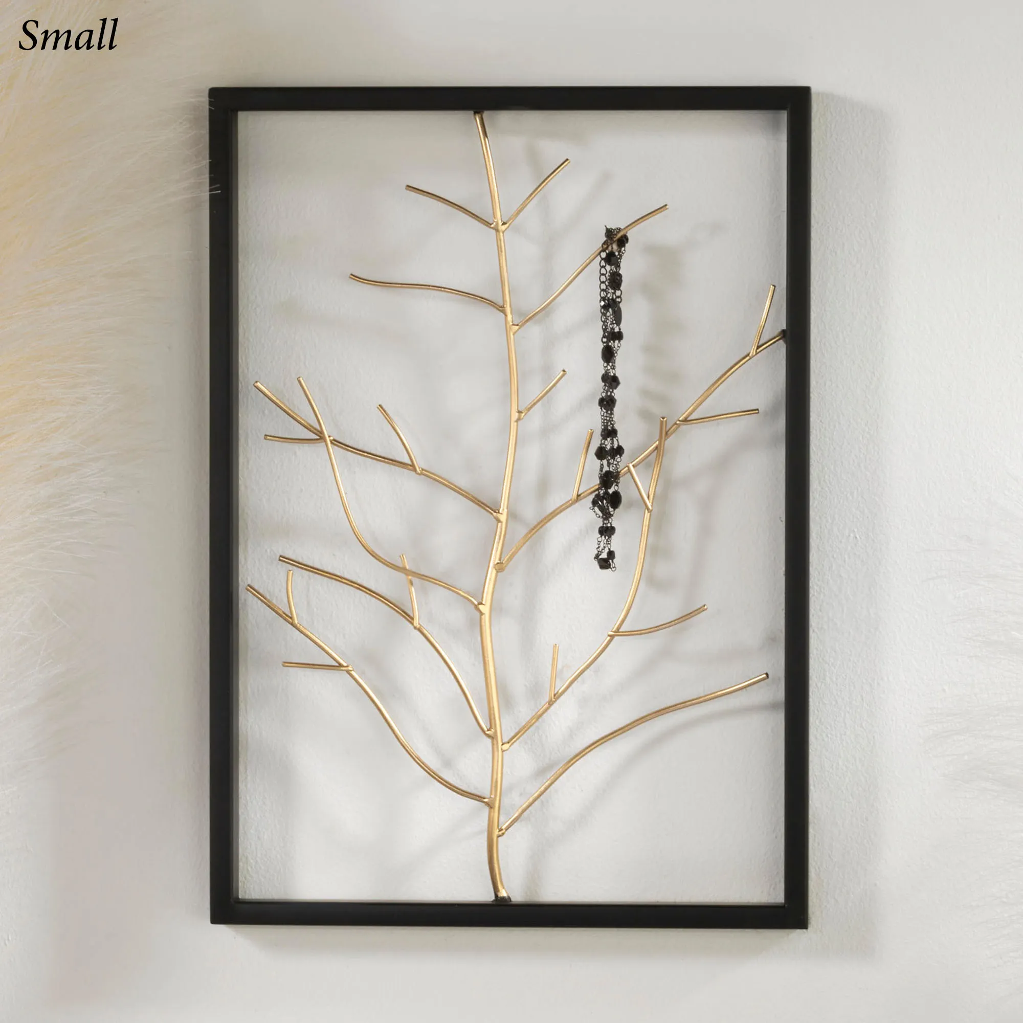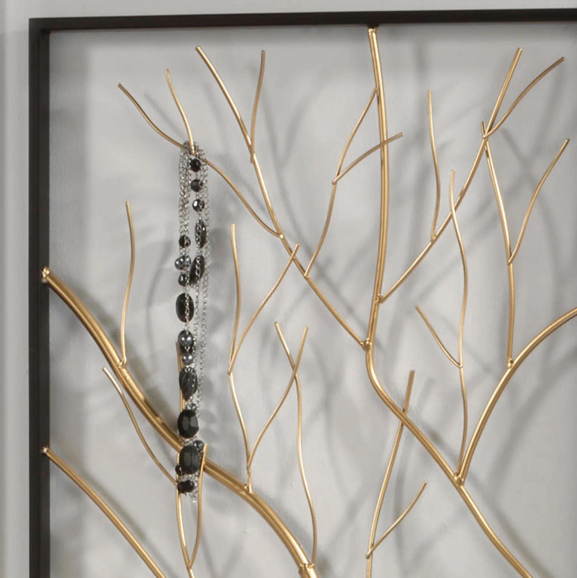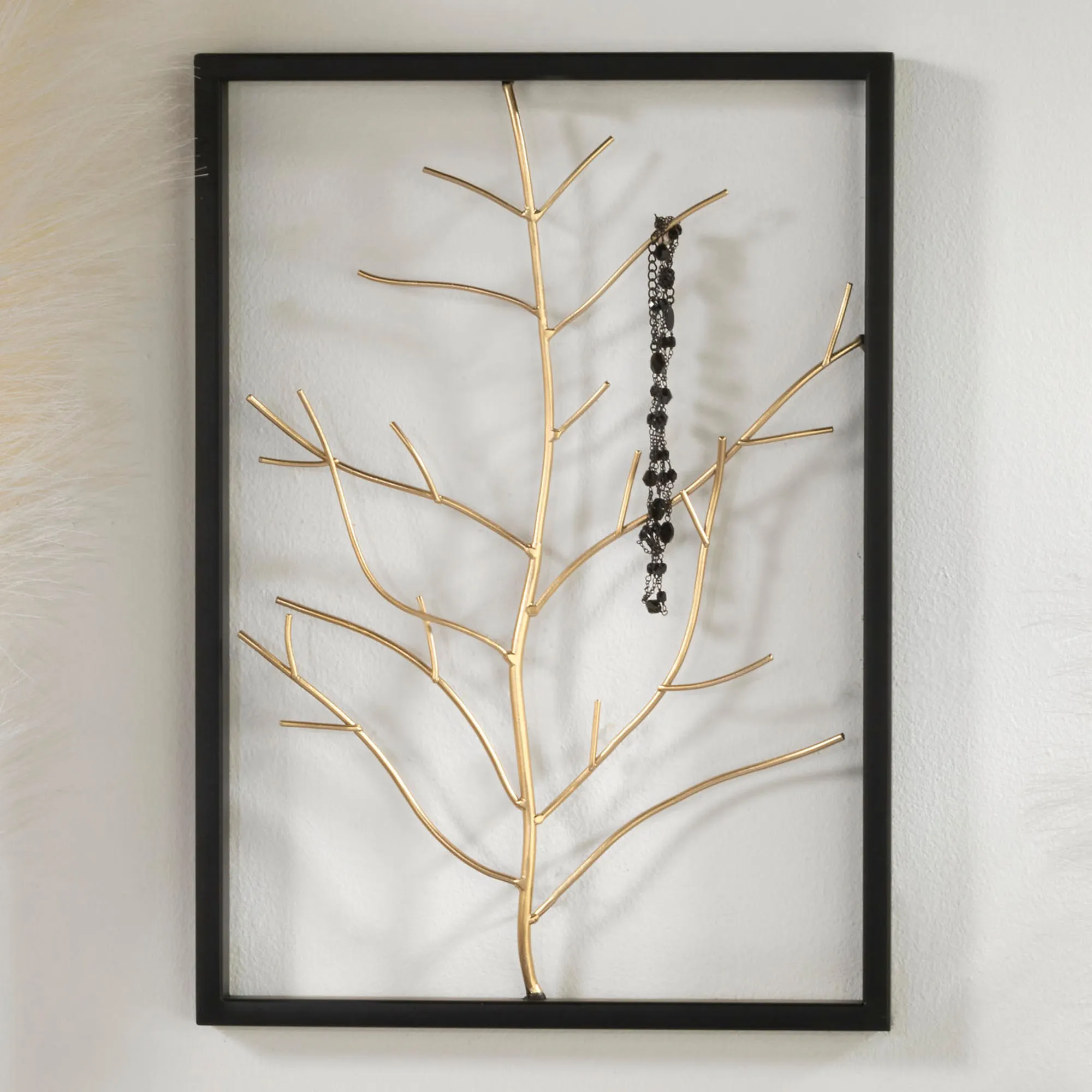 The Gold Branch Wall Art exudes beauty and functionality. With a black openwork frame, the metal artwork features a dimensional golden branch design. The branches fill the frame and also provide a unique way to organize or showcase your jewelry. Large measures 18"Wx1"Dx24"H. Small measures 10"Wx1"Dx14"H.
