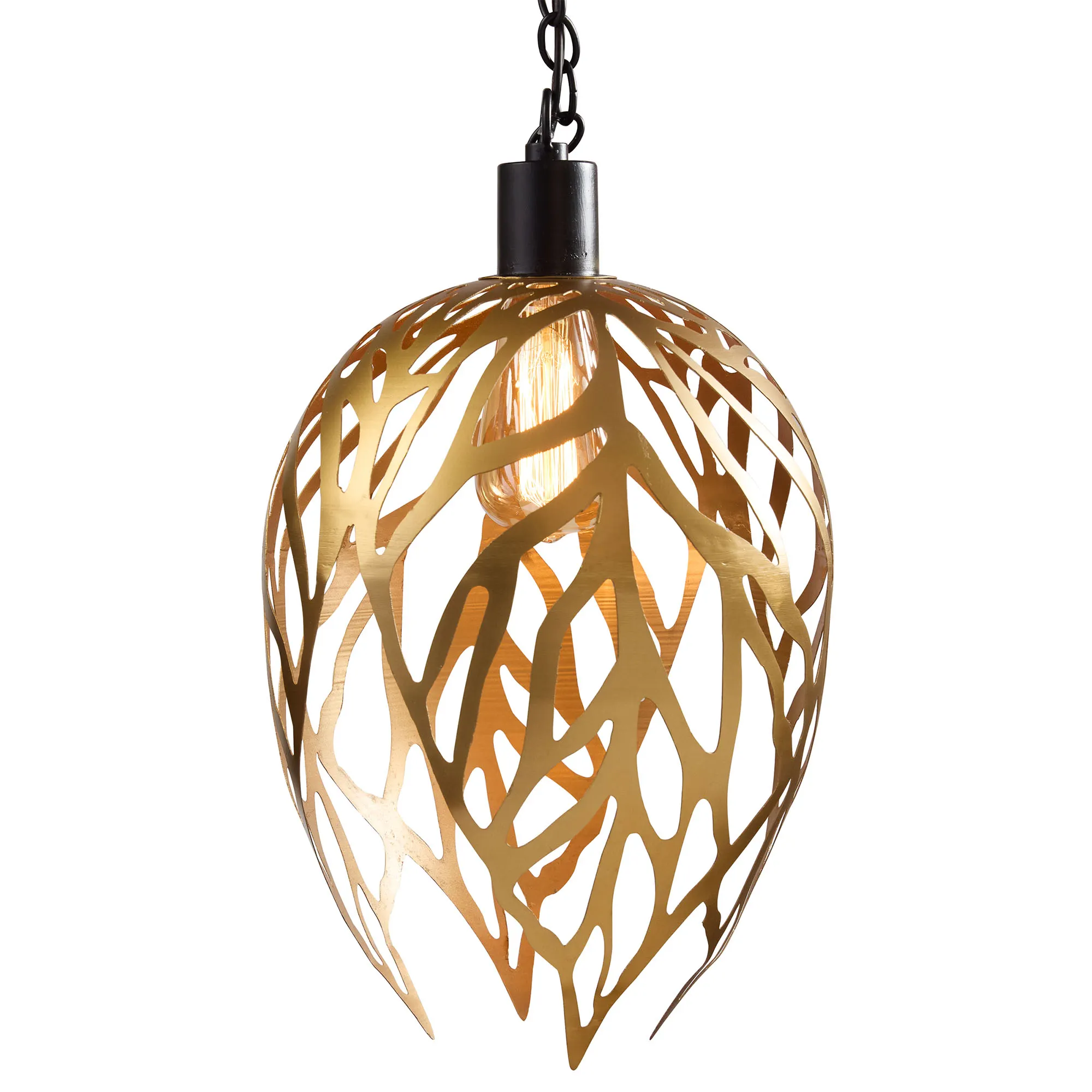 The artistic Gold Leaf Pendant Light is a striking display. Made of metal with a gold finish, this pendant light has an openwork overlapping leaf design. The adjustable chain is 3' with 7' of cording. Requires one 60W max. bulb, not included. The coordinating ceiling plate is included. Light must be hardwired to an existing circuit. Measures 10"dia.x16"H.