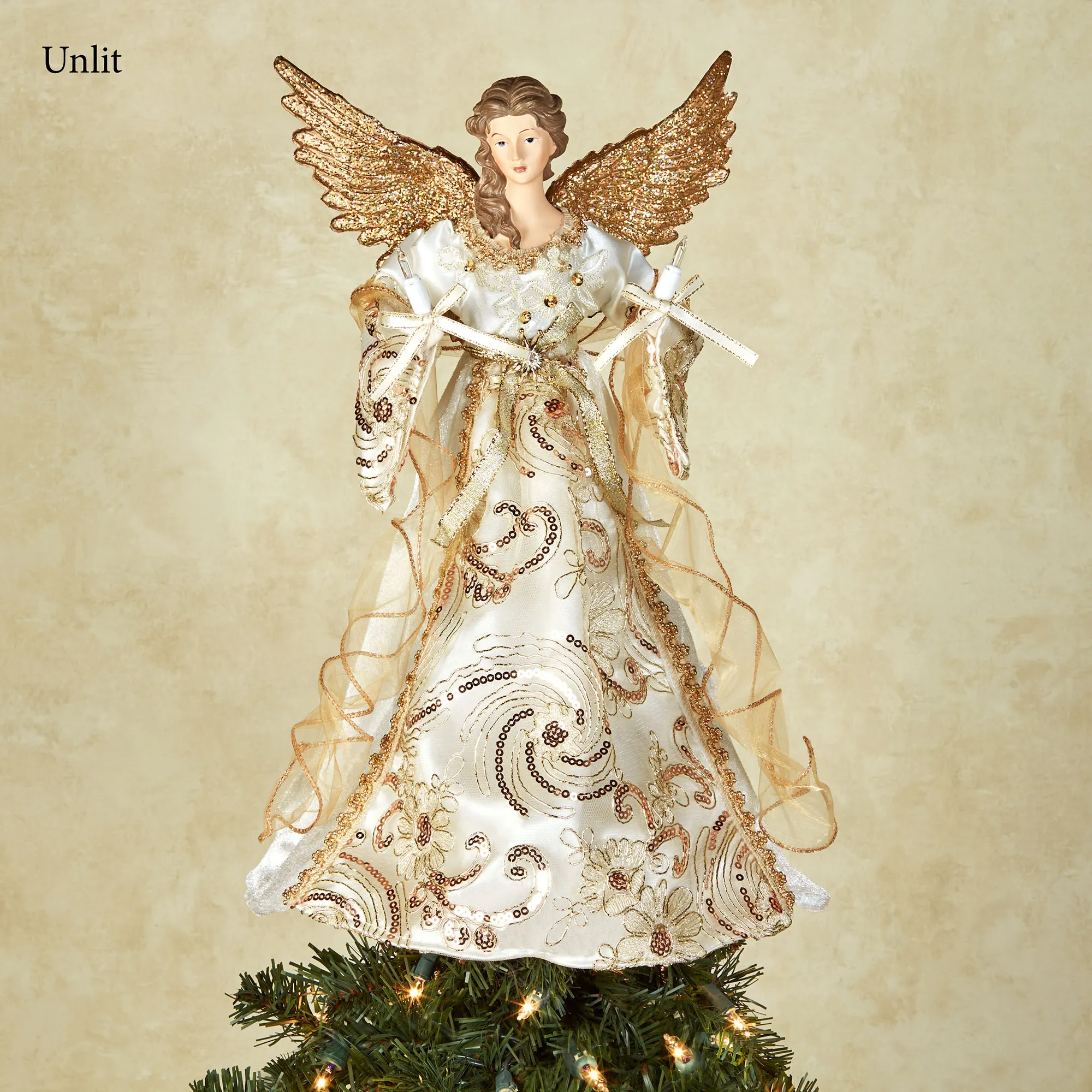 Display the heavenly beauty of the Golden Angel Lighted Christmas Tree Topper. This beautiful angel, from Kurt S. Adler, has a porcelain face and hands. She wears an ivory and gold polyester dress with gold sequins, embroidered floral and swirl designs, and elegant trim. The angel has gold glittery molded wings and holds a lighted candle in each hand. UL listed. Ten pre-lit, clear incandescent bulbs illuminate her gown. The 5.5" dia. formed cone allows her to rest gracefully on a tree or tabletop surface. Indoor use only. Measures approx. 13"Wx12"Dx16"H.