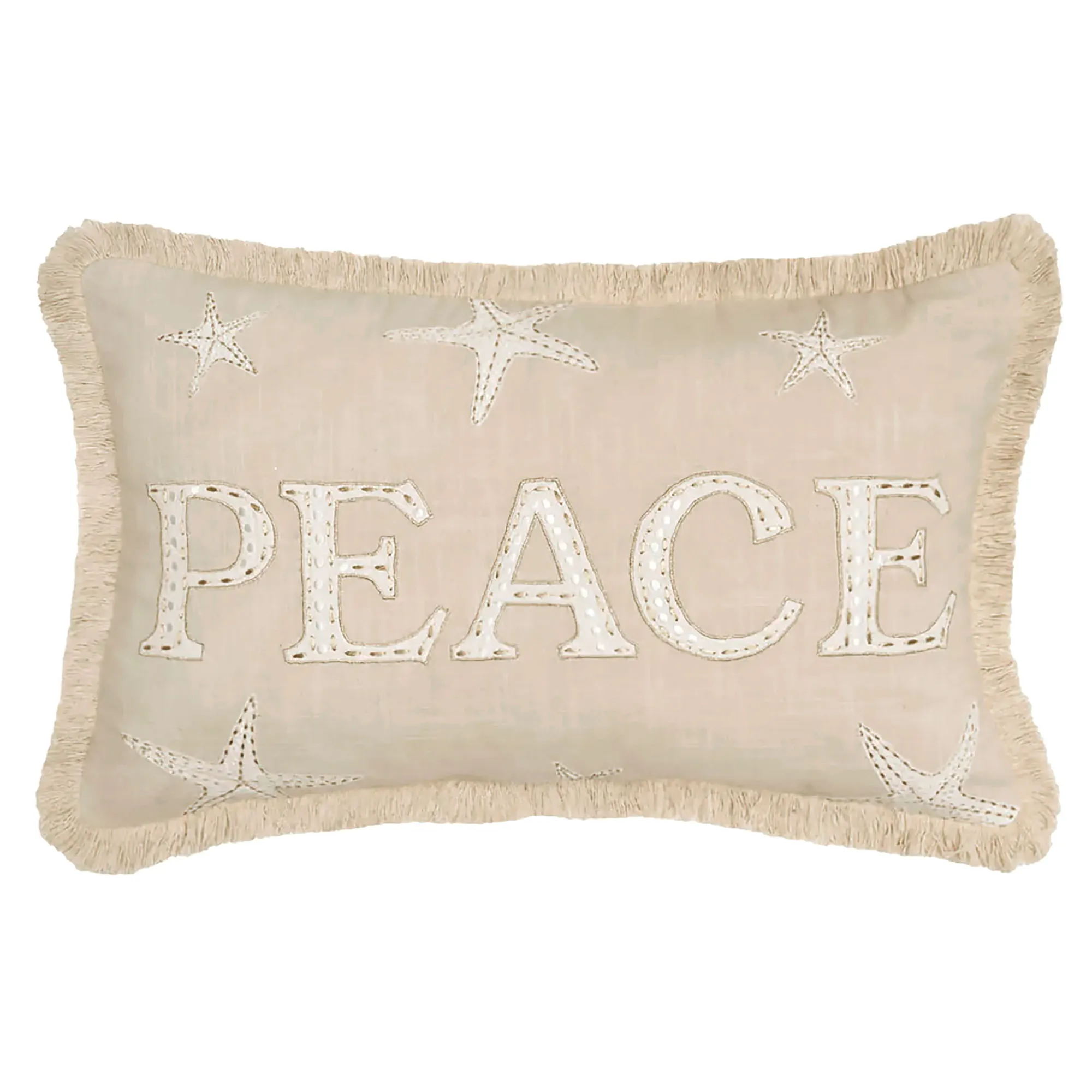 Invite the serenity of the Golden Coast into your home with this charming coastal decorative pillow. The natural-hued cotton accent pillow features light sand appliques of a bold center "PEACE" and scattered starfish. Embroidery embellishments in metallic gold and white decorate the designs, while fringed edges add unique texture. Fill is polyester. Hidden zipper closure. Rectangle pillow measures 22"x14". Spot clean only. Imported.