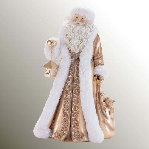 Dressed to the nines, the Golden Elegance Santa Claus figure always looks classy. Made of resin, this holiday table sculpture depicts Santa Claus wearing a golden coat with white faux fur trim and a matching hat. His gown has a decorative scrolling design, and he holds a lantern and a bag of toys in his hands. Gold leaf accents add the finishing touch. Measures 9.5"Wx8"Dx15"H.