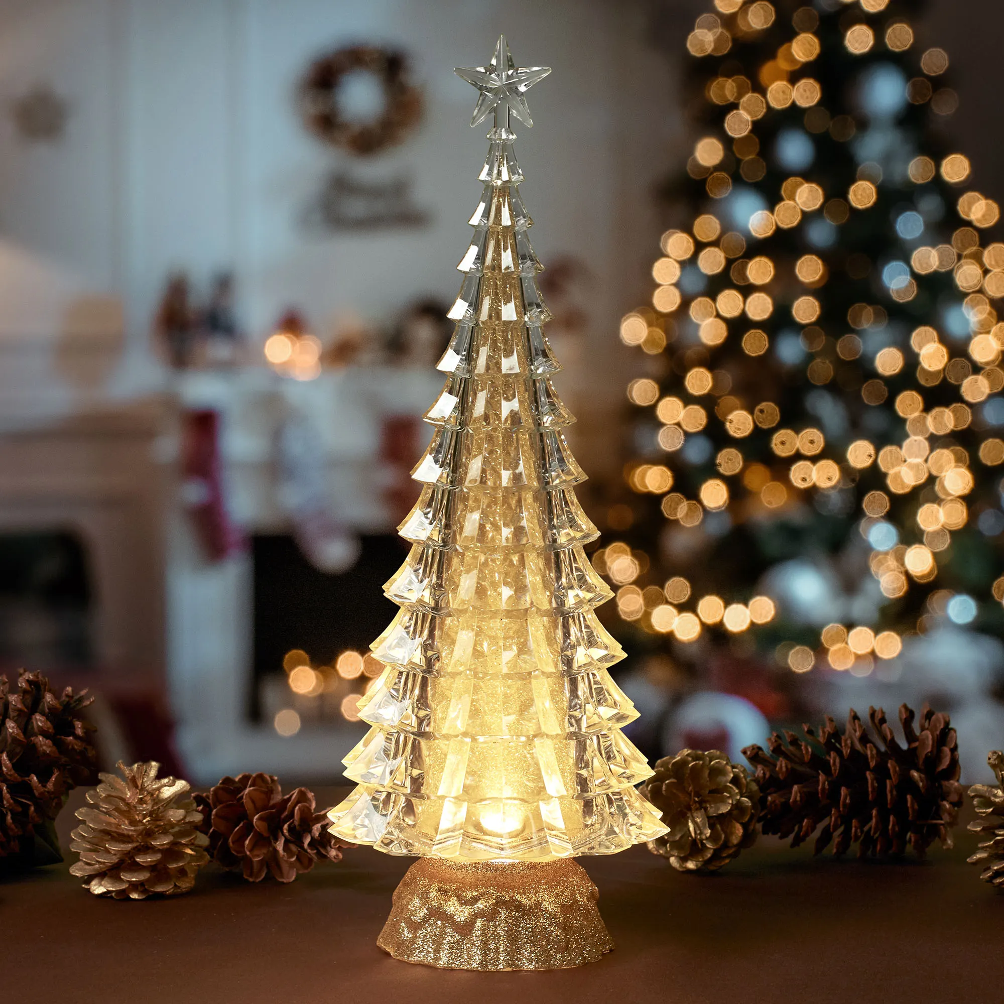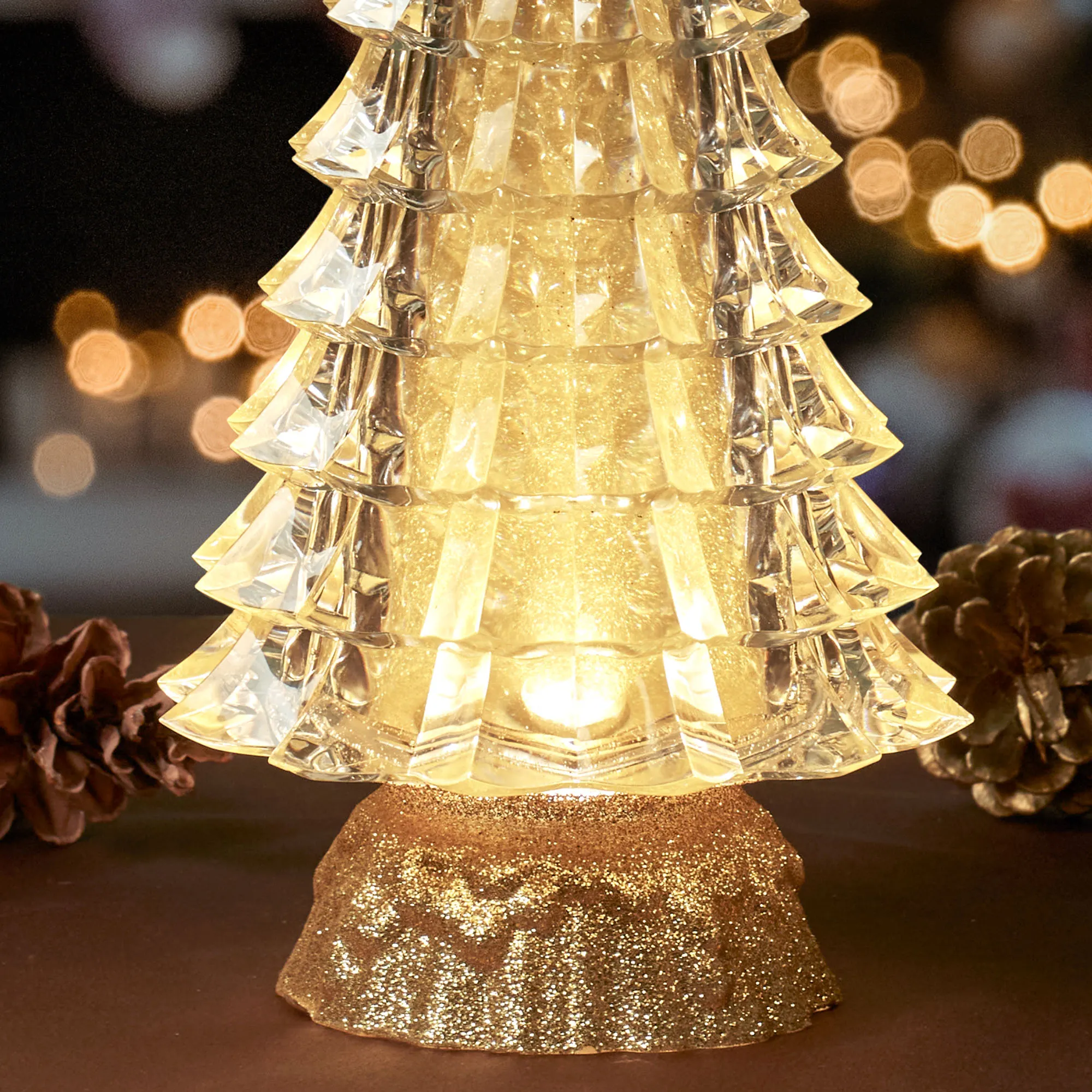 • Clear tree glitter globe has a faceted shape