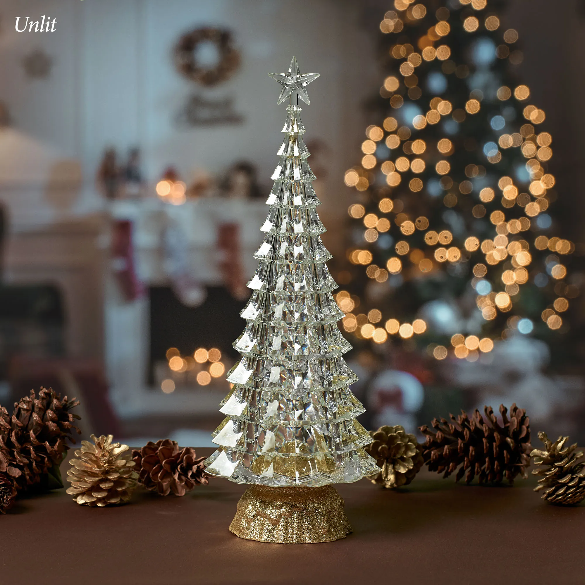 Santa Claus will love the look of the Golden Swirl LED Lighted Tree. From Confetti Lites(TM) by Roman, Inc., this clear molded polymer tree has a faceted shape and is topped with a star. Gold confetti glitter swirls and shimmers inside the liquid-filled interior, which shines brightly when the LED light is lit. Requires three of your AAA batteries or your adapter for use with the included USB cord; do not use with a USB adapter exceeding 1.5 amps. The on/off switch is located on the bottom of the gold, glittery base. Measures 5"dia.x15"H.