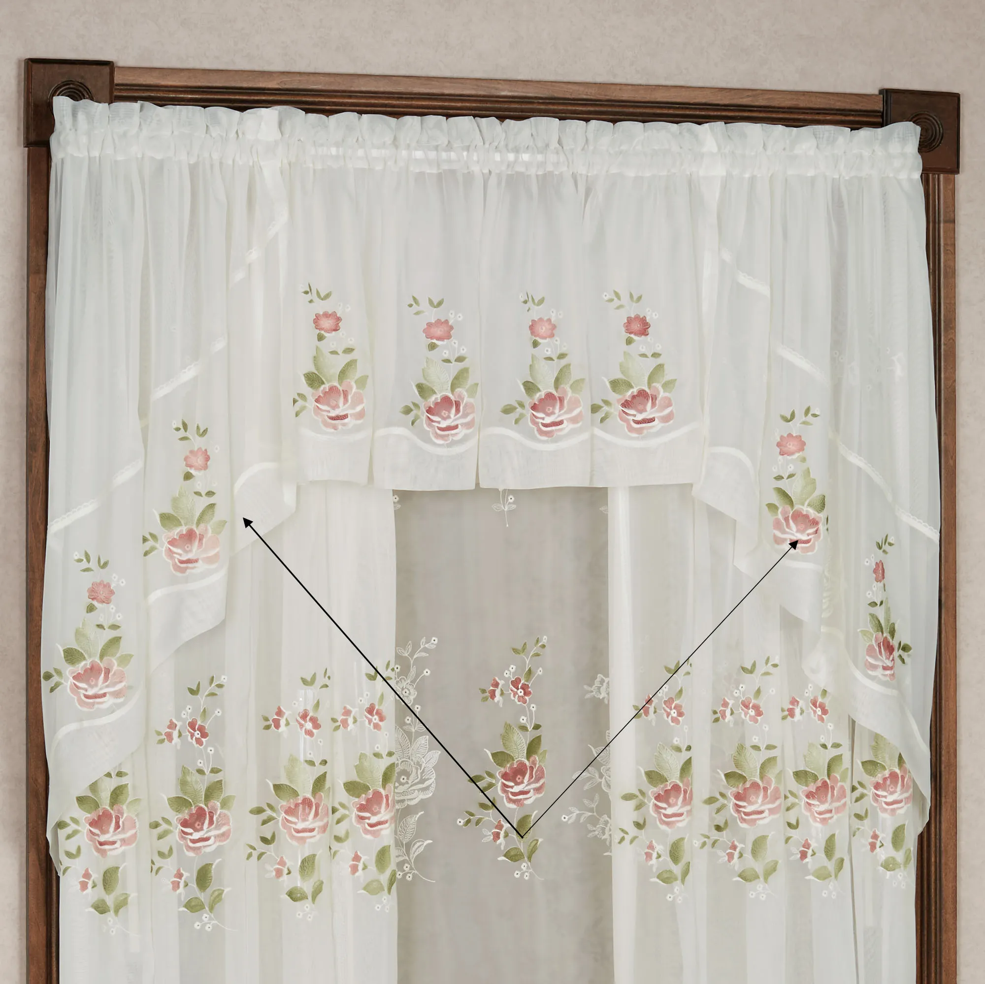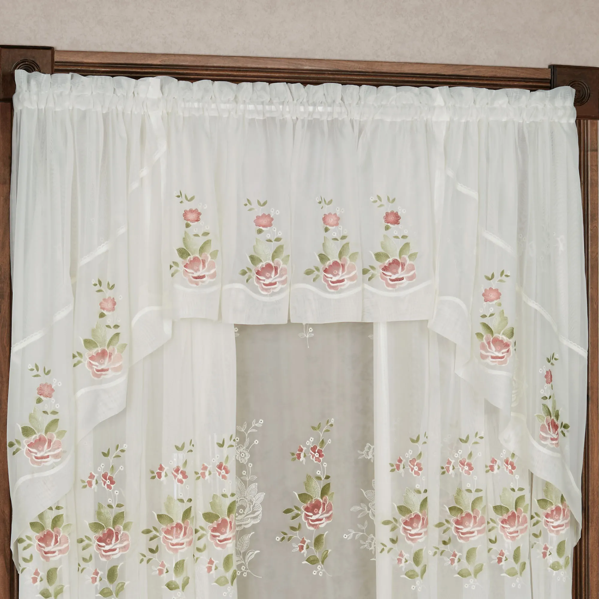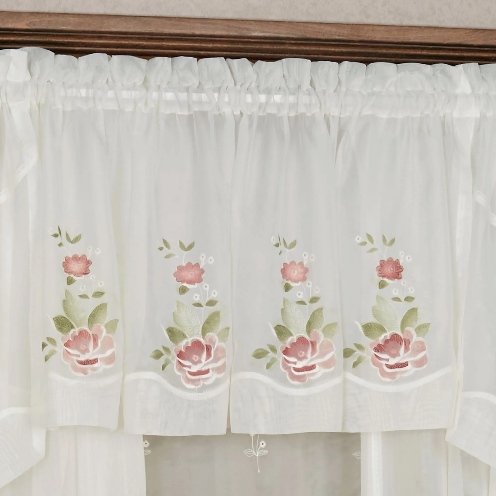 Blossoming beautifully, these Graceful Blooms flourish with elegance. These sheer voile, polyester window valances feature embroidered and airbrushed flowers in rosewood and rose with green leaves. Rod pocket size is 1.5". The Swag Valance Pair, 62"Wx38"L, is still available. The Tailored Insert Valance and Curtain Panel are no longer available. Machine washable. Imported.
