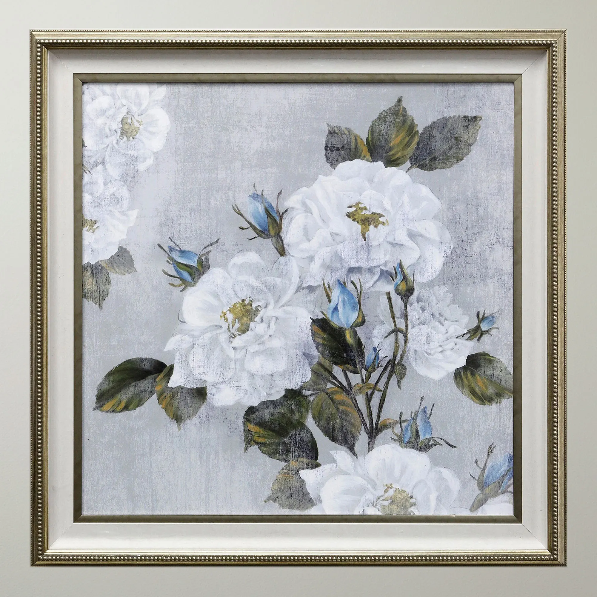 The Graceful III Floral Framed Wall Art captures the start of a beautiful blossoming bouquet. Proudly made in the USA, the artwork features lovely white layered blooms, blue floral buds, and deep green leaves on a pale blue color-washed background. The textured paper print has a gel coating and a detailed beaded light gold and ivory polystyrene frame. The beautiful flower garden-inspired framed wall art measures 37"sq.x2"D.