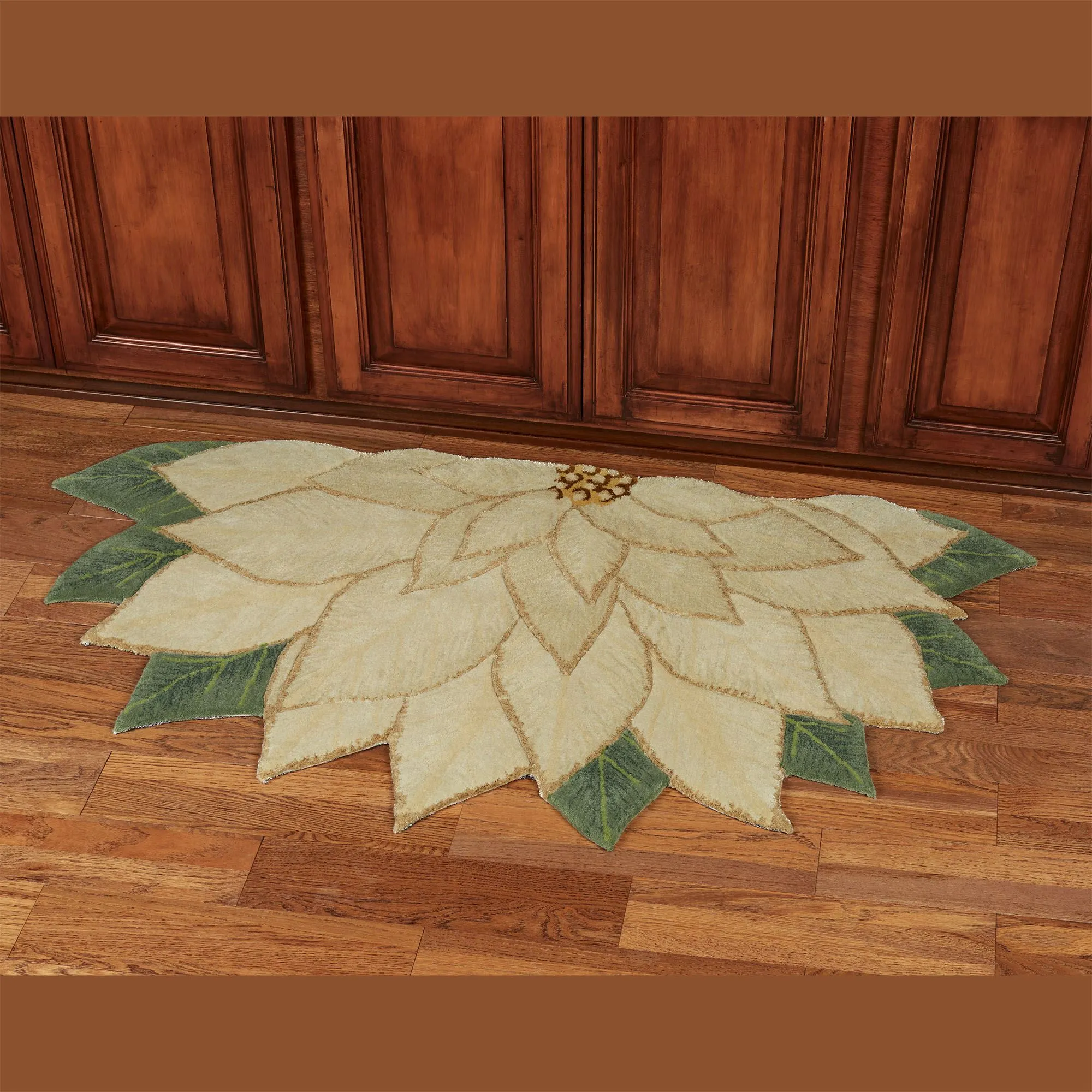 • Hand-tufted and handcarved poinsettia-shaped rug