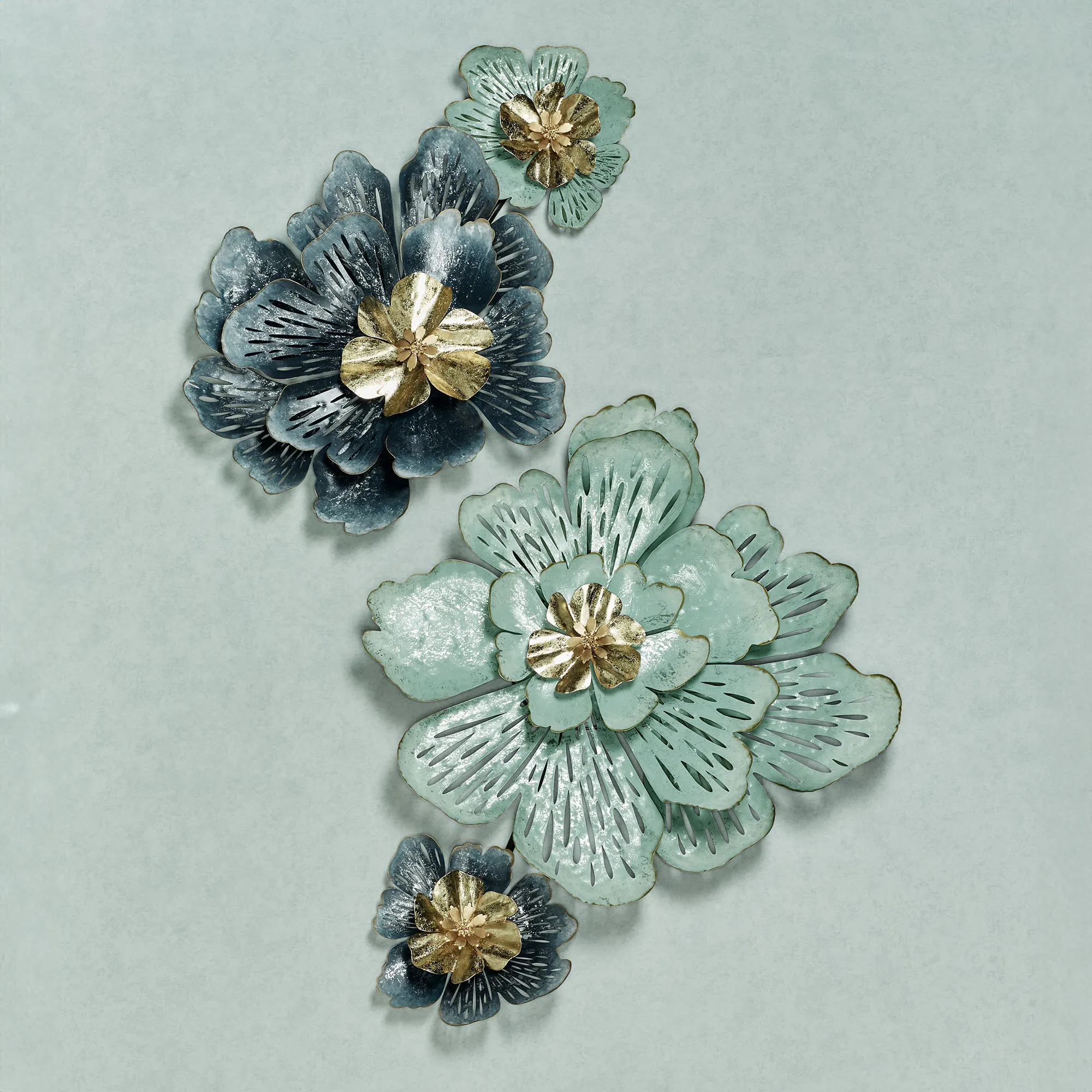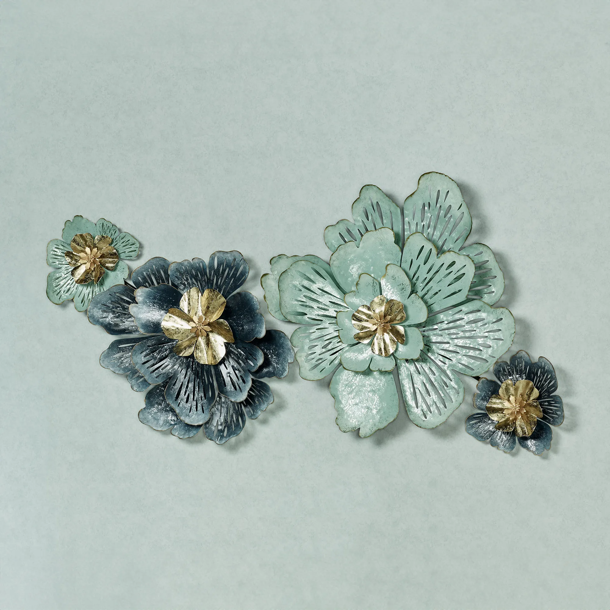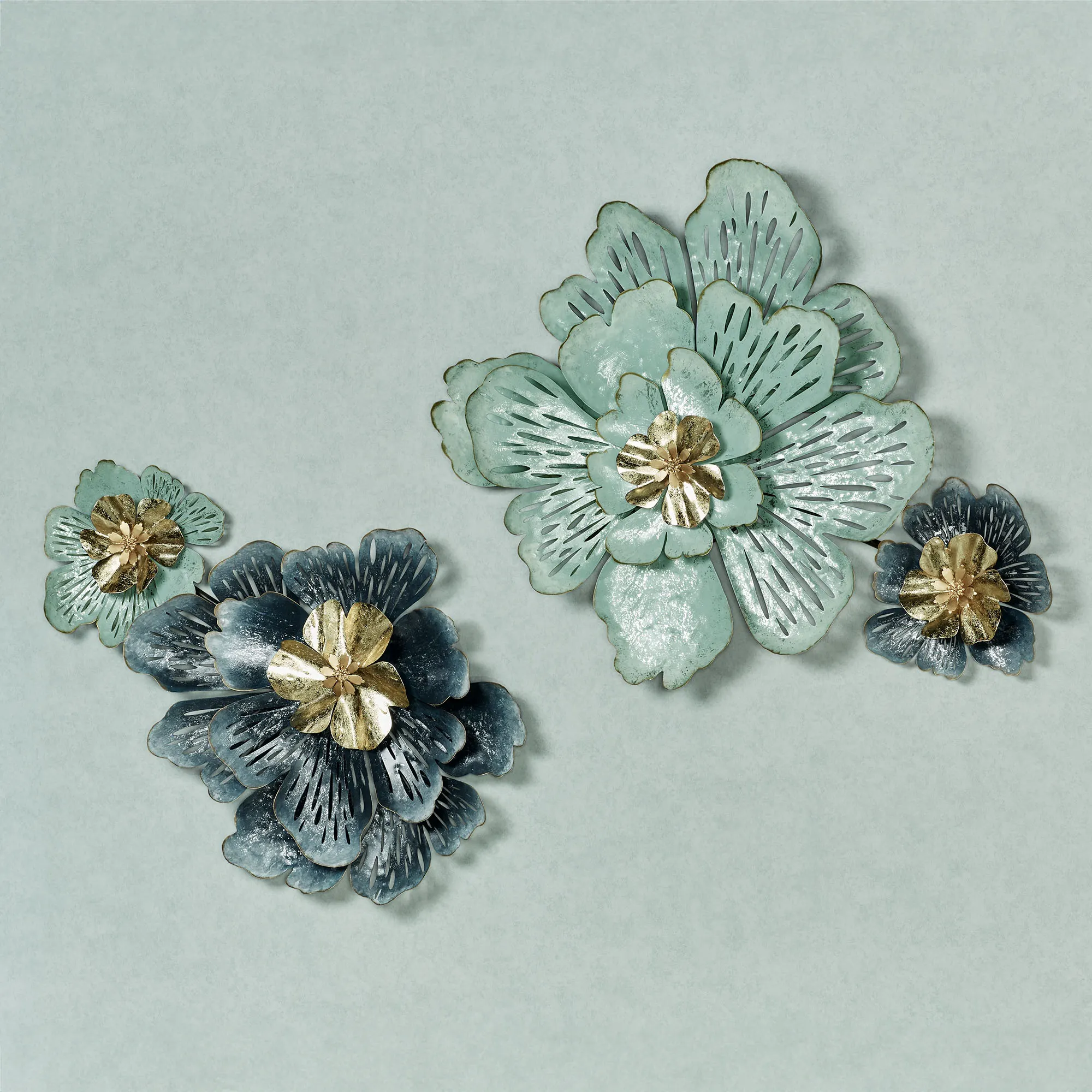 Grand Allure Light Aqua and Dark Blue Floral Metal Wall Art Set