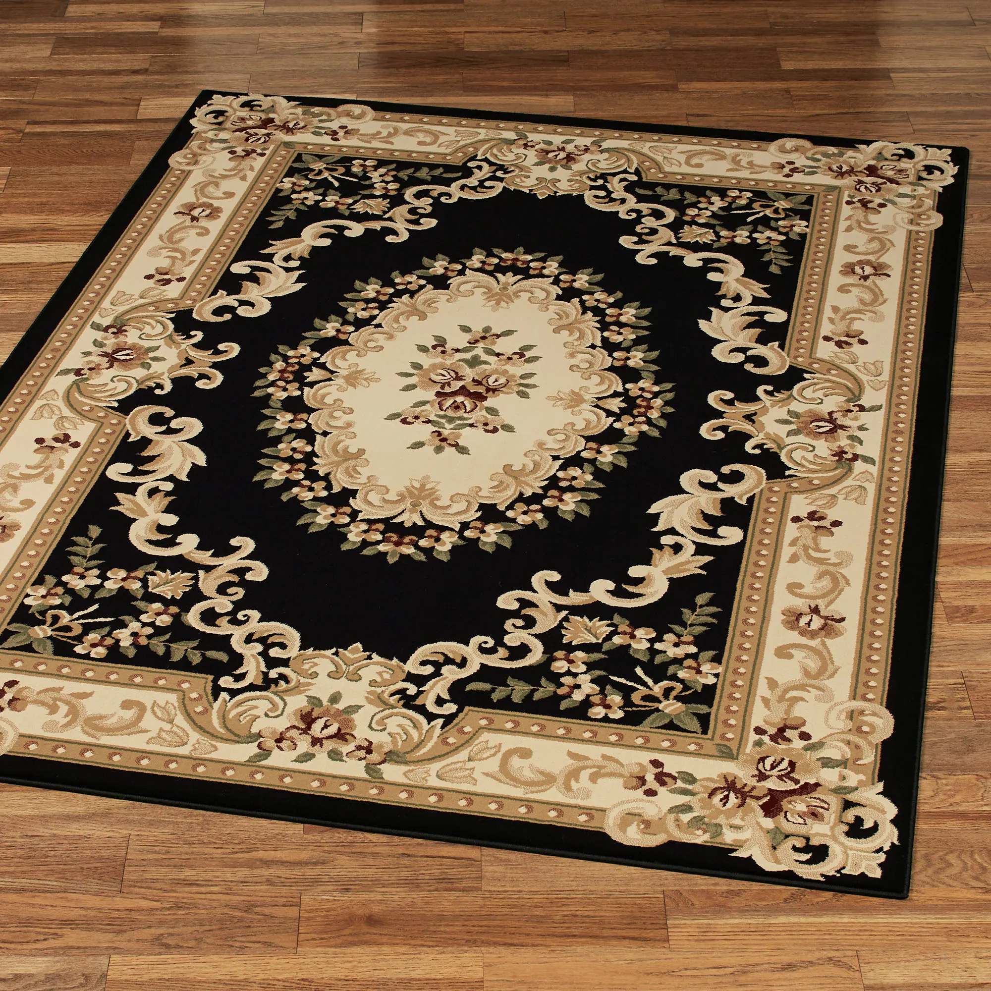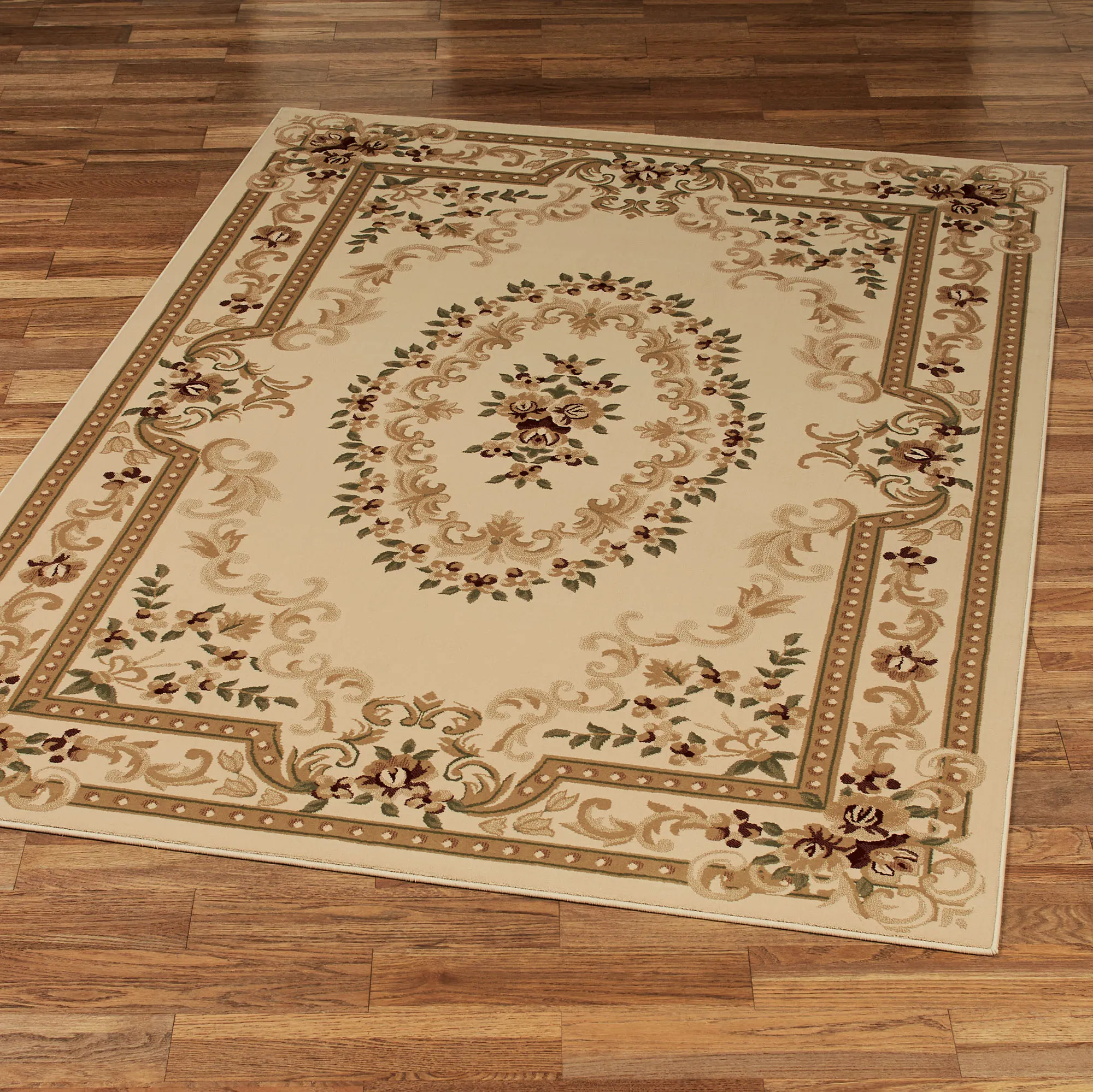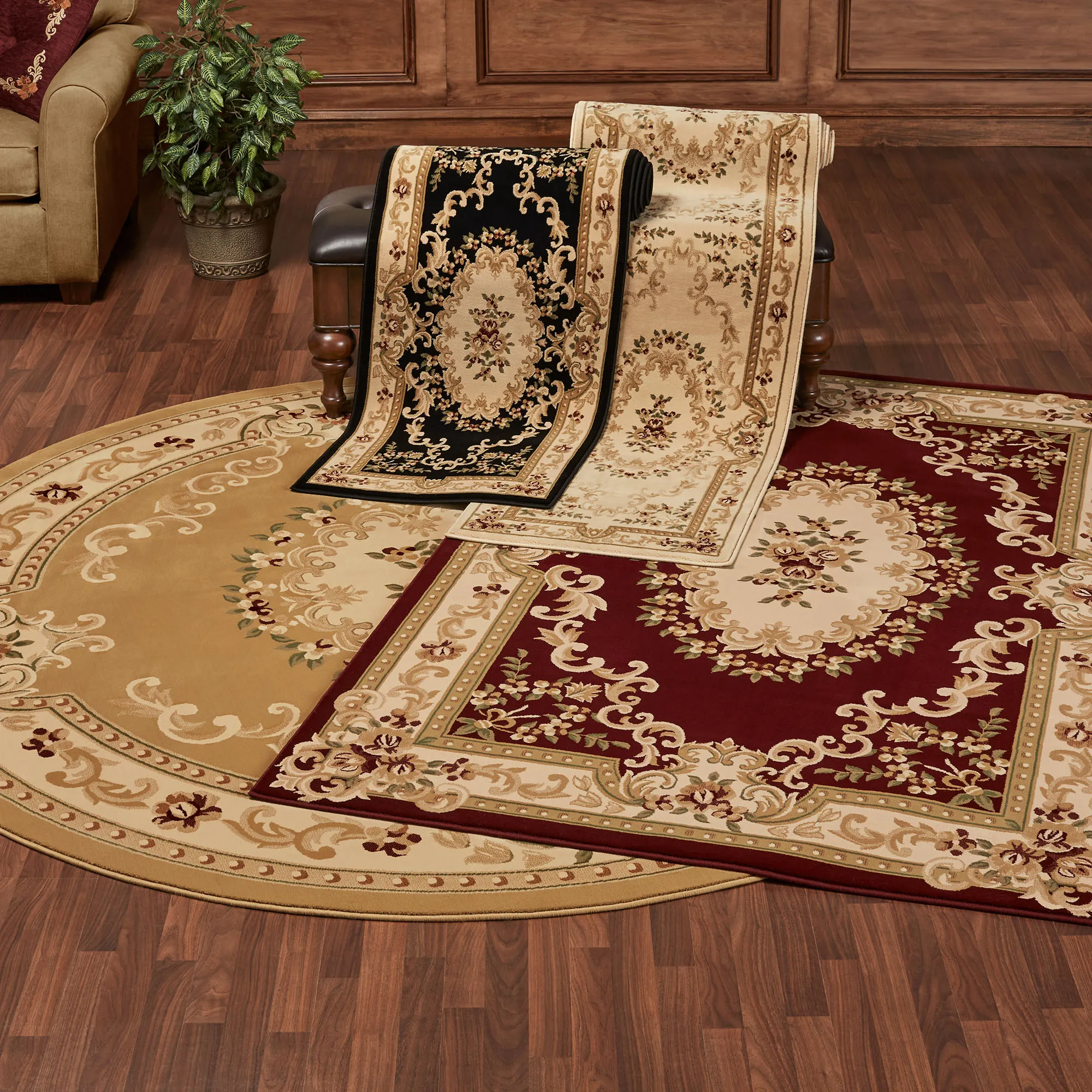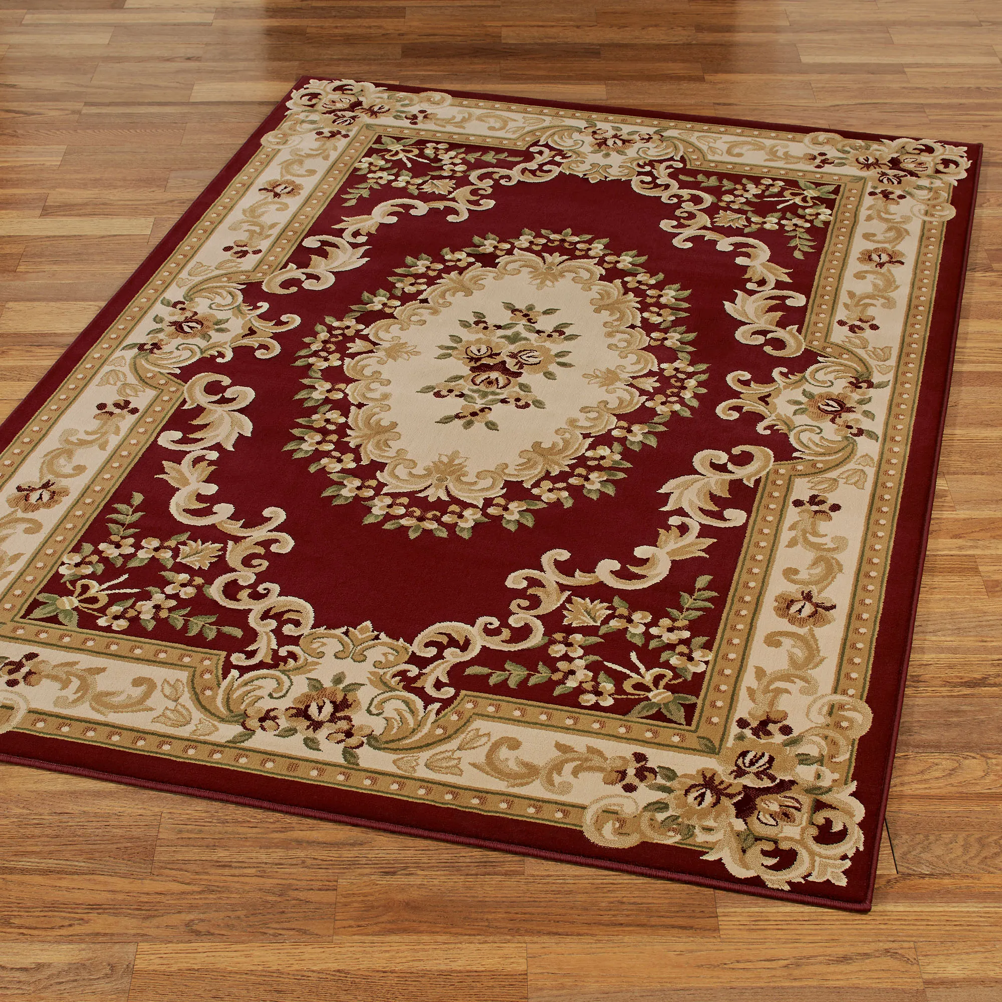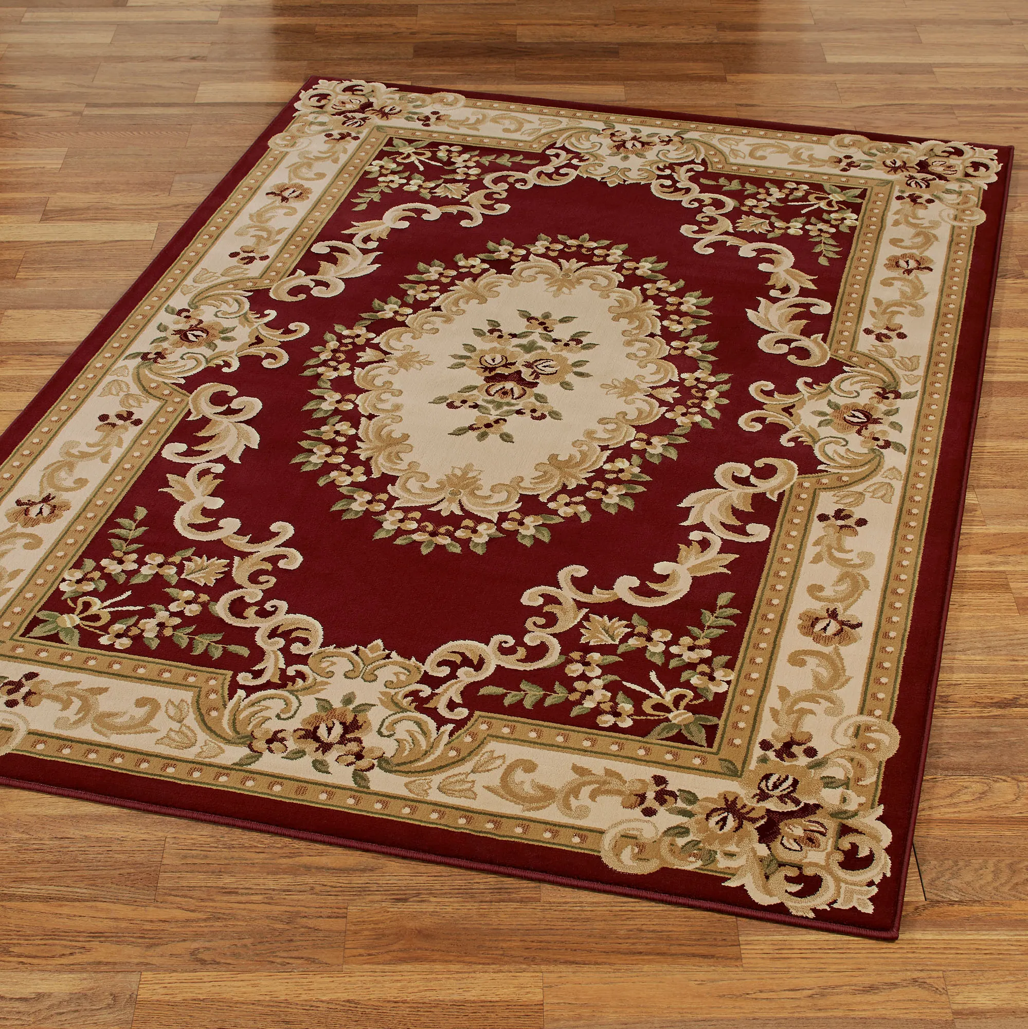 The Grand Aubusson Area Rug adorns a space with classic finery. Machine-made of polypropylene, the .32" thick area rug features a timeless Aubusson design on a solid color ground filled with lovely blossoming florals, graceful scrolls, and beaded ivory borders; all in stately shades of burgundy, beige, loden, gold, and camel. We recommend professional cleaning by a rug cleaner. Imported.