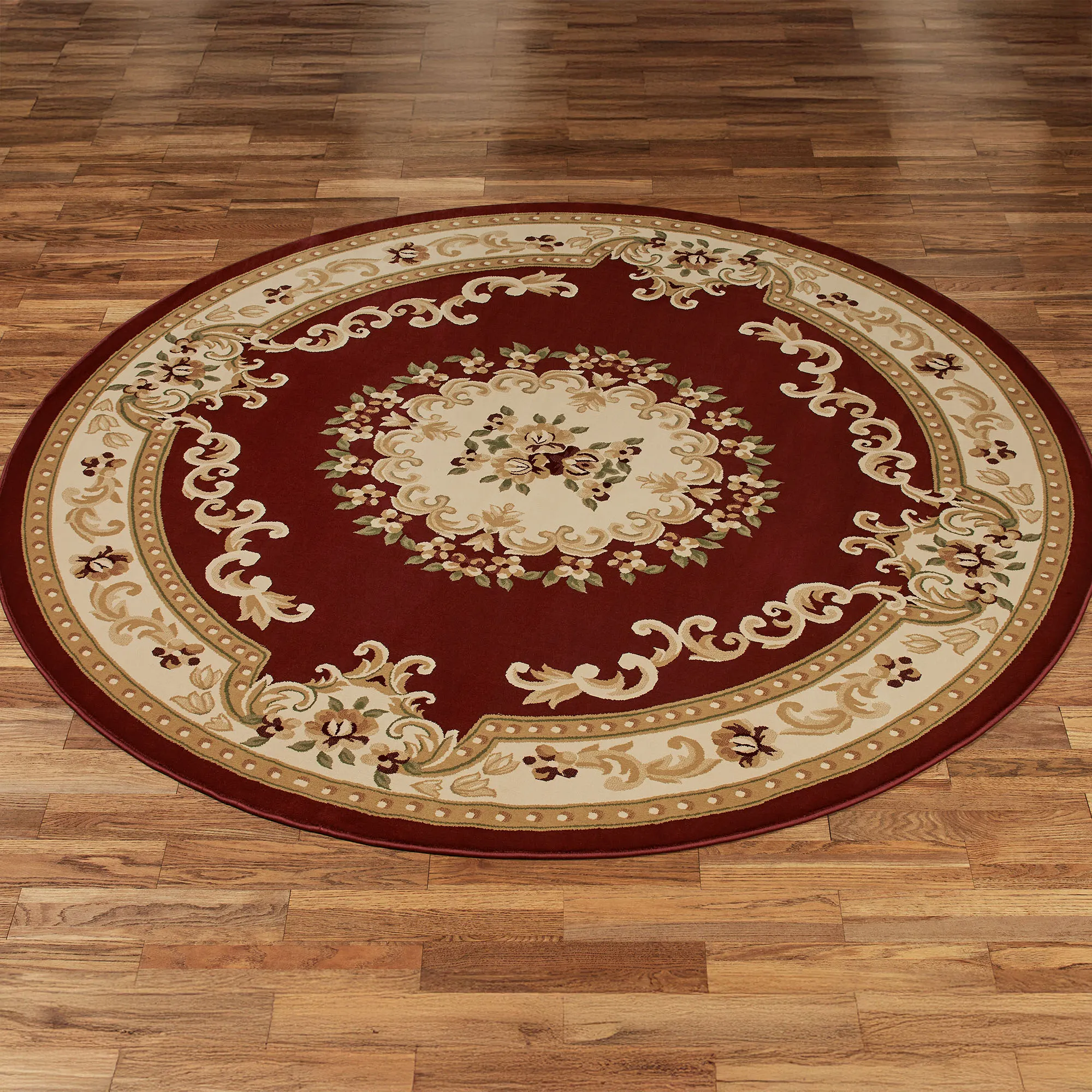 The Grand Aubusson Round Rug elevates a space with classic finery. Machine-made of polypropylene, the .32" thick rug features a timeless Aubusson design on a solid color ground filled with lovely blossoming florals, graceful scrolls, and beaded ivory borders; all in stately shades of burgundy, beige, loden, gold, and camel. We recommend professional cleaning by a rug cleaner. Imported.