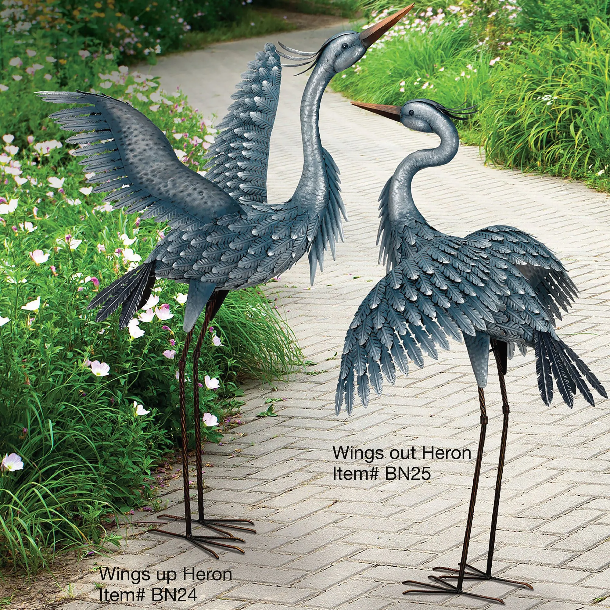 The Grand Blue Heron Wings Up Sculpture is made of metal.
