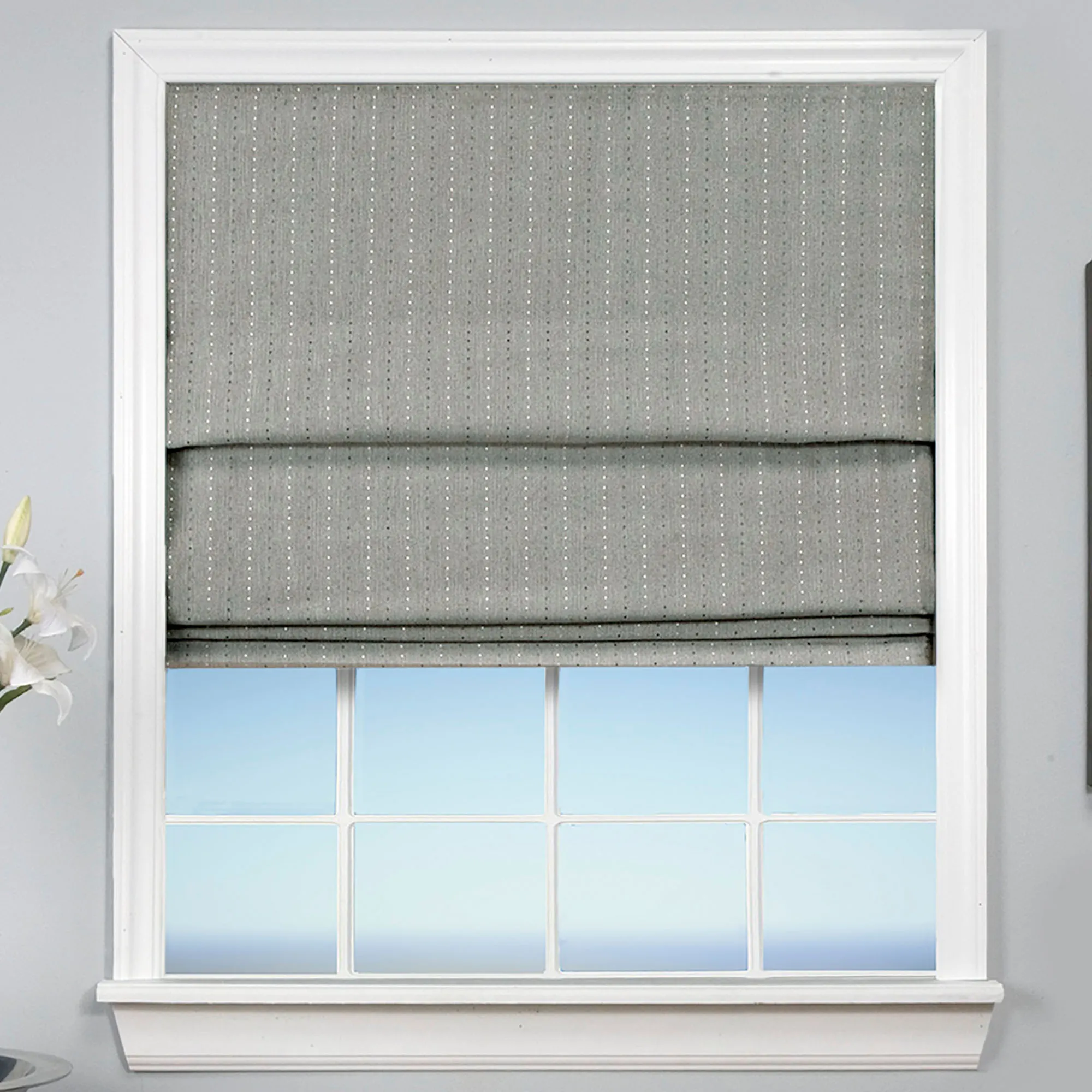 The Grand Pointe Room Darkening Cordless Roman Shade accents any window perfectly. This cordless, polyester jacquard shade features a dot pattern on a solid color background. Shade is energy-efficient with three layers that assist with room darkening and noise reduction. Simply raise or lower the hidden back handle with the spring roller system to glide the shade smoothly into position. Installation instructions and hardware are included. Shade is 63"L. Spot clean. Imported.