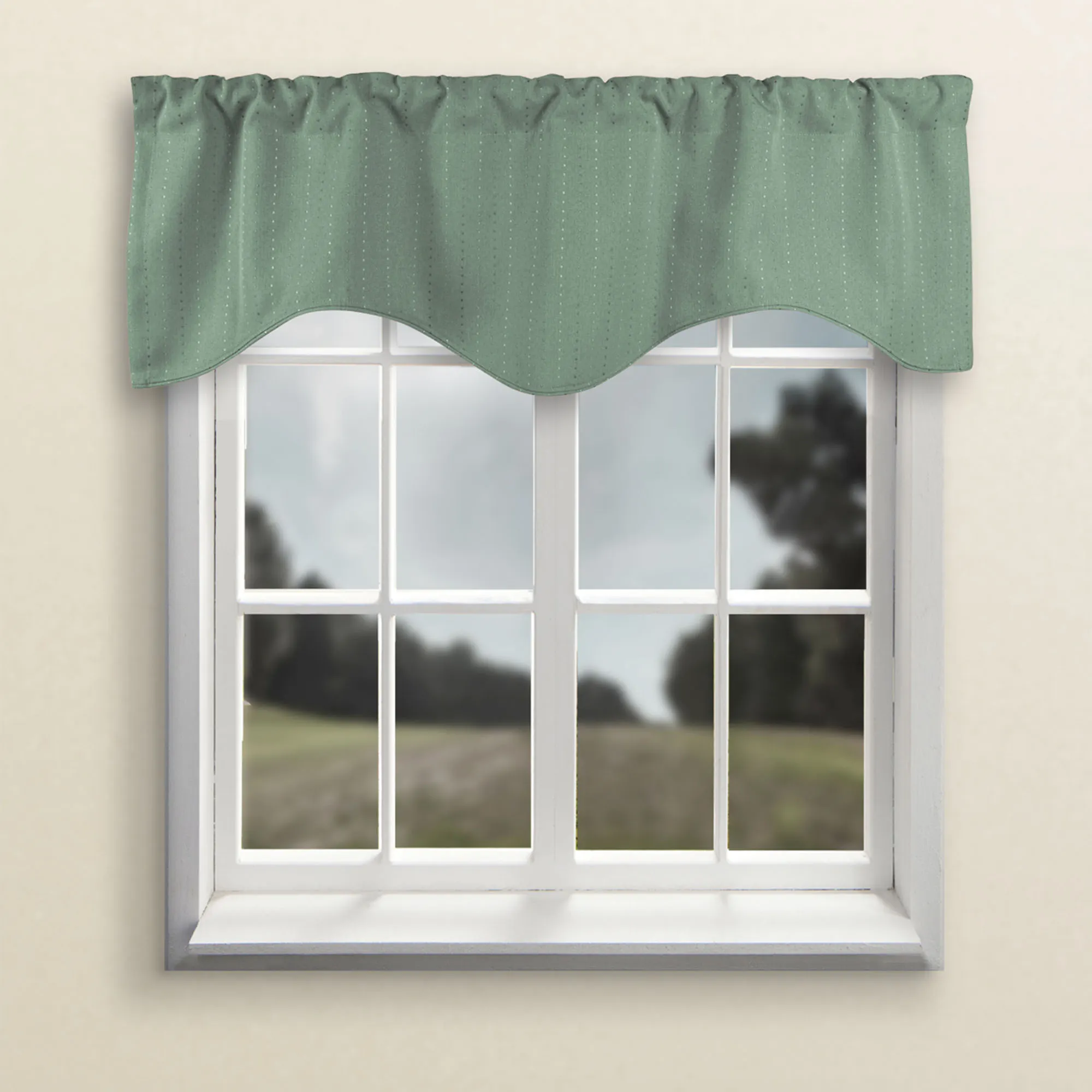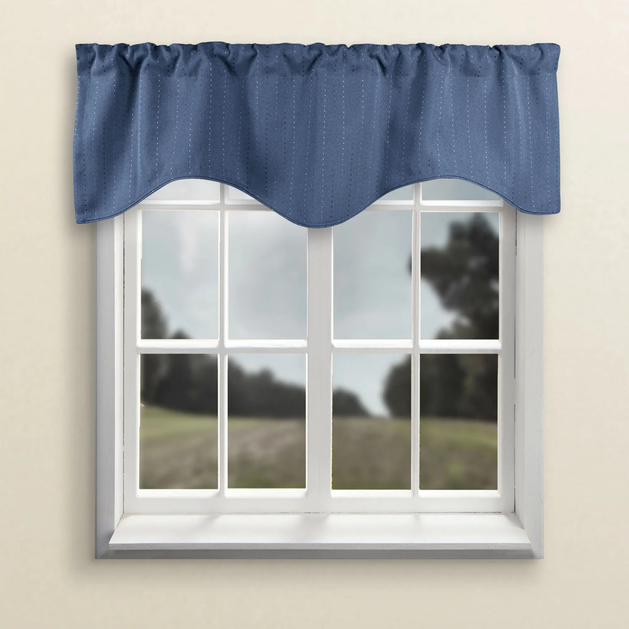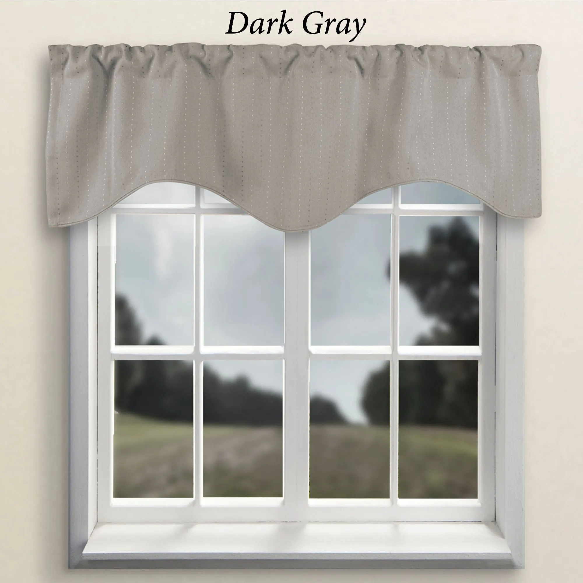 The Grand Pointe Shaped Valance is solid color, jacquard-woven, polyester with a vertical, tone-on-tone stitched dot design. Window valance has layers of black yarn sandwiched between layers of colored yarns. Shaped valance has a 3" rod pocket and is 54"Wx17"L. Machine wash. Imported.
