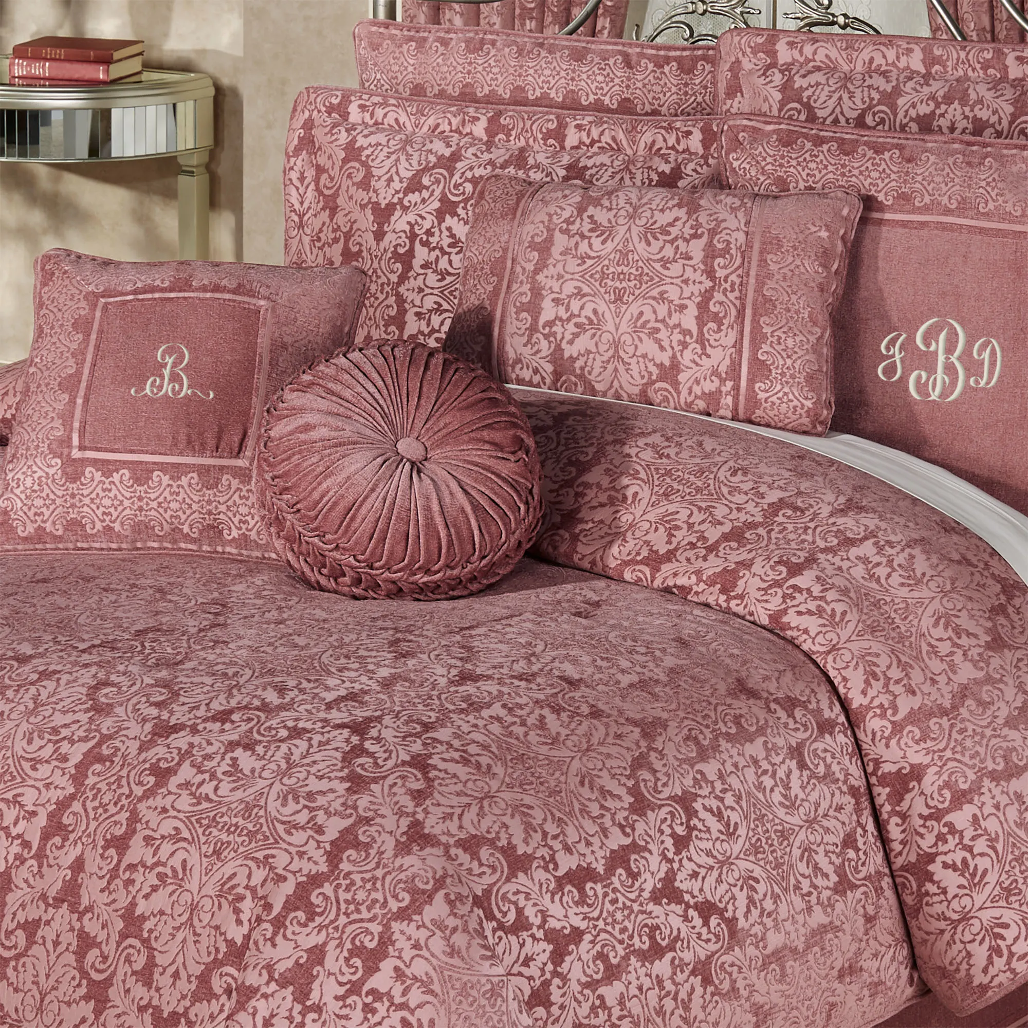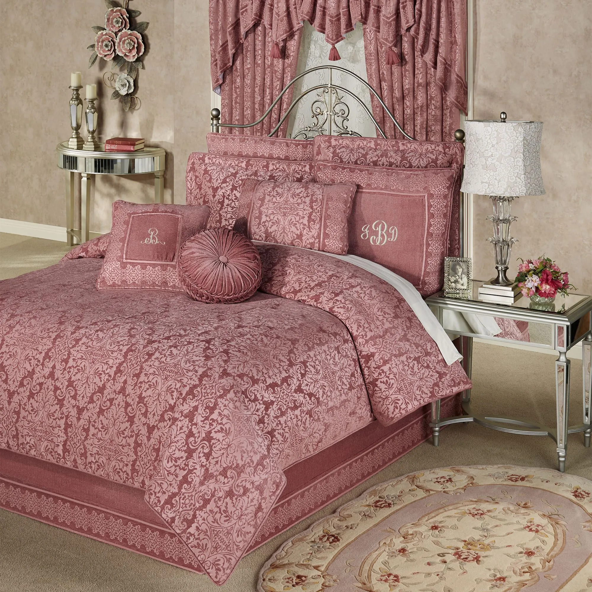 Splendid damask designs and pieced medallion motifs showcase a "Grandview" of sumptuous style. This ash rose, polyester bedding features woven-jacquard patterns on a chenille solid color background.