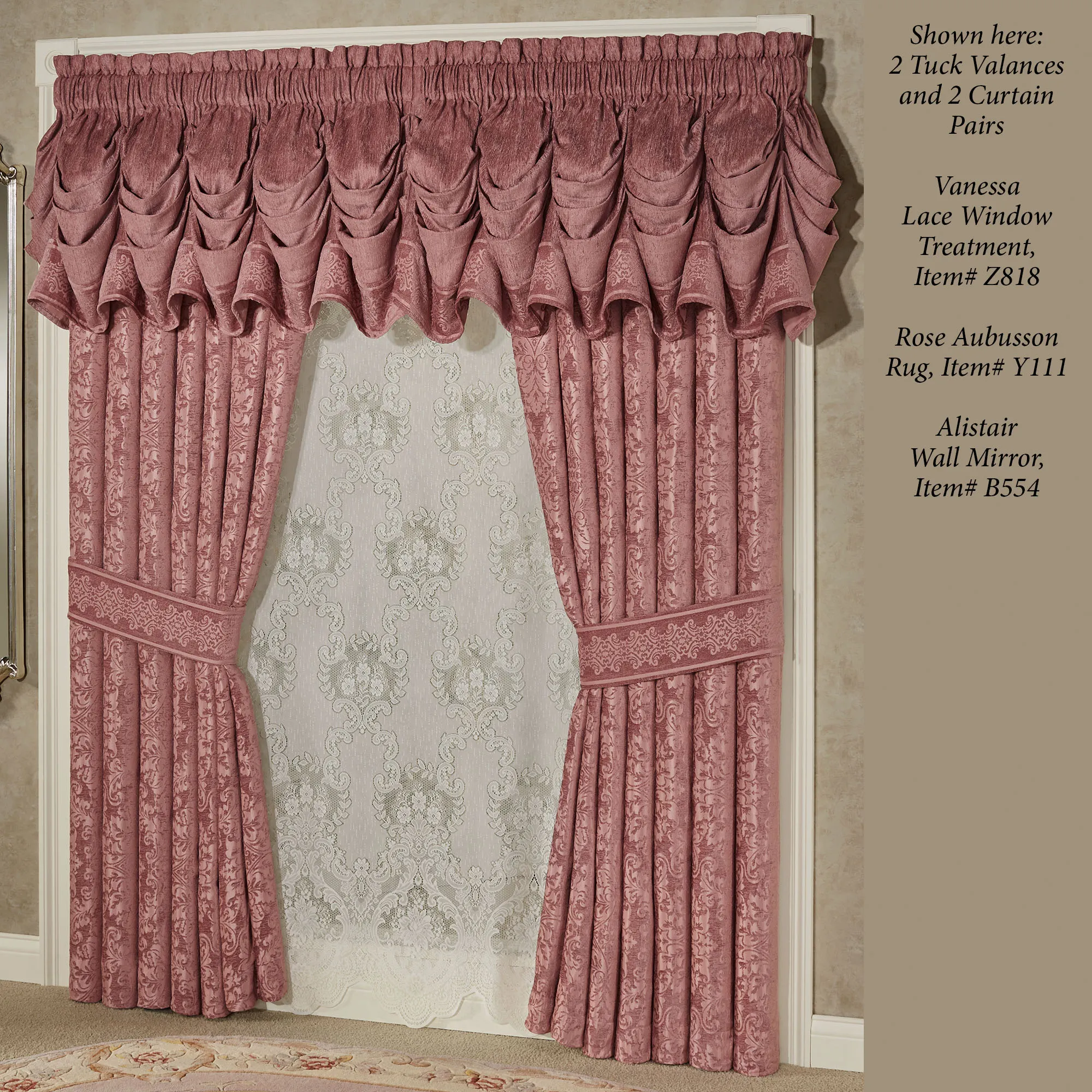 Window Treatments have 3" rod pockets. Tailored, lined Curtains have damask designs and include tiebacks. Curtains are available in two lengths. Tuck Valance is solid with medallions. Lined Swag Valance Pair has damask designs and medallions. Each lined Ascot Valance has damask designs, medallions, and a 4"L tassel on the end. Measurement does not include the tassel.
