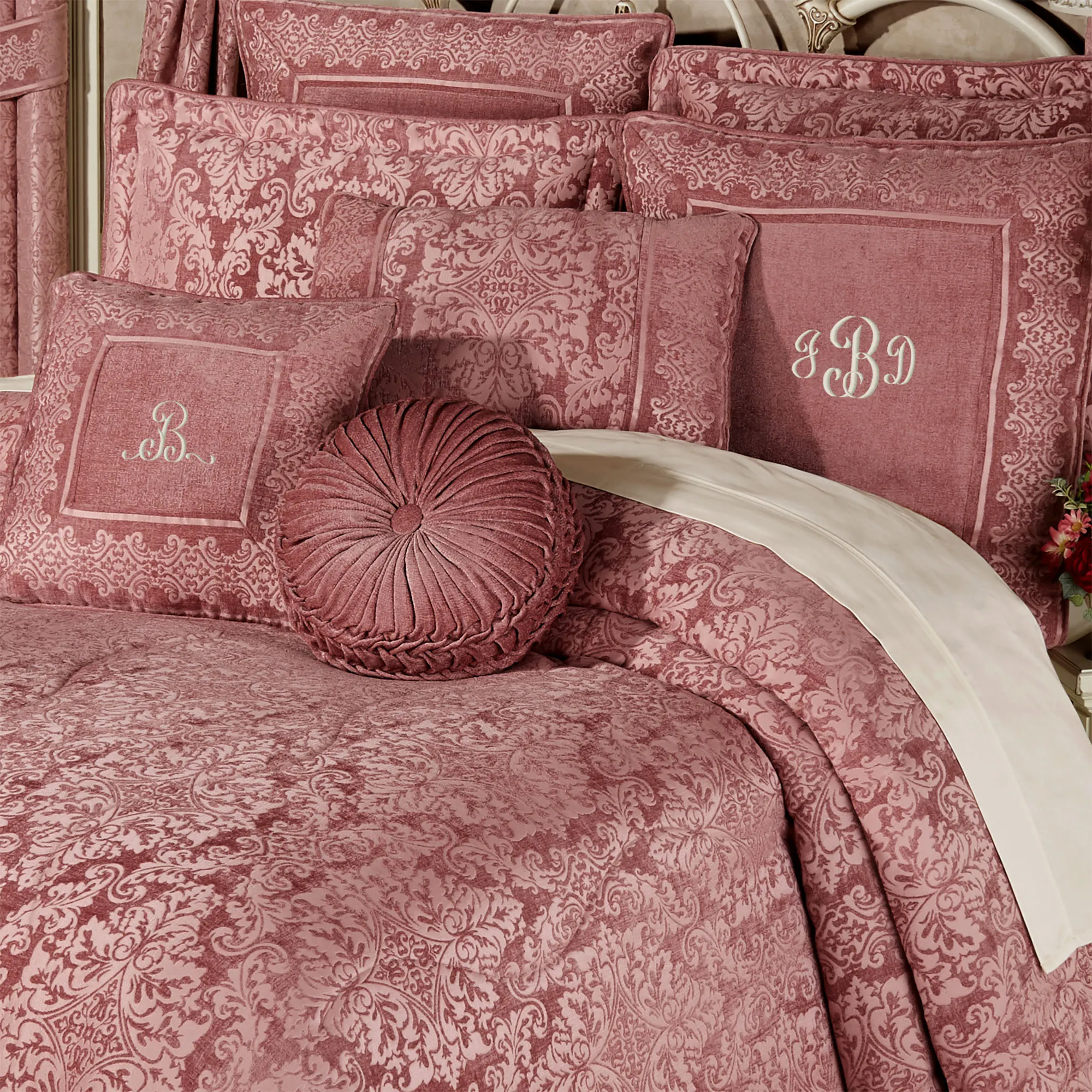 Splendid damask designs and pieced medallion motifs showcase a "Grandview" of sumptuous style. This ash rose, polyester bedding features woven-jacquard patterns on a chenille solid color background.