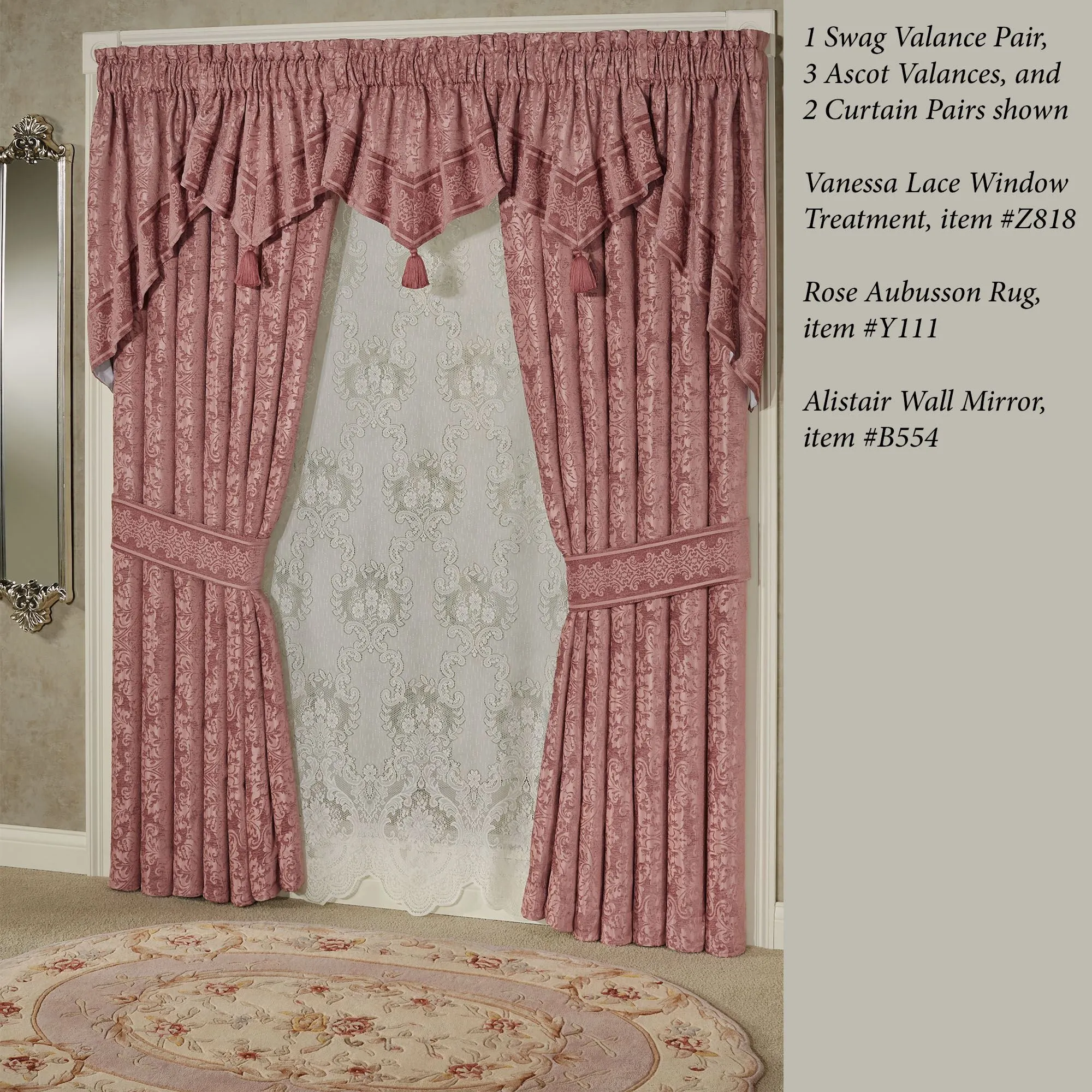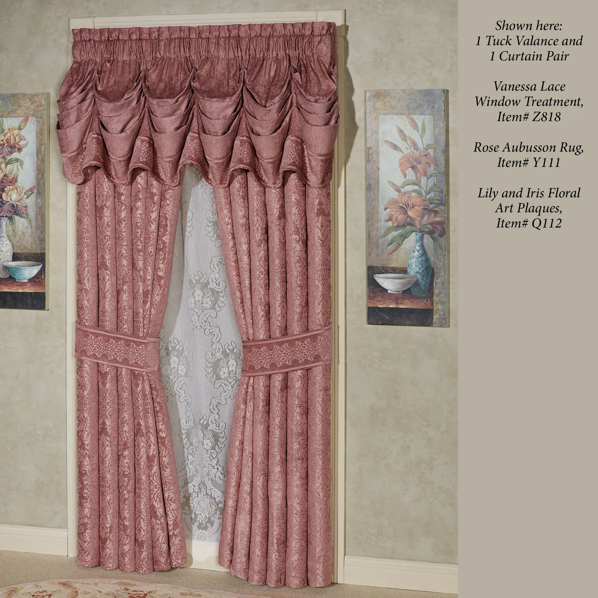 Window Treatments have 3" rod pockets. Tailored, lined Curtains have damask designs and include tiebacks. Curtains are available in two lengths. Tuck Valance is solid with medallions. Lined Swag Valance Pair has damask designs and medallions. Each lined Ascot Valance has damask designs, medallions, and a 4"L tassel on the end. Measurement does not include the tassel.