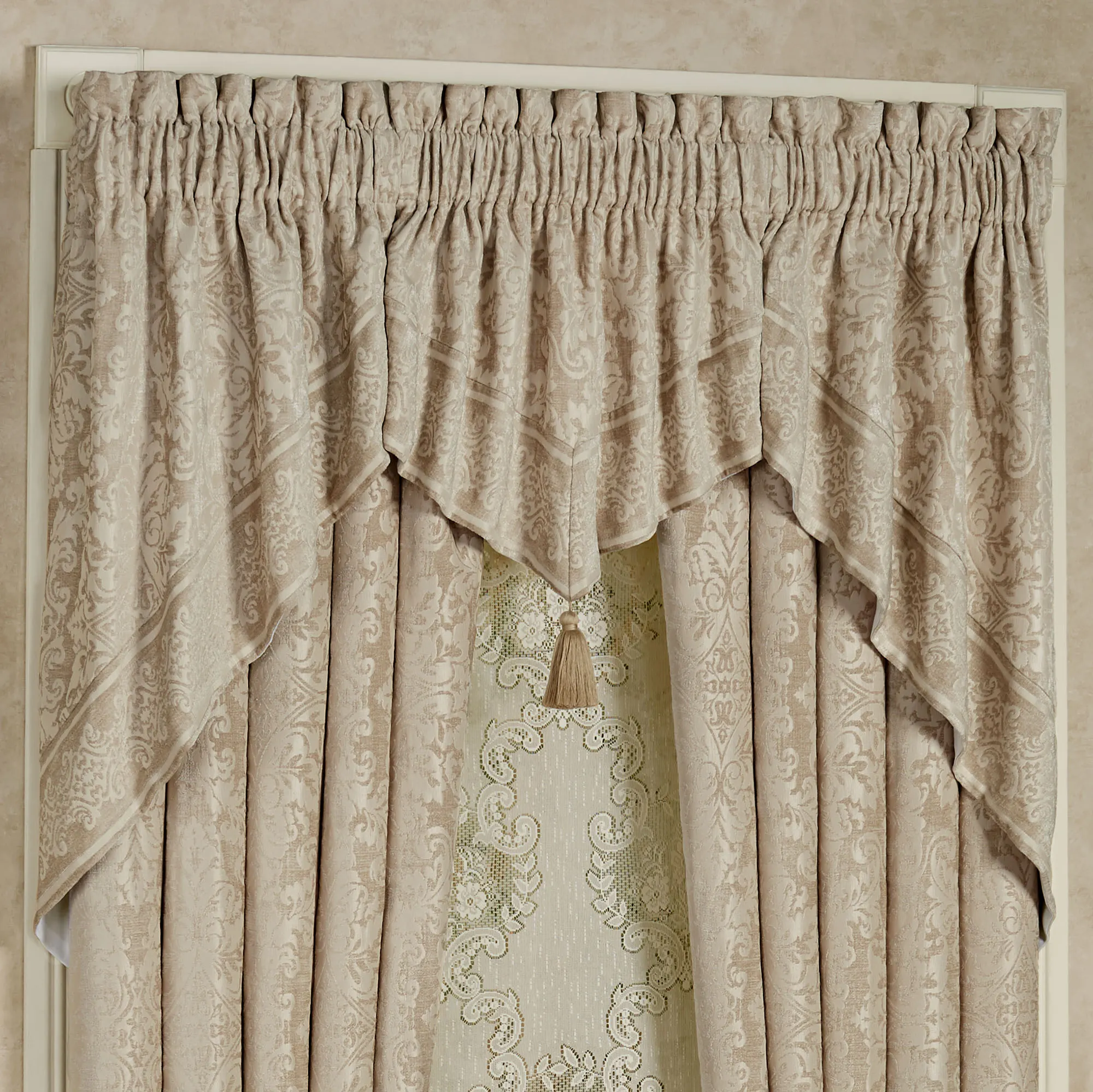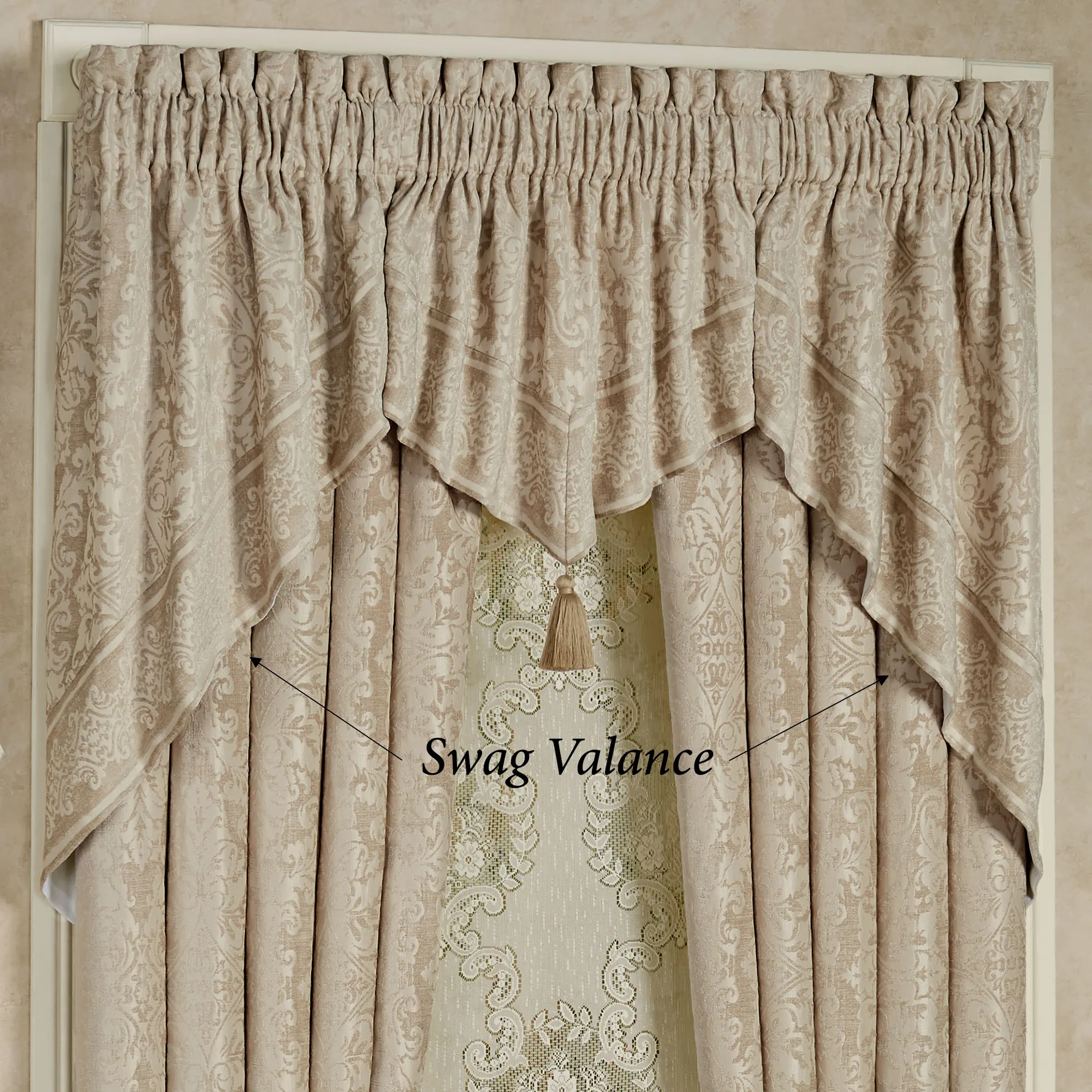 Showcase sumptuous style in your room with the Grandview Champagne Damask Window Treatment. Polyester window treatment features a woven-jacquard damask pattern on a chenille solid color background. Lined window treatment has 3" rod pockets. Swag Valance Pair is still available; the Ascot Valance and Curtain Pair are no longer available. Swag Valance Pair has pieced medallion trim. Each Ascot Valance has pieced medallion trim and a 4"L tassel on the end. Measurement does not include the tassel. Tailored Curtains have damask designs and include tiebacks. Machine washable. Imported. The curtain pair width is the total width of two panels together.