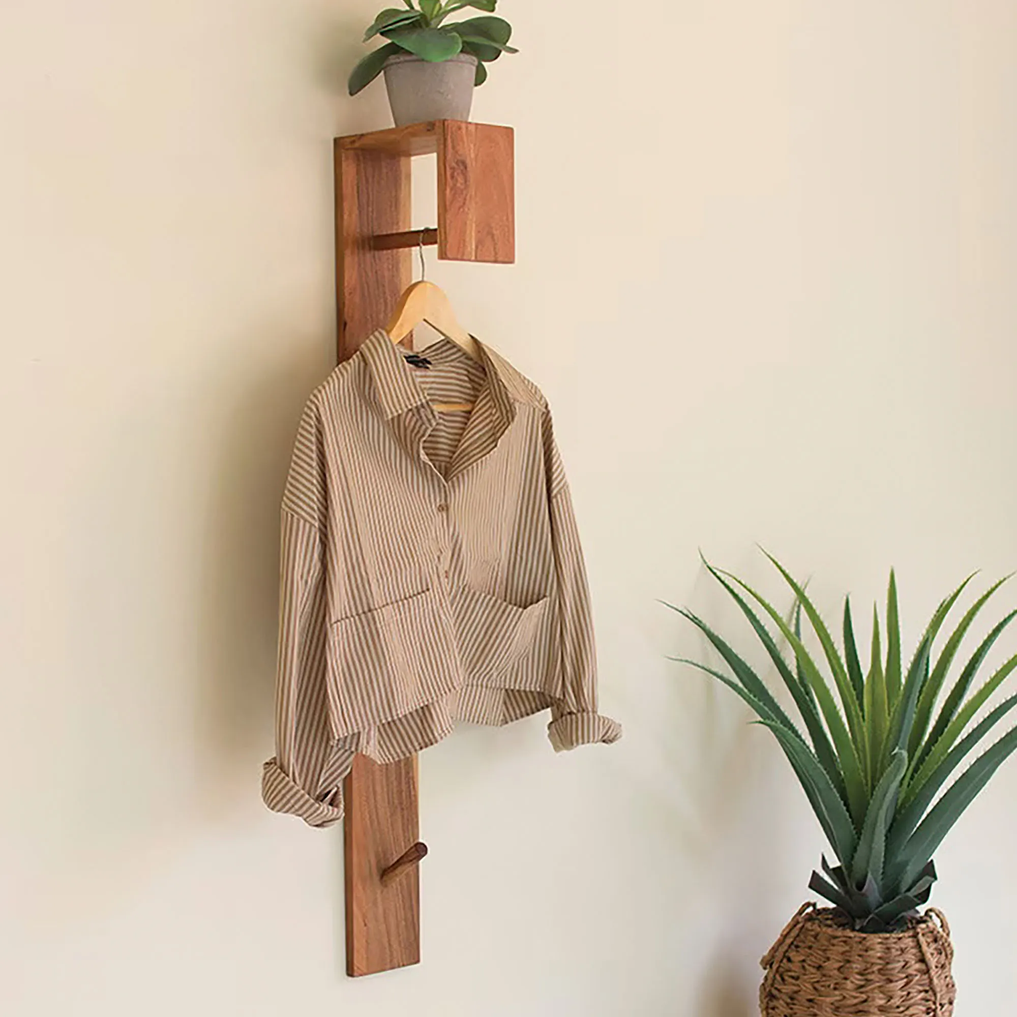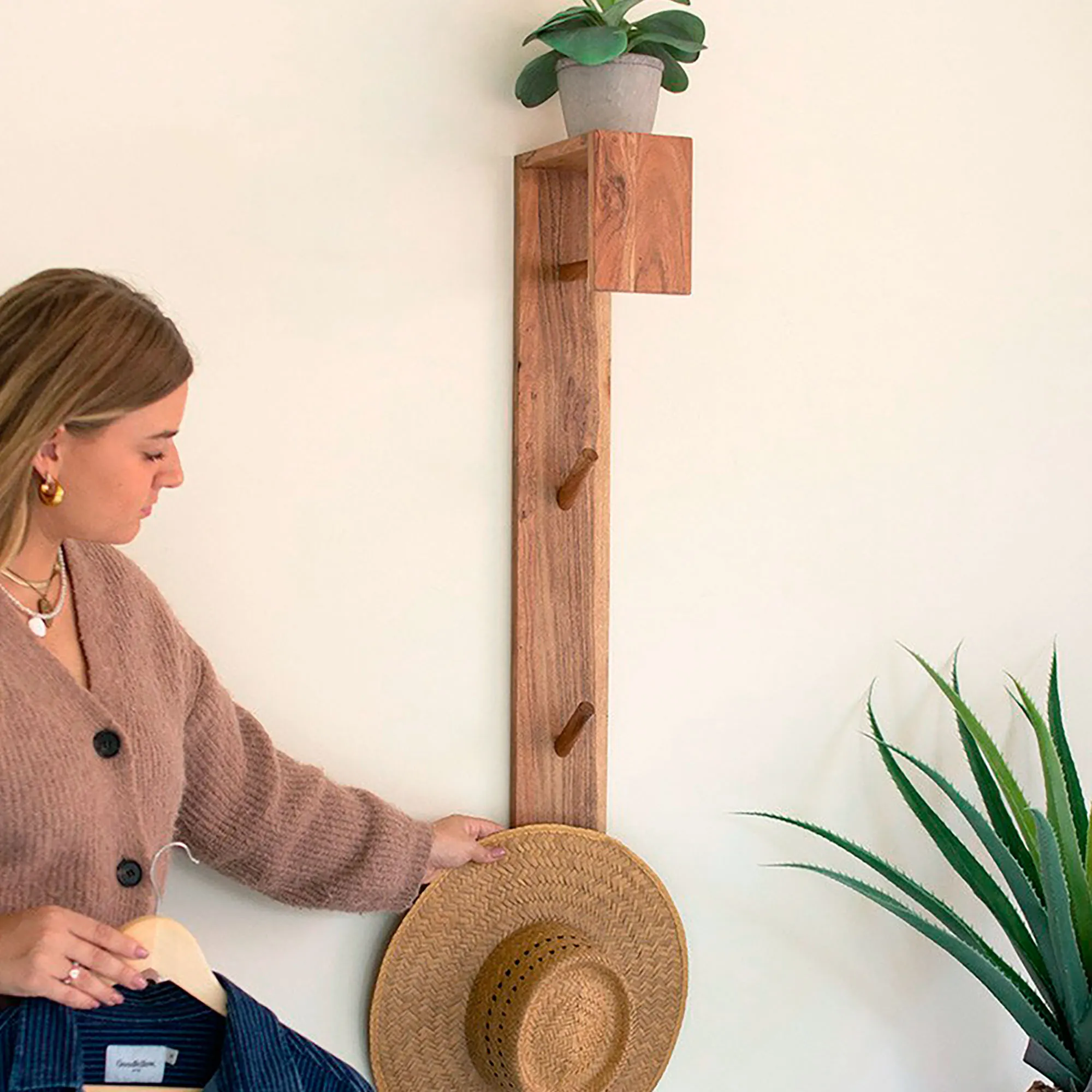 The Granger Wall Mini Closet Rack is the perfect addition to a dressing area, guest room, or smaller space. Stained in a light brown hue, the simplistic wood rack features three pegs and a dimensional rod and shelf at the top for organizing outfits. Each 3.25"D peg is spaced 10.5" apart to easily hang hats, purses, or accessories. Overall, the wall storage organizer measures 4.5"Wx8"Dx42"H.