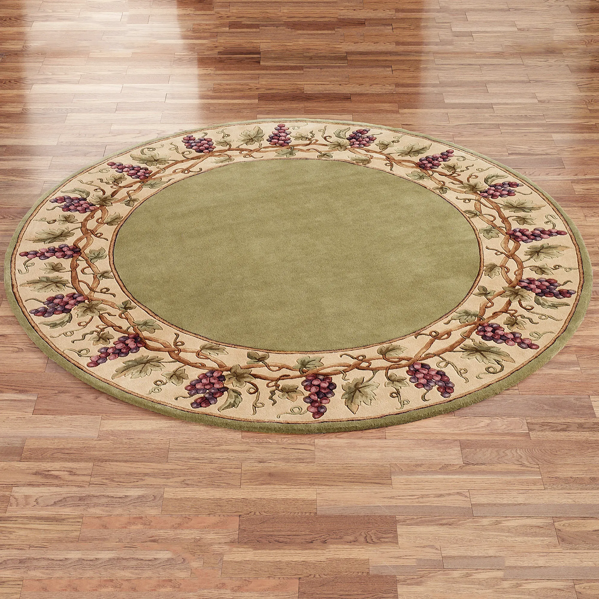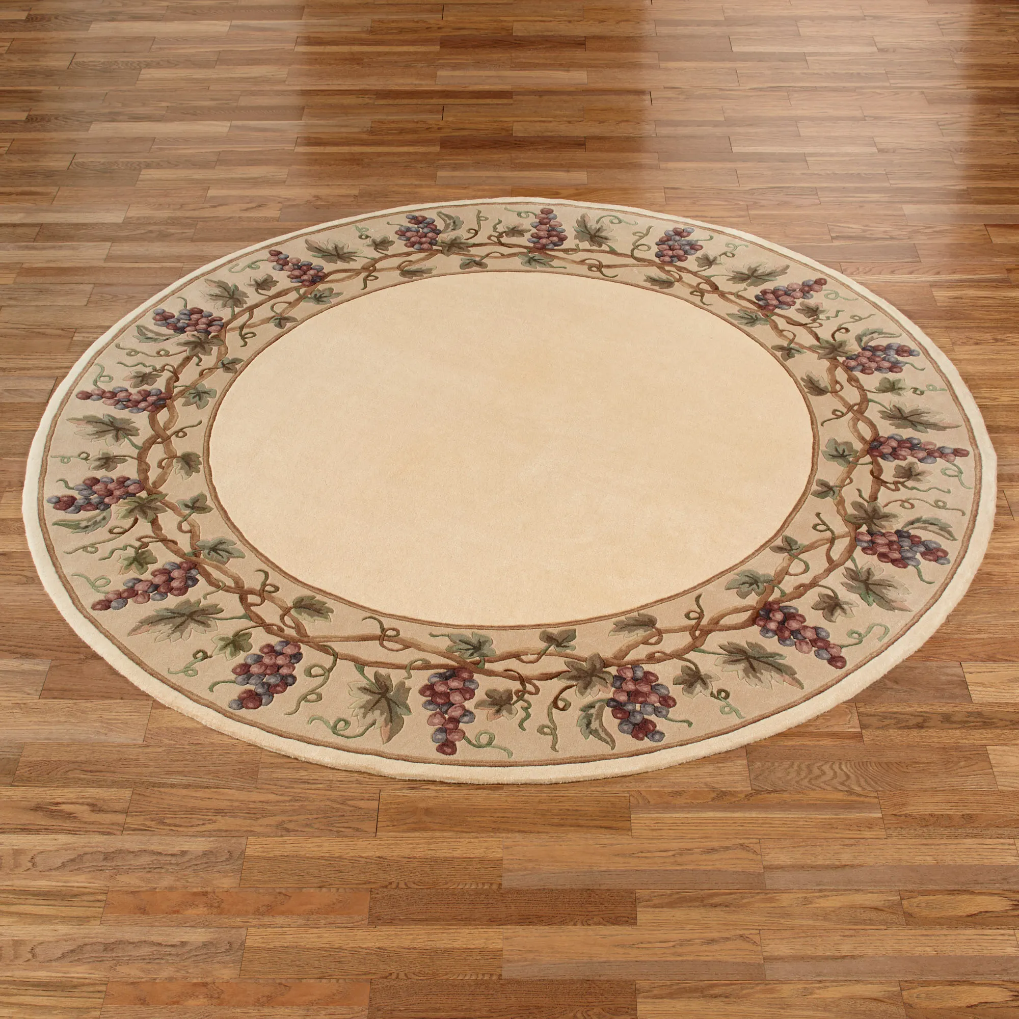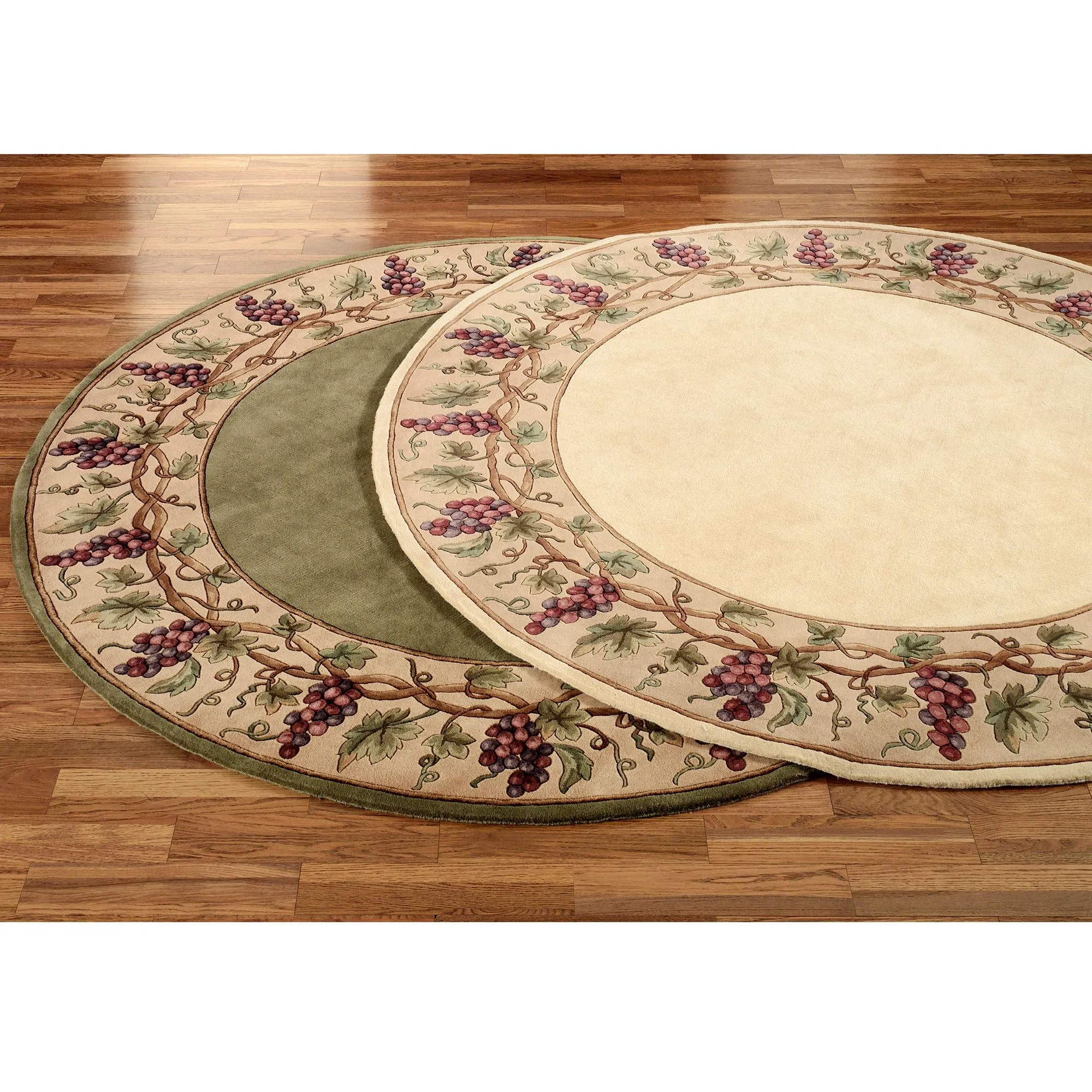 The Napa Grape Border Round Rugs, .5" thick, are hand-tufted from pure wool. The solid color fields have subtle ribbed detailing and are framed by an intertwined grapevine. The luscious fruit bounty has plump purple grapes in perfect-sized clusters. Tiny taupe bands encase the borders; handcarving adds depth and dimension to this vintage design. Accent colors include shades of tulipwood, brown, wineberry, loden frost, and verdant green. Backing is cotton-covered latex. We recommend professional cleaning by a rug cleaner. Imported.