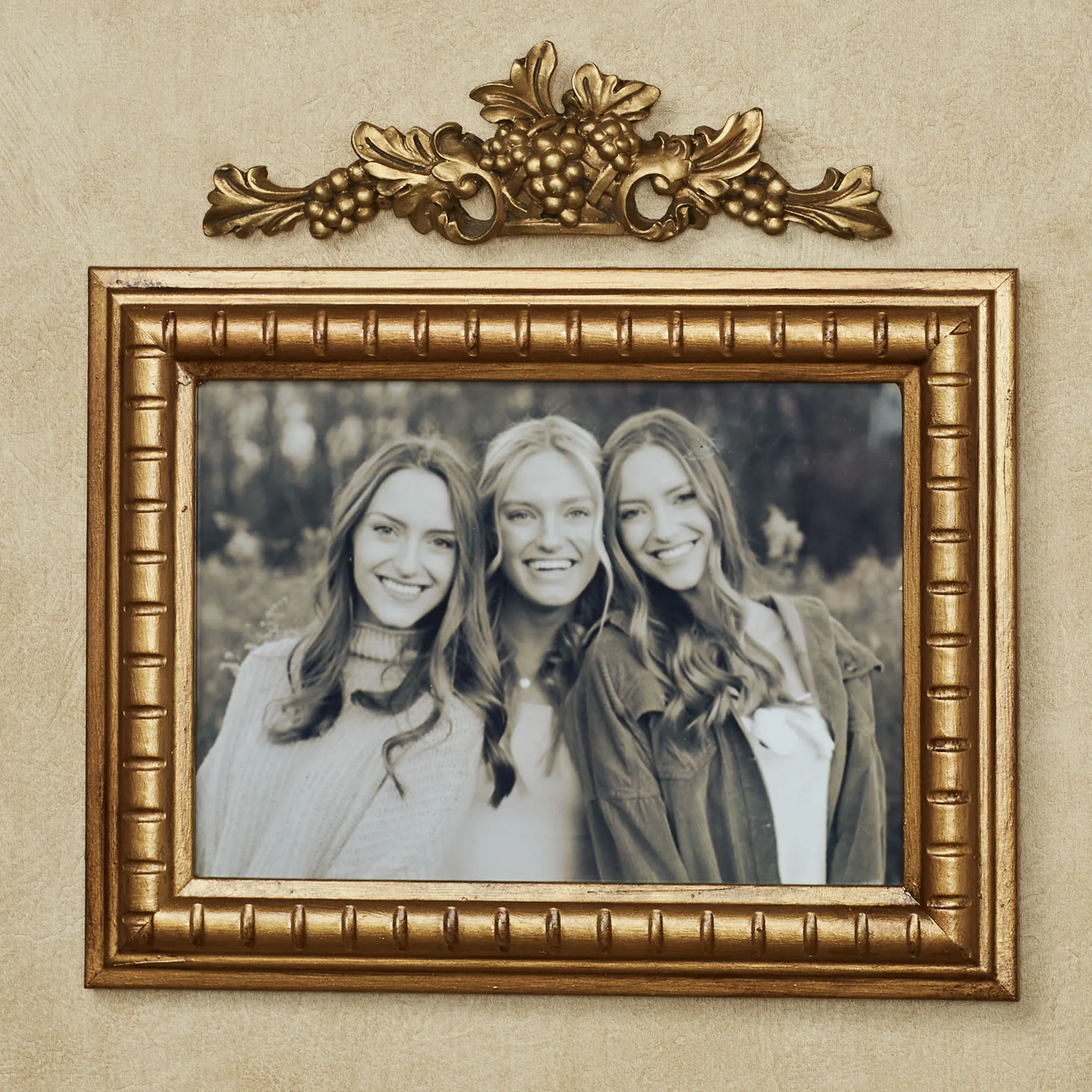The Grape Picture Topper adds class to a vintage picture or mirror. Made from resin and finished in gold, this design by Glynda Turley(C) is a basket full of grapes and leaves tumbling over in abundance. More leaves and clusters form scrolls to the sides. Keyhole slot on back for easy hanging. Small, 6.5"x2"; Medium, 9.5"x2.5".