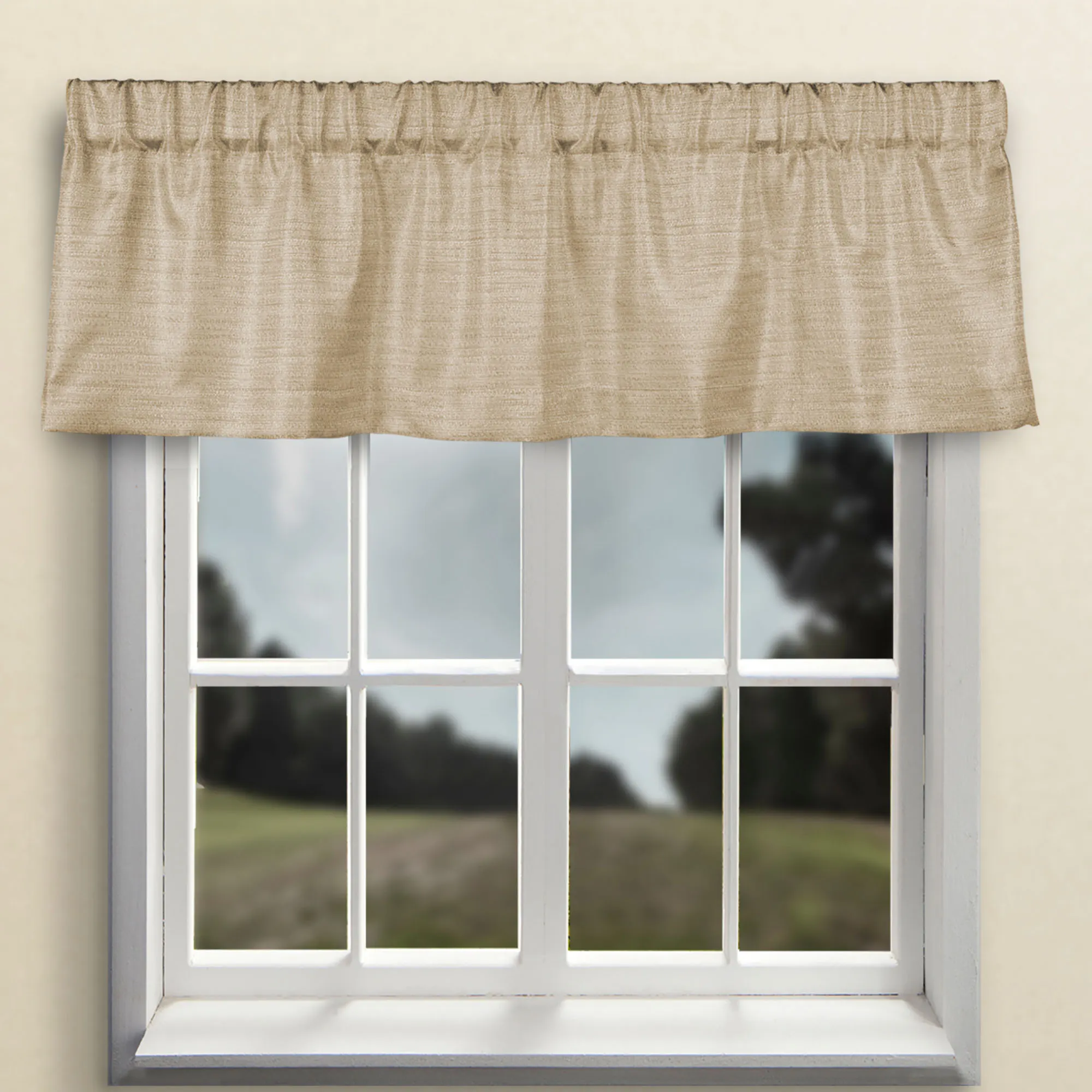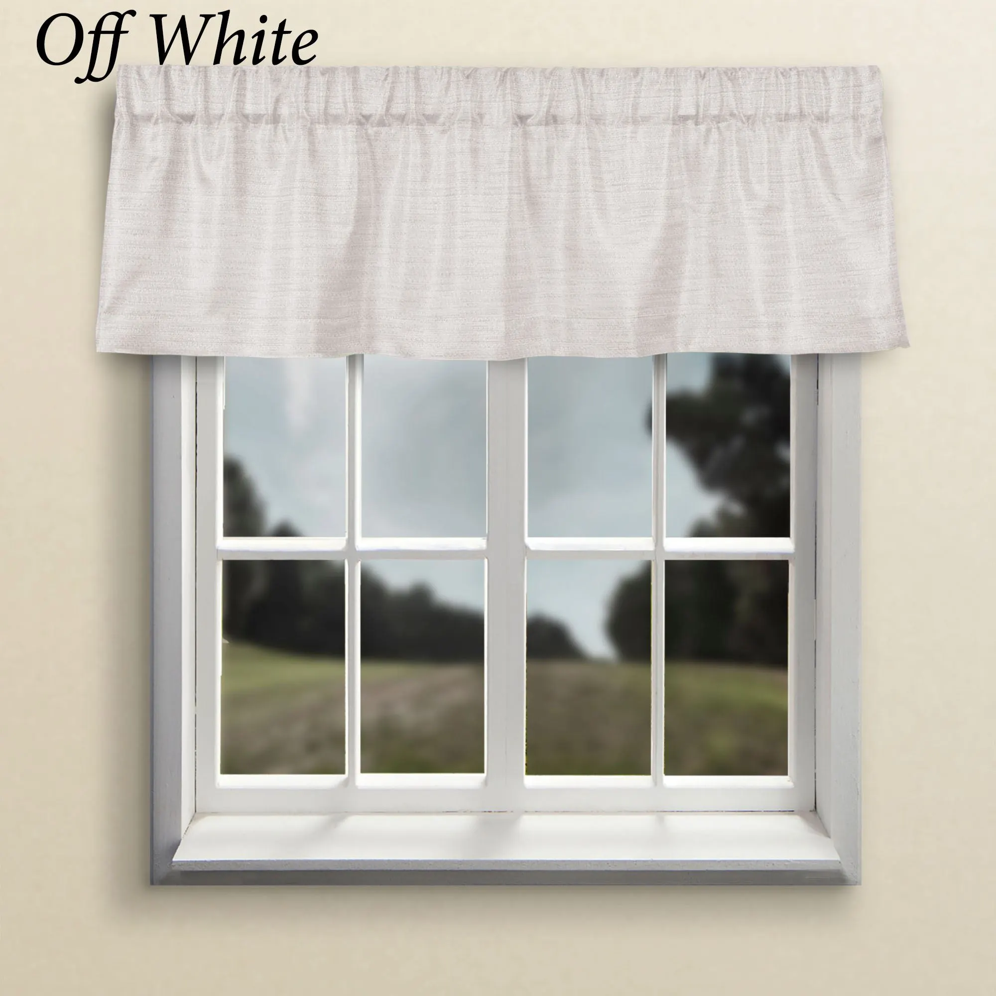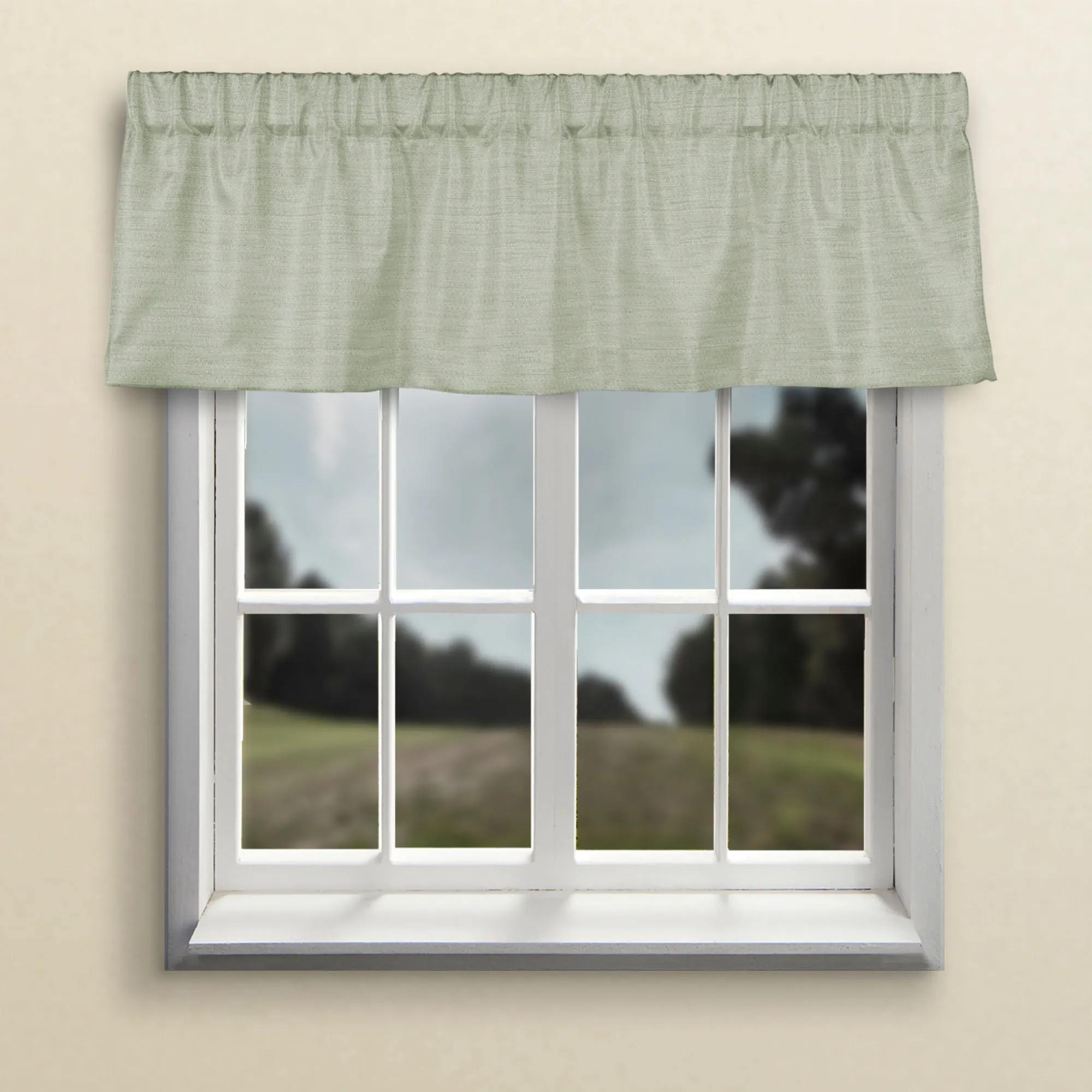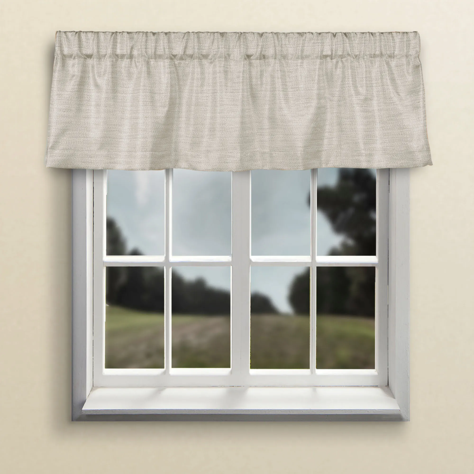 Adorn your window with the natural woven texture of Grasscloth with this unique valance. Made of polyester, this valance is a solid color with a slight metallic sheen and polyester/cotton lining. Specify Parchment, Champagne, Gray, Midnight Blue, Off-White, or Sage. Tailored valance has a 3" rod pocket and is 54"Wx15"L. Machine washable. Imported.