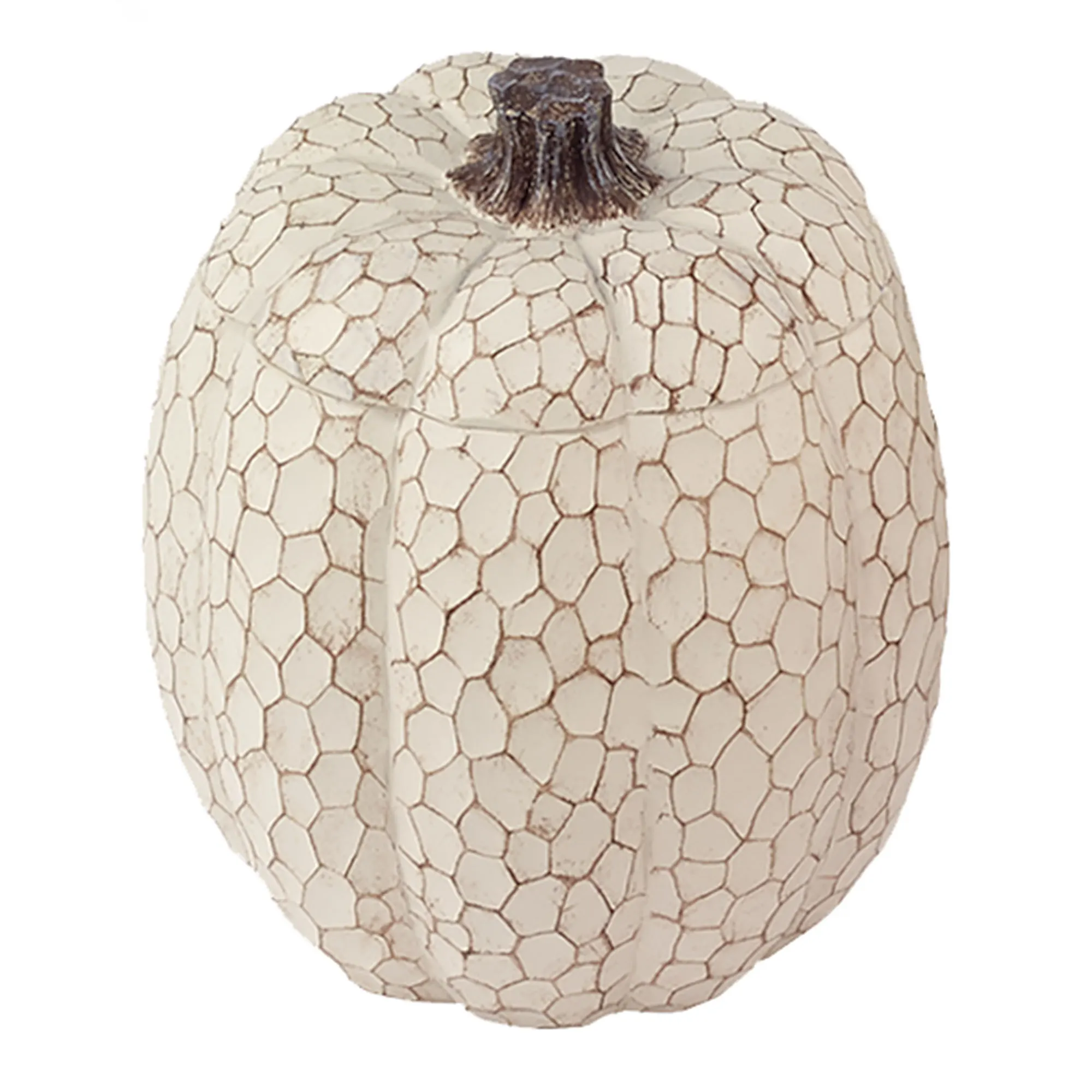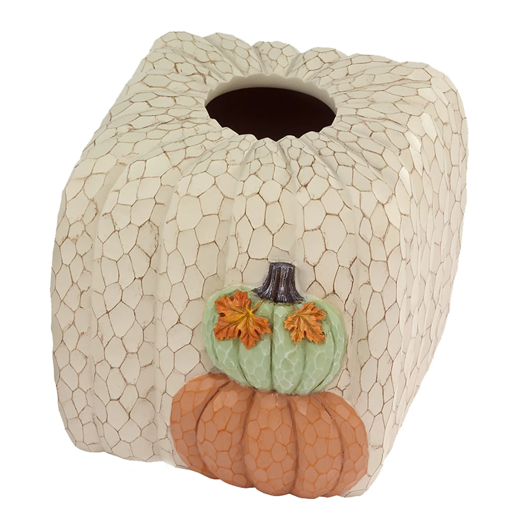 The Grateful Patch Fall Bath Accessories decorate with autumnal splendor. These handpainted, textured resin accessories have crackle designs, and most have a stacked pumpkin design. Ivory items have light brown crackle designs; all others are color-matched. Colors on most include ivory, light green, and orange. Specify Covered Jar, Lotion/Soap Dispenser, Tissue Cover, Toothbrush Holder, Tray, or Wastebasket.