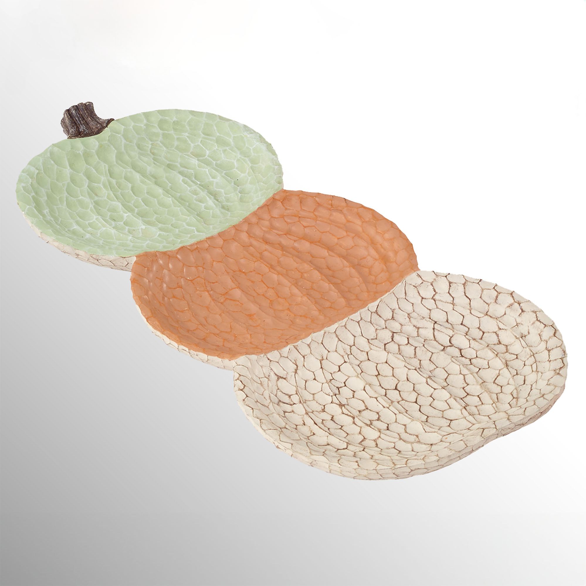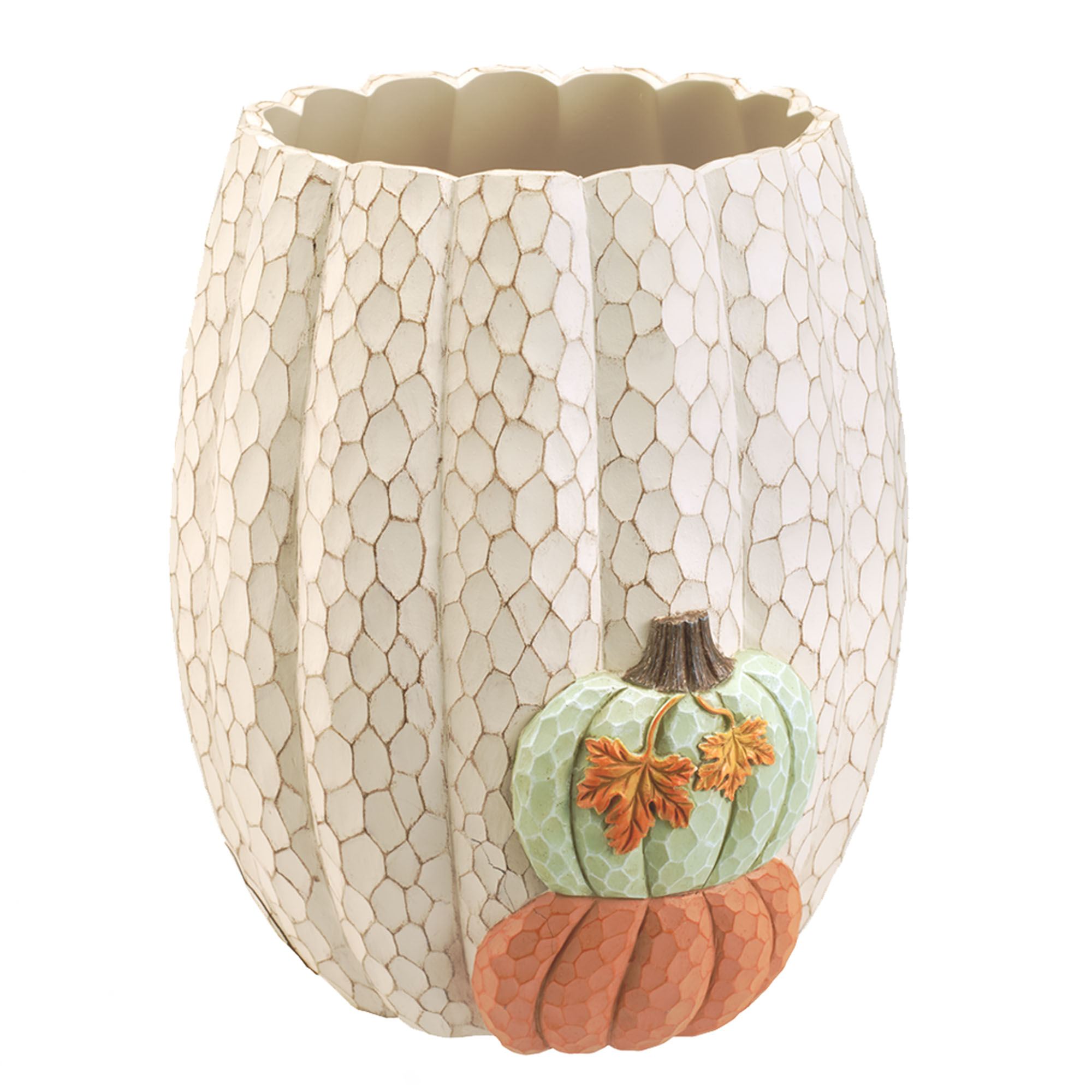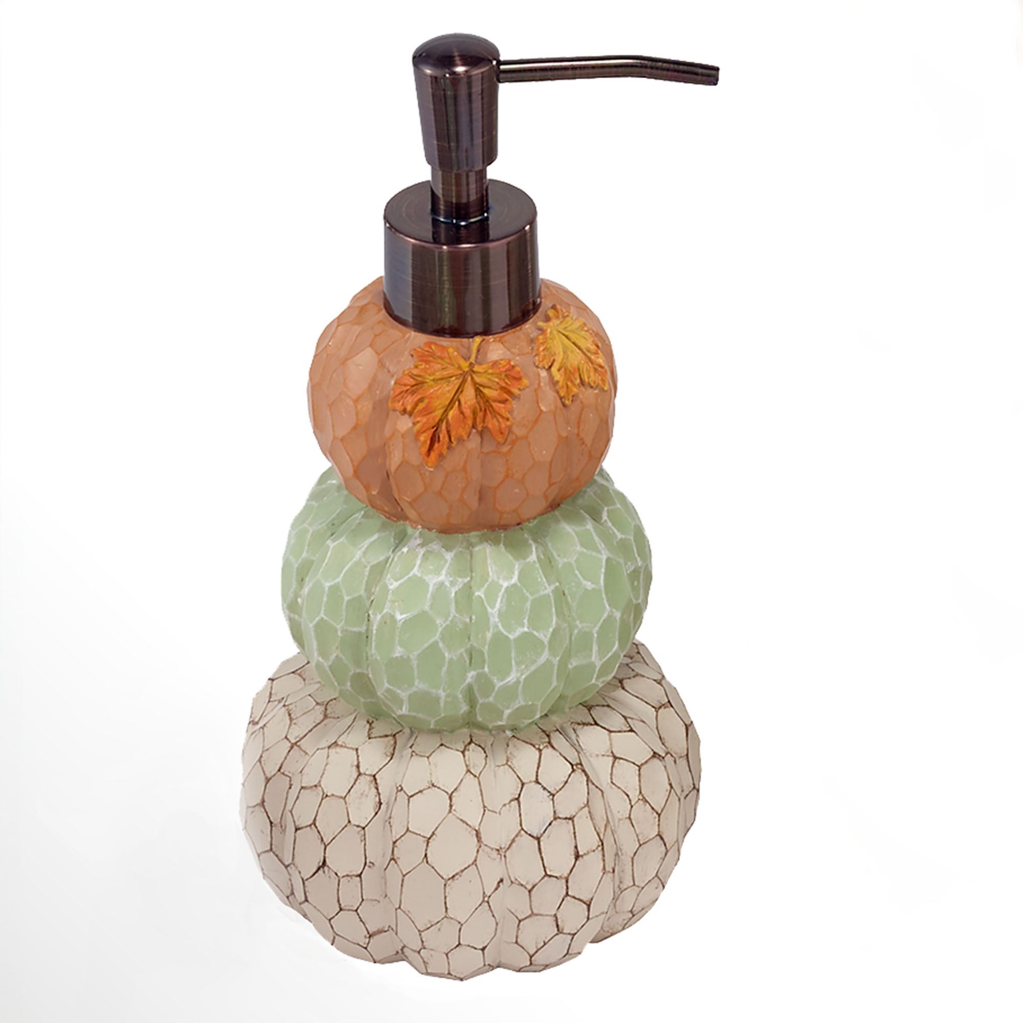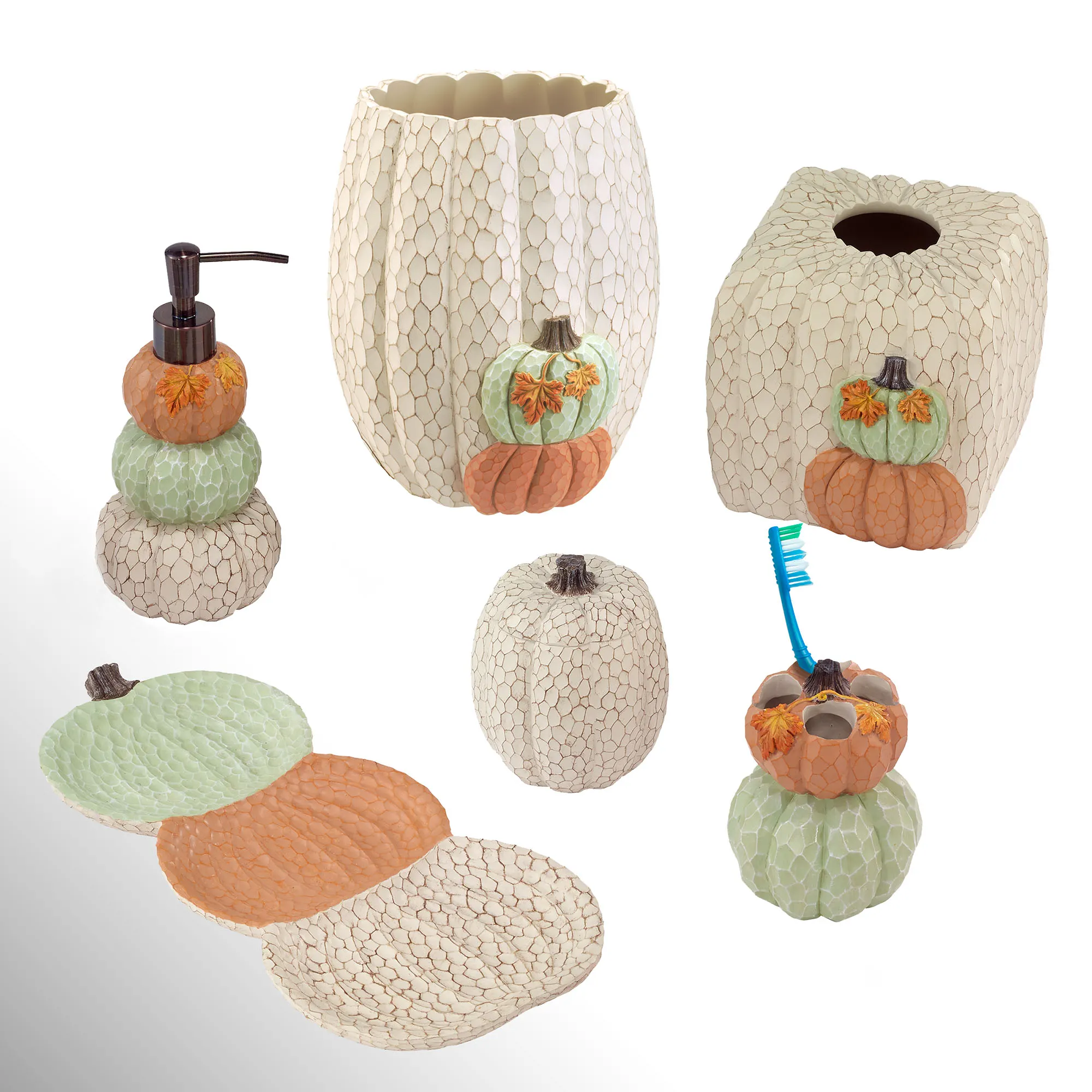 The Grateful Patch Fall Bath Accessories decorate with autumnal splendor. These handpainted, textured resin accessories have crackle designs, and most have a stacked pumpkin design. Ivory items have light brown crackle designs; all others are color-matched. Colors on most include ivory, light green, and orange. Specify Covered Jar, Lotion/Soap Dispenser, Tissue Cover, Toothbrush Holder, Tray, or Wastebasket.