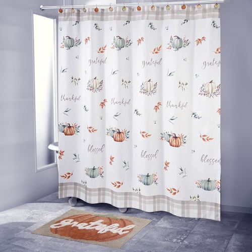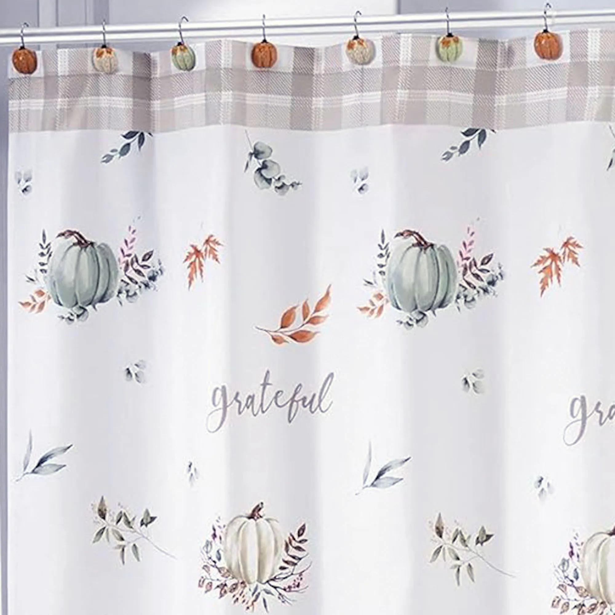 The Grateful Patch Fall Shower Curtain decorates with autumnal splendor. This polyester shower curtain features pumpkins, leaves, script, and a plaid pattern on an ivory background. Script reads "grateful," "thankful," and "blessed." Colors include shades of light orange, light green, and gray. We recommend the use of a waterproof shower curtain liner. Measures 72"Wx72"L. Machine washable. Imported. The resin Grateful Patch Shower Curtain Hooks have textured pumpkins and leaves in handpainted shades of light green, orange, and beige along with silver metal hooks. Each hook measures 1.5"Wx2"Dx1.5"H; hooks are sold as a 12-piece set.