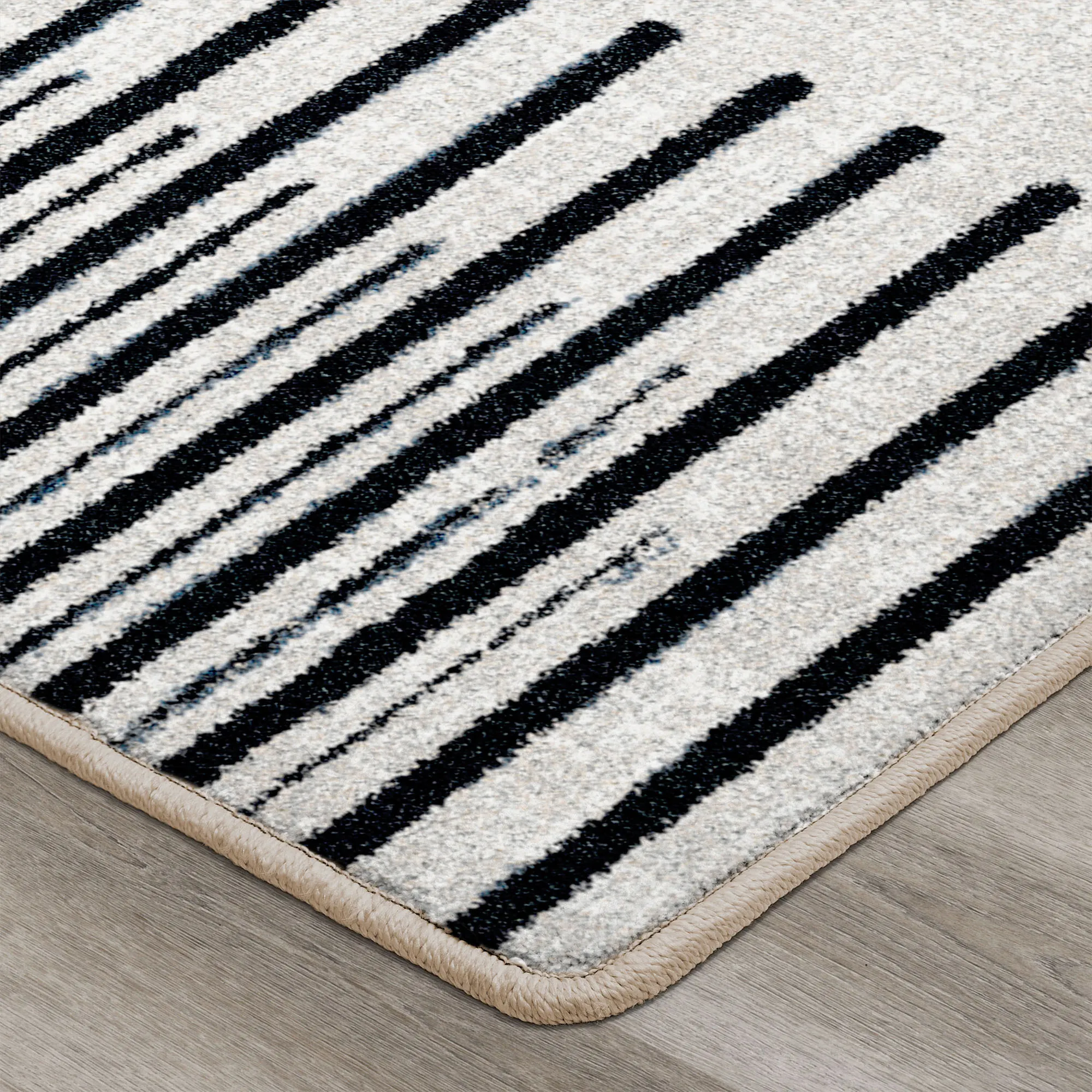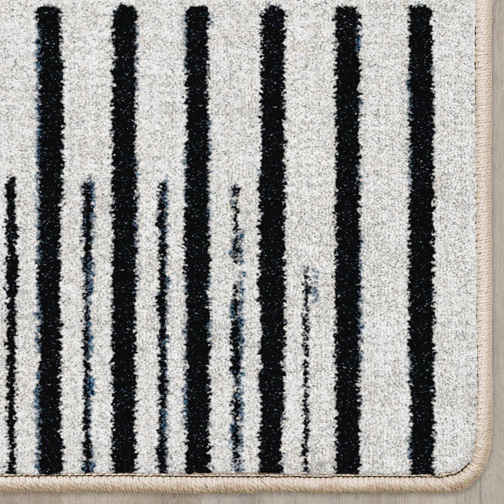 Linear geometrics define the Gridlox Rug with a crisp modern style. Proudly made in the USA, the .375" thick rug features a kid- and pet-friendly, stain- and warp-resistant, and durable power-loomed nylon design backed in a polypropylene/polyester blend. Pops of striking blue enliven the neutral hues of parchment, off-white, ivory, and black. We recommend professional cleaning by a rug cleaner.