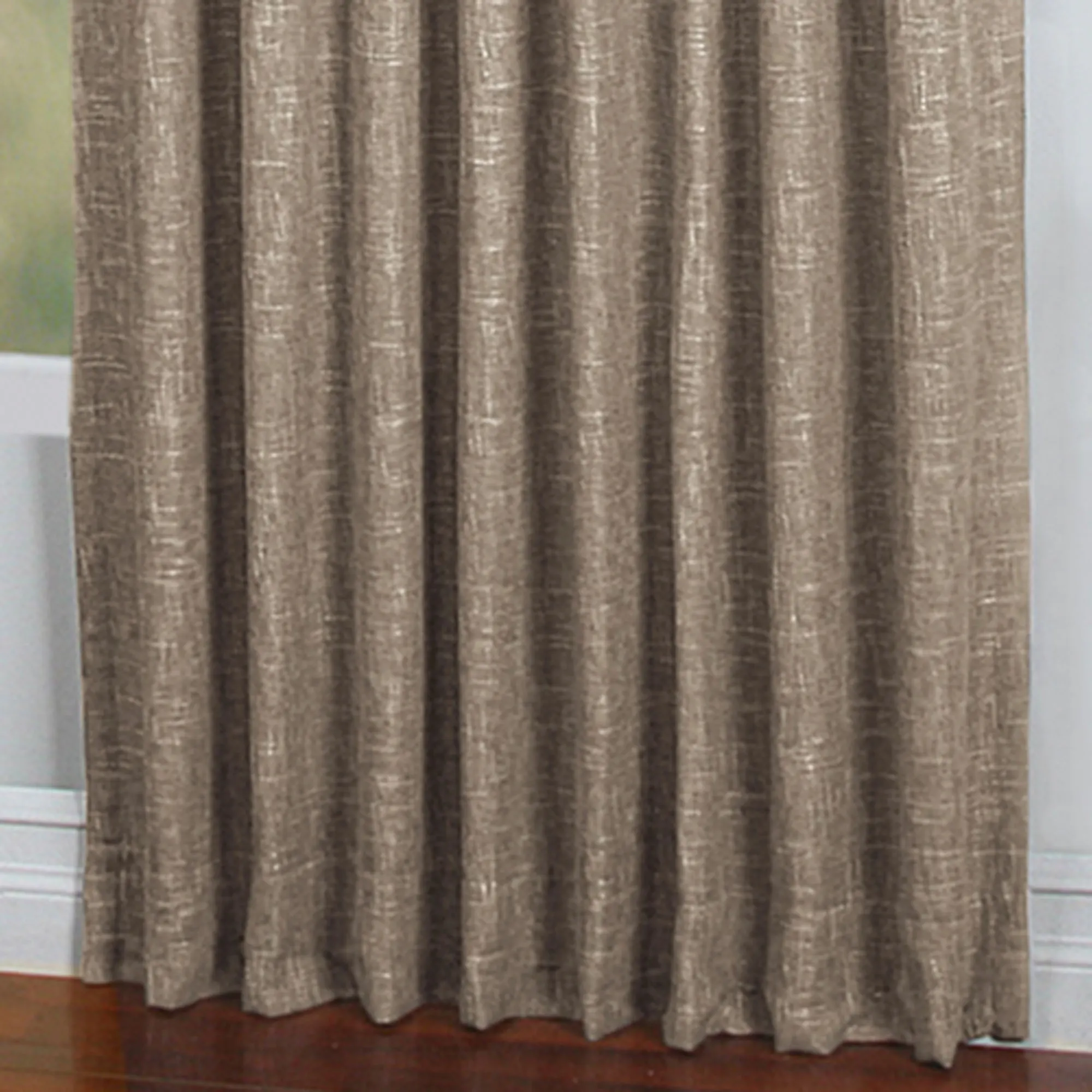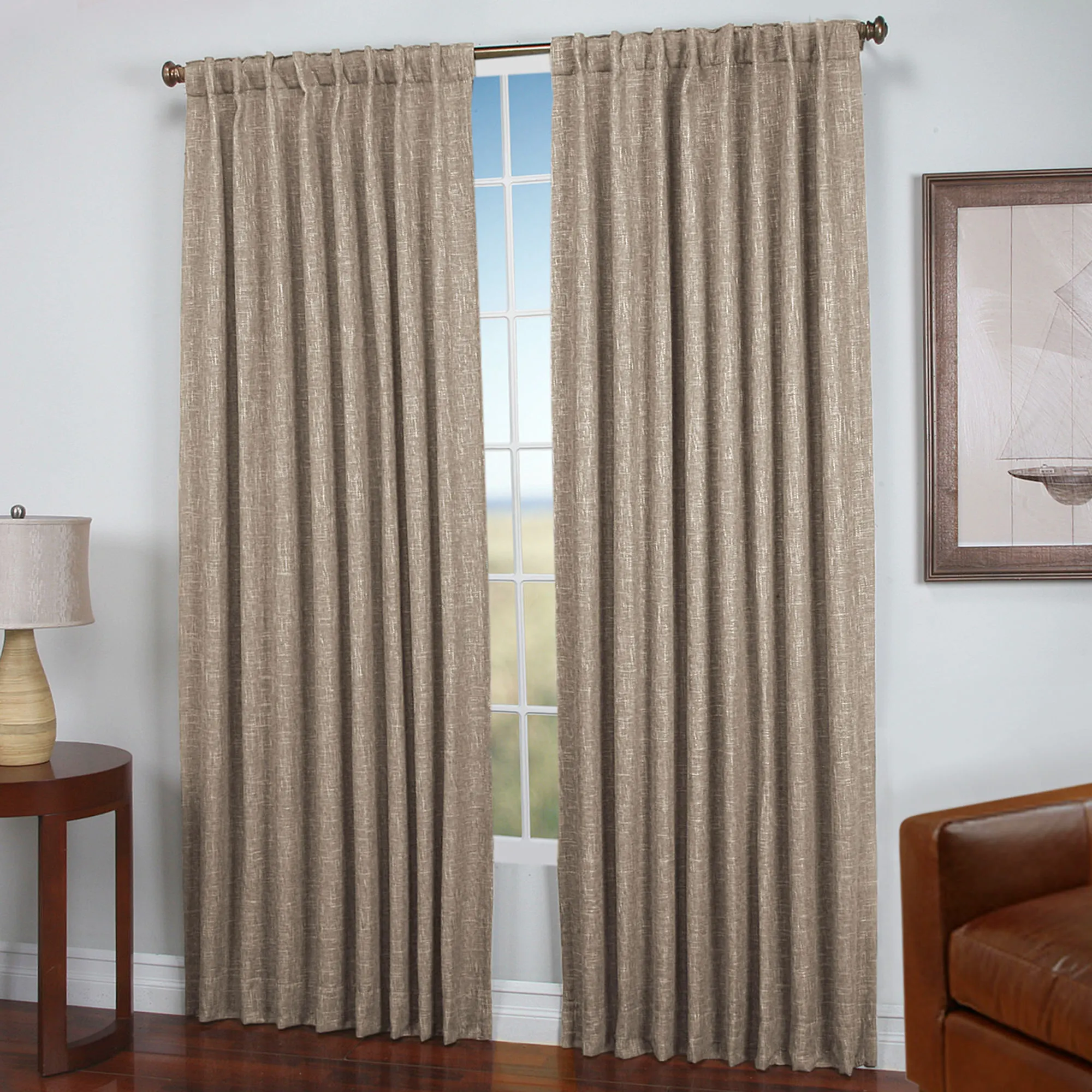 The natural woven fabric of the Griffin Curtain Panel adds a subtle texture to your space. Each lined panel is solid latte polyester for a neutral embellishment. Rod pocket measures 3". Sold individually, the curtain panel has weighted corners and can also hang from the back tabs; each measures 54"W. Machine washable, following manufacturer's instructions. Imported.